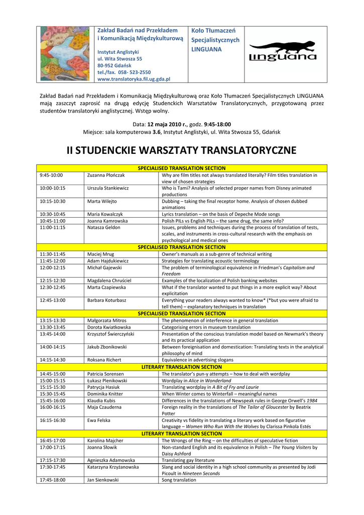 Zakład Badao nad Przekładem i Komunikacją Międzykulturową Instytut Anglistyki ul. Wita Stwosza 55 80-952 Gdaosk tel./fax. 058- 523-2550 www.translatoryka.fil.ug.gda.pl Koło Tłumaczeo Specjalistycznych LINGUANA Zakład Badao nad Przekładem i Komunikacją Międzykulturową oraz Koło Tłumaczeo Specjalistycznych LINGUANA mają zaszczyt zaprosid na drugą edycję Studenckich Warsztatów Translatorycznych, przygotowaną przez studentów translatoryki anglistycznej. Wstęp wolny. Data: 12 maja 2010 r., godz. 9:45-18:00 Miejsce: sala komputerowa 3.6, Instytut Anglistyki, ul. Wita Stwosza 55, Gdaosk II STUDENCKIE WARSZTATY TRANSLATORYCZNE SPECIALISED TRANSLATION SECTION 9:45-10:00 Zuzanna Płooczak Why are film titles not always translated literally? Film titles translation in view of chosen strategies Who is Tami? Analysis of selected proper names from Disney animated productions Dubbing – taking the final receptor home. Analysis of chosen dubbed animations Lyrics translation – on the basis of Depeche Mode songs Polish PILs vs English PILs – the same drug, the same info? Issues, problems and techniques during the process of translation of tests, scales, and instruments in cross-cultural research with the emphasis on psychological and medical ones 10:00-10:15 Urszula Stankiewicz 10:15-10:30 Marta Wilejto 10:30-10:45 10:45-11:00 11:00-11:15 Maria Kowalczyk Joanna Kamrowska Natasza Geldon 11:30-11:45 11:45-12:00 12:00-12:15 Maciej Mrug Adam Hajdukiewicz Michał Gajewski 12:15-12:30 12:30-12:45 Magdalena Chruściel Marta Czapiewska 12:45-13:00 Barbara Koturbasz 13:15-13:30 13:30-13:45 13:45-14:00 Małgorzata Mitros Dorota Kwiatkowska Krzysztof Świerczyoski 14:00-14:15 Jakub Zbonikowski 14:15-14:30 Roksana Richert 14:45-15:00 15:00-15:15 15:15-15:30 15:30-15:45 15:45-16:00 16:00-16:15 Patricia Sorensen Łukasz Plenikowski Patrycja Hasiuk Dominika Knitter Klaudia Kubis Maja Czauderna 16:15-16:30 Ewa Felska 16:45-17:00 17:00-17:15 Karolina Majcher Joanna Słowik 17:15-17:30 17:30-17:45 Agnieszka Adamowska Katarzyna Krzyżanowska 17:45-18:00 Jan Sienkowski SPECIALISED TRANSLATION SECTION Owner’s manuals as a sub-genre of technical writing Strategies for translating acoustic terminology The problem of terminological equivalence in Friedman’s Capitalism and Freedom Examples of the localization of Polish banking websites What if the translator wanted to put things in a more explicit way? About explicitation Everything your readers always wanted to know* (*but you were afraid to tell them) – explanatory techniques in translation SPECIALISED TRANSLATION SECTION The phenomenon of interference in general translation Categorising errors in museum translation Presentation of the conscious translation model based on Newmark’s theory and its practical application Between foreignisation and domestication: Translating texts in the analytical philosophy of mind Equivalence in advertising slogans LITERARY TRANSLATION SECTION The translator’s pun-y attempts – how to deal with wordplay Wordplay in Alice in Wonderland Translating wordplay in A Bit of Fry and Laurie When Winter comes to Winterfall – meaningful names Differences in the translations of Newspeak rules in George Orwell’s 1984 Foreign reality in the translations of The Tailor of Gloucester by Beatrix Potter Creativity vs fidelity in translating a literary work based on figurative language – Women Who Run With the Wolves by Clarissa Pinkola Estés LITERARY TRANSLATION SECTION The Wrongs of the Ring – on the difficulties of speculative fiction Non-standard English and its equivalence in Polish – The Young Visiters by Daisy Ashford Translating gay literature Slang and social identity in a high school community as presented by Jodi Picoult in Nineteen Seconds Song translation