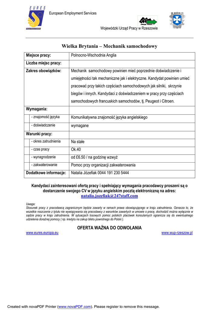 European Employment Services Wojewódzki Urząd Pracy w Rzeszowie Wielka Brytania – Mechanik samochodowy Miejsce pracy: Polnocno-Wschodnia Anglia Liczba miejsc pracy: Zakres obowiązków: Mechanik samochodowy powinien mieć poprzednie doświadczenie i umiejętności tak mechaniczne jak i elektryczne. Kandydat powinien umieć pracować przy takich częściach samochodowych jak silniki, skrzynie biegów i innych. Kandydaci z doświadczeniem w pracy przy częściach samochodowych francuskich samochodów, tj. Peugeot i Citroen. Wymagania: - znajomość języka Komunikatywna znajomość języka angielskiego - doświadczenie wymagane Warunki pracy: - okres zatrudnienia Na stałe - czas pracy Ok.40 - wynagrodzenie od £6.50 / na godzinę wzwyż - zakwaterowanie Pomoc przy organizacji zakwaterowania Dodatkowe informacje: Natalia Józefiak 0044 191 230 5444 Kandydaci zainteresowani ofertą pracy i spełniający wymagania pracodawcy proszeni są o dostarczenie swojego CV w języku angielskim pocztą elektroniczną na adres: [email protected] Uwaga: Stosunek pracy z pracodawcą zagranicznym będzie zawarty w ramach prawa obowiązującego w kraju zatrudnienia. Oznacza to, że wszelkie roszczenie z tytułu nie wywiązywania się pracodawcy z warunków zawartych w umowie o pracę, dochodzić można wyłącznie w sądzie pracy w kraju zatrudnienia. W sytuacjach losowych pomoc polskich placówek konsularnych ogranicza się do ewentualnego udzielenia doraźnej pomocy ( np. kredytu na zakup biletu powrotnego do Polski ). OFERTA WAŻNA DO ODWOŁANIA www.eures.europa.eu Created with novaPDF Printer (www.novaPDF.com). Please register to remove this message. www.wup-rzeszow.pl