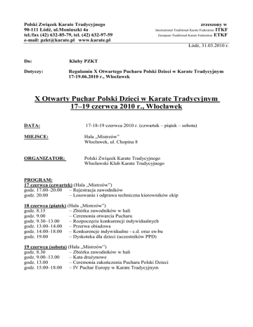 Polski Związek Karate Tradycyjnego 90-111 Łódź, ul.Moniuszki 4a tel./fax (42) 632-85-79, tel. (42) 632-97-59 e-mail: [email protected] www.karate.pl zrzeszony w International Traditional Karate Federation ITKF European Traditional Karate Federation ETKF Łódź, 31.03.2010 r. Do: Kluby PZKT Dotyczy: Regulamin X Otwartego Pucharu Polski Dzieci w Karate Tradycyjnym 17-19.06.2010 r., Włocławek X Otwarty Puchar Polski Dzieci w Karate Tradycyjnym 17–19 czerwca 2010 r., Włocławek DATA: 17-18-19 czerwca 2010 r. (czwartek – piątek – sobota) MIEJSCE: Hala „Mistrzów” Włocławek, ul. Chopina 8 ORGANIZATOR: Polski Związek Karate Tradycyjnego Włocławski Klub Karate Tradycyjnego PROGRAM: 17 czerwca (czwartek) (Hala „Mistrzów”) godz. 17.00–20.00 – Rejestracja zawodników godz. 20.00 – Losowanie i odprawa techniczna kierowników ekip 18 czerwca (piątek) (Hala „Mistrzów”) godz. 8.15 – Zbiórka zawodników w hali godz. 9.00 – Ceremonia otwarcia Pucharu godz. 9.30–13.00 – Rozpoczęcie konkurencji indywidualnych godz. 13.00–14.00 – Przerwa obiadowa godz. 14.00–18.00 – Konkurencje indywidualne - c.d. oraz en-bu godz. 19.00 – Dyskoteka dla dzieci (uczestników PPD) 19 czerwca (sobota) (Hala „Mistrzów”) godz. 8.30 – Zbiórka zawodników w hali godz. 9.00–13.00 – Kata drużynowe godz. 13.00 – Ceremonia zakończenia Pucharu Polski Dzieci godz. 15.00–18.00 – IV Puchar Europy w Karate Tradycyjnym KONKURENCJE: Grupa A (8 lat i młodsi) ur. 2002 i młodsi Grupa B (9, 10 lat) ur. 2001, 2000 Grupa C (11, 12, 13 lat) ur. 1999, '98, '97 Kata ind. chłopców Kata ind. dziewcząt Kata ind. chłopców Kata ind. dziewcząt Kata ind. chłopców Kata ind. dziewcząt w 3 grupach: 9-7 kyu 6-4 kyu 3-1 kyu w 3 grupach: 9-7 kyu 6-4 kyu 3-1 kyu w 3 grupach: 9-7 kyu 6-4 kyu 3-1 kyu Grupa A i Grupa B (10 lat i młodsi) Grupa C (11,12,13 lat) (zespół może być jednorodny - dziewczęta, chłopcy lub mieszany) Kata drużynowe dzieci Kata drużynowe dziewcząt Kata drużynowe chłopców En-bu dziewczyna/chłopiec En-bu chłopiec/chłopiec En-bu dziewczyna/chłopiec En-bu chłopiec/chłopiec PRZEPISY Grupa A (8 lat i młodsi) ur. 2002 i młodsi Kata: Grupa 9-7 kyu: Grupa 6-4 kyu: Grupa 3-1 kyu: Grupa B (9, 10 lat) ur. 2001, 2000 Grupa C (11, 12, 13 lat) ur. 1999, '98, '97 Wykonywane parami, Aka losuje – ocena systemem chorągiewkowym Eliminacje, półfinał i finał: HEIAN 1-2 Eliminacje, półfinał: HEIAN 1-5 finał: HEIAN 4-5 Eliminacje, półfinał: HEIAN 1-5 + BASSAI DAI finał: BASSAI DAI, JION, KANKU DAI, w finale sędzia wybiera kata, dostosowując do niższego stopnia Grupa A i Grupa B ur. 2000 i młodsi Grupa C ur. 1999, '98, '97 Kata drużynowe dzieci: Kata drużynowe dziewcząt, HEIAN 1-3 Kata drużynowe chłopców: wystarczy jedno kata, HEIAN 1-5 w finale z bunkai wystarczy jedno kata, eliminacje – ocena systemem chorągiewkowym w finale z bunkai finały i półfinały (m-ca I-VIII) – ocena systemem punktowym eliminacje – ocena systemem chorągiewkowym finały i półfinały (m-ca I–VIII) – ocena systemem punktowym En-bu dziewczyna/chłopiec i chłopiec/chłopiec: (gong w 55sek.i w 65sek.; poza czasem kara) En-bu dziewczyna/chłopiec i chłopiec/chłopiec: (gong w 55sek.i w 65sek.; poza czasem kara) 1. Ilość zawodników z jednego klubu w jednej konkurencji indywidualnej w danej grupie stopni: bez ograniczeń. 2. Konkurencja zostanie rozegrana przy udziale minimum 4 zawodników lub 4 drużyn. Konkurencja zostanie odwołana, kiedy po upłynięciu terminu zgłoszeń na zawody nie będzie wymaganej liczby zawodników lub drużyn, o czym zainteresowane kluby zostaną powiadomione. 3. Od roku 2009 zawody rozgrywane są w formule międzynarodowej. Do startu w zawodach zostały zaproszone dzieci z federacji członkowskich ITKF. WARUNKI STARTU DLA ZAWODNIKÓW: 1. Odpowiedni wiek: wg wymienionych roczników. 2. Odpowiedni stopień zarejestrowany w PZKT. 3. Zawodnicy w kategorii wiekowej młodzik 11-12-13 lat zobowiązani są posiadać licencję zawodnika uprawniającą do udziału we współzawodnictwie sportowym. W celu przyznania licencji zawodniczej należy przesłać do biura PZKT następujące dokumenty: A/ Wniosek o nadanie licencji zawodnika PZKT (W ORYGINALE); formularz wniosku dostępny jest na stronie internetowej www.karate.pl w zakładce Związek – Druki. UWAGA! Prosimy zwrócić uwagę, aby wniosek został podpisany zarówno przez zawodnika, jak i rodzica/ustawowego przedstawiciela w przeznaczonych do tego miejscach. B/ Kserokopię badań od lekarza ze specjalizacją medycyna sportowa lub z certyfikatem Polskiego Towarzystwa Medycyny Sportowej Licencja zawodnika w roku 2010 (ważna 1 stycznia – 31 grudnia 2010 r.) jest bezpłatna. 4. Aktualne badania lekarskie. Zgodnie z informacją Komisji Medycznej PZKT dzieci startujące w Pucharze Polski Dzieci zobowiązane są posiadać następujące badania lekarskie: I. Z klubów, które mają w swoją działalność wpisaną rekreację jako formę ćwiczenia karate: a) dzieci do 10 roku życia włącznie, bez względu na stopień – zaświadczenie dopuszczające do rekreacyjnego uprawiania karate wydane przez dowolnego lekarza (ważne 1 rok), b) dzieci w wieku 11-12-13 – zaświadczenie od lekarza ze specjalizacją medycyny sportowej lub z certyfikatem Polskiego Towarzystwa Medycyny Sportowej (badania ważne 6 miesięcy); badania do licencji zawodniczej. II. Z klubów, które nie mają w statucie wpisanej rekreacji jako formy ćwiczenia karate: wszystkie dzieci, bez względu na wiek - zaświadczenie od lekarza ze specjalizacją medycyny sportowej lub z certyfikatem Polskiego Towarzystwa Medycyny Sportowej (badania ważne 6 miesięcy). 5. Ubezpieczenie NNW. 6. Posiadanie pisemnej zgody prawnego opiekuna na start w zawodach. 7. Dokonanie opłaty startowej. A/ Zgodnie z uchwałą Zarządu PZKT z dnia 23.01.2009r. wysokość opłaty startowej będzie zróżnicowana w zależności od termi