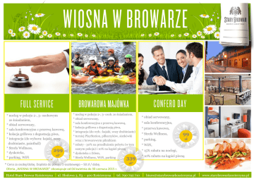 10 * nocleg w pokoju 2-, 3- osobowym ze śniadaniem, * obiad serwowany, * sala konferencyjna z przerwą kawową, * kolacja grillowa z degustacją piwa, * integracja (do wyboru: kajaki, wozy drabiniaste, paintball) * Strefa Wellness, 299 * dyskoteka, zł* * parking, WiFi * nocleg w pokoju 2-, 3- osob. ze śniadaniem, * obiad serwowany, * sala konferencyjna z przerwą kawową, * kolacja grillowa z degustacją piwa, * integracja (do wyb.: kajaki, wozy drabiniaste) * turniej PlayStation, piłkarzyków, siatkówki wraz z browarowym piknikiem * rabaty - 30% na przedłużenie pobytu (w tym samym pokoju) i 10% na kąpiel piwną * dyskoteka z DJem, * Strefa Wellness, WiFi, parking 339 * Cena za osobę/dobę. Dopłata do pokoju 1-osobowego – 50 zł / dobę. Oferta „WIOSNA W BROWARZE” obowiązuje od 04 kwietnia do 30 czerwca 2015 r. Hotel Stary Browar Kościerzyna ul. Słodowa 3, 83 – 400 Kościerzyna * obiad serwowany, * sala konferencyjna, * przerwa kawowa, * Strefa Wellness, 99 * parking, zł * WiFi, * 15% rabatu na noclegi, * 10% rabatu na kąpiel piwną zł* tel. 790 792 710 [email protected] www.starybrowarkoscierzyna.pl