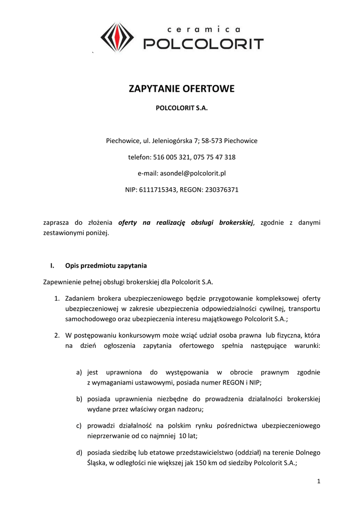 ` ZAPYTANIE OFERTOWE POLCOLORIT S.A. Piechowice, ul. Jeleniogórska 7; 58-573 Piechowice telefon: 516 005 321, 075 75 47 318 e-mail: [email protected] NIP: 6111715343, REGON: 230376371 zaprasza do złożenia oferty na realizację obsługi brokerskiej, zgodnie z danymi zestawionymi poniżej. I. Opis przedmiotu zapytania Zapewnienie pełnej obsługi brokerskiej dla Polcolorit S.A. 1. Zadaniem brokera ubezpieczeniowego będzie przygotowanie kompleksowej oferty ubezpieczeniowej w zakresie ubezpieczenia odpowiedzialności cywilnej, transportu samochodowego oraz ubezpieczenia interesu majątkowego Polcolorit S.A.; 2. W postępowaniu konkursowym może wziąć udział osoba prawna lub fizyczna, która na dzień ogłoszenia zapytania ofertowego spełnia następujące warunki: a) jest uprawniona do występowania w obrocie prawnym z wymaganiami ustawowymi, posiada numer REGON i NIP; zgodnie b) posiada uprawnienia niezbędne do prowadzenia działalności brokerskiej wydane przez właściwy organ nadzoru; c) prowadzi działalność na polskim rynku pośrednictwa ubezpieczeniowego nieprzerwanie od co najmniej 10 lat; d) posiada siedzibę lub etatowe przedstawicielstwo (oddział) na terenie Dolnego Śląska, w odległości nie większej jak 150 km od siedziby Polcolorit S.A.; 1 ` e) posiada doświadczenie w ubezpieczaniu podmiotów produkcyjnych tj. prowadzi obsługę brokerską kompleksowego ubezpieczenia dla co najmniej 3 podmiotów nieprzerwanie przez okres co najmniej 3 lat; f) dysponuje odpowiednim potencjałem kadrowym tj. zatrudnia na podstawie umowy o pracę i/lub stosunku cywilnoprawnego co najmniej 5 osób posiadających uprawnienia do wykonywania czynności brokerskich (osoby legitymujące się zdanym egzaminem przed Komisją Egzaminacyjną dla Brokerów Ubezpieczeniowych); g) posiada ubezpieczenie odpowiedzialności cywilnej z tytułu prowadzenia działalności brokerskiej zgodnie z Rozporządzeniem Ministra Finansów z dnia 24 czerwca 2005 roku w sprawie obowiązkowego ubezpieczenia odpowiedzialności cywilnej z tytułu wykonywania działalności brokerskiej (Dz.U. z 2005 Nr 122, poz. 1028 z późn. zm.); h) znajduje się w sytuacji finansowej zapewniającej realizację umowy; i) nie zalega w płaceniu składek na ubezpieczenie społeczne i zdrowotne oraz nie zalega w płaceniu podatków i opłat publicznoprawnych; j) nie była skazana prawomocnym wyrokiem za popełnione przestępstwo przeciwko mieniu, obrotowi gospodarczemu, papierom wartościowym lub karno-skarbowe. II. Termin i miejsce składania ofert Termin realizacji usługi: nieprzerwanie przez okres 36 miesięcy od dnia zawarcia umowy. Miejsce realizacji usługi: 58-573 Piechowice. III. Zawartość oferty Oferta powinna zawierać, co najmniej: a) propozycję możliwości obniżenia kosztów ubezpieczenia Polcolorit S.A.; b) listę referencyjną podmiotów ubezpieczanych ze szczególnym uwzględnieniem podmiotów z terenu powiatu jeleniogórskiego i ościennych; c) oświadczenie o liczbie osób zatrudnionych u Oferenta, w tym: posiadających uprawnienia do wykonywania czynności brokerskich zgodnie z wymaganiami ustawy o pośrednictwie ubezpieczeniowym, 2 ` pozostałych pracowników. d) oświadczenie dotyczące dostępności serwisu brokerskiego w zakresie obsługi umów ubezpieczeniowych oraz nadzoru na likwidacją szkód, a w nim: informacja o liczbie osób zatrudnionych u Oferenta, które będą bezpośrednio na terenie Jeleniej Góry i okolicy prowadziły obsługę Zamawiającego czas realizacji od momentu pozyskania informacji o zdarzeniu, z którego wynika obowiązek podjęcia przez brokera działania projekt umowy brokerskiej e) zezwolenie - decyzję na wykonywanie działalności brokerskiej w zakresie ubezpieczeń wydane przez właściwy organ nadzoru; f) aktualną polisę ubezpieczeniową odpowiedzialności cywilnej z tytułu prowadzenia działalności brokerskiej, g) aktualny odpis z właściwego rejestru lub zaświadczenie o wpisie do ewidencji działalności gospodarczej oraz dokument potwierdzający nadanie NIP oraz REGON; h) oświadczenie oferenta lub zaświadczenie z właściwego organu podatkowego potwierdzającego, że nie zalega z opłacaniem podatków, lub że uzyskał zgodę na zwolnienie, odroczenie lub rozłożenie na raty zaległych płatności, i) oświadczenie oferenta lub zaświadczenie z właściwego oddziału Zakładu Ubezpieczeń Społecznych potwierdzającego, że nie zalega z opłacaniem składek na ubezpieczenie społeczne, lub że uzyskał zgodę na zwolnienie, odroczenie lub rozłożenie na raty zaległych płatności, Dodatkowo: 1. Wykonawca powinien sporządzić ofertę na stosowanym przez siebie formularzu ofertowym. 2. Oferta powinna być sporządzona w języku polskim, pismem komputerowym. 3. Oferta musi zawierać nazwę i adres. IV. Kryteria wyboru oferty Jako kryteria wyboru ofert stosowana będzie następująca waga pkt: Propozycję możliwości obniżenia kosztów ubezpieczenia Polcolorit S.A. - 40 pkt Oświadczenie dotyczące dostępności serwisu brokerskiego w zakresie obsługi umów ubezpieczeniowych oraz nadzoru na likwidacją szkód, a w nim: 3 ` - informacja o liczbie osób zatrudnionych u Oferenta , które będą bezpośrednio na terenie Jeleniej Góry i okolicy prowadziły obsługę Zamawiającego – 15 pkt - czas realizacji od momentu pozyskania informacji o zdarzeniu, z którego wynika obowiązek podjęcia przez brokera działania – 15 pkt Lista referencyjna podmiotów ubezpieczanych ze szczególnym uwzględnieniem podmiotów produkcyjnych -10 pkt Liczba osób zatrudnionych u Oferenta posiadających uprawnienia do wykonywania czynności brokerskich zgodnie z wymaganiami ustawy o pośrednictwie ubezpieczeniowym – 10 pkt Doświadczenie (staż pracy) Oferenta w zawodzie brokera – 5 pkt Referencje – 5 pkt Maksymalna ilość punktów 100 V. Miejsce, sposób i termin składania oferty 1. Ofertę można złożyć osobiście w siedzibie Zamawiającego, faksem lub elektronicznie 