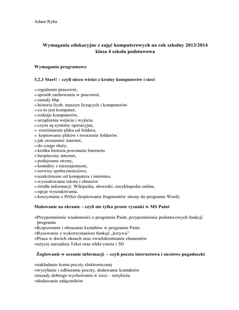 Adam Ryba Wymagania edukacyjne z zajęć komputerowych na rok szkolny 2013/2014 klasa 4 szkoła podstawowa Wymagania programowe 3,2,1 Start! – czyli nieco wieści z krainy komputerów i sieci regulamin pracowni, sposób zachowania w pracowni, zasady bhp. historia liczb, maszyn liczących i komputerów. co to jest komputer, rodzaje komputerów, urządzenia wejścia i wyjścia. czym są systemy operacyjne, rozróżnienie pliku od folderu, kopiowanie plików i tworzenie folderów. jak zrozumieć internet, do czego służy, krótka historia powstania Internetu bezpieczny internet, podejrzane strony, kontakty z nieznajomymi, serwisy społecznościowe, • uzależnienie od komputera i internteu. • wyszukiwanie tekstu i obrazów • źródła informacji: Wikipedia, słowniki, encyklopedia online, • opcje wyszukiwania. • korzystanie z PrtScr (kopiowanie fragmentów strony do programu Word). • • • • • • • • • • • • • • • • • Malowanie na ekranie – czyli nie tylko proste rysunki w MS Paint • Przypomnienie wiadomości o programie Paint, przypomnienie podstawowych funkcji programu • Kopiowanie i obracanie kształtów w programie Paint. • Rysowanie z wykorzystaniem funkcji „krzywa” • Praca w dwóch oknach oraz zwielokrotnianie elementów • użycie narzędzia Tekst oraz efekt cienia i 3D Żeglowanie w oceanie informacji – czyli poczta internetowa i sieciowe pogaduszki • zakładanie konta poczty elektronicznej • wysyłanie i odbieranie poczty, dodawanie kontaktów • zasady dobrego wychowania w sieci – netykieta • dodawanie załączników • sposoby komunikacji w internecie (poczta, czaty internetowe, komunikatory) Uczeń może otrzymać następujące oceny jeżeli: • celującą, jeżeli wykracza poza wymagania stawiane przy ocenie bardzo dobrej. Posługuje się zdobytymi wiadomościami w rozwiązywaniu różnych problemów, proponuje rozwiązania nietypowe, • bardzo dobrą, jeżeli opanował pełny zakres wiedzy i umiejętności określony programem w danej klasie i wykorzystuje zdobytą wiedzę do rozwiązywania zadań i problemów w nowych sytuacjach, • dobrą, jeżeli opanował wiedzę określoną programem nauczania, ale nie zawsze potrafi ją wykorzystać do rozwiązywania zadań praktycznych, • dostateczną, jeżeli nie opanował w pełni wiadomości określonych programem nauczania i ma trudności z rozwiązywaniem praktycznych zadań z informatyki, • dopuszczającą, jeżeli opanował wiadomości i umiejętności na poziomie elementarnymi wykonuje proste polecenia i zadania często przy pomocy nauczyciela, • niedostateczną, jeżeli nie opanował wiadomości i umiejętności zawartych w programie nauczania, a braki te uniemożliwiają dalsze zdobywanie wiedzy z tego przedmiotu. Uwagi: Należy bardzo wyraźnie zaakcentować rewalidacyjną funkcję oceny. Nauczyciel musi poznać możliwości dziecka i przyjąć je za punkt wyjścia do formułowania oceny. Oczekiwania w stosunku do dziecka powinny zależeć od jego intelektualnych możliwości. Zadaniem nauczyciela jest stworzenie takich warunków dla ucznia aby w maksymalnym stopniu wykorzystał swój potencjał umysłowy. Klasa 6 2013/2014 Informatyka Szczegółowe kryteria oceniania Bezpieczna i higieniczna praca z komputerem Obszary zastosowań komputerów Ocena celująca • Bezpiecznie zachowuje się w pracowni informatyki • Zna i rozumie regulamin pracowni • Podczas pracy przy komputerze świadomie zachowuje prawidłową postawę • Zna i wymienia wiele obszarów zastosowań komputerów • Potrafi dostrzec plusy i minusy wykorzystywania komputerów do pracy • Wymienia sytuacje, w których się zetknął z komputerami w swoim otoczeniu Ocena bardzo dobra • Bezpiecznie zachowuje się w pracowni informatyki • Zna regulamin pracowni • Podczas pracy przy komputerze zachowuje prawidłową postawę • Zna i wymienia wiele obszarów zastosowań komputerów • Potrafi dostrzec plusy wykorzystywania komputerów do pracy • Wymienia sytuacje, w których się zetknął z komputerami w swoim otoczeniu Ocena dobra • Bezpiecznie zachowuje się w pracowni informatyki • Zna regulamin pracowni • Podczas pracy przy komputerze zachowuje prawidłową postawę • Zna i wymienia kilka obszarów zastosowań komputerów • Wymienia sytuacje, w których się zetknął z komputerami w swoim otoczeniu Ocena dostateczna • Bezpiecznie zachowuje się w pracowni informatyki • Podczas pracy przy komputerze zachowuje prawidłową postawę • Z pomocą nauczyciela wymienia kilka obszarów zastosowań komputerów • Wymienia sytuacje, w których się zetknął z komputerami w swoim otoczeniu Ocena dopuszczająca • Wymaga ciągłej uwagi nauczyciela w celu zapewnienia pełnego bezpieczeństwa • Z pomocą nauczyciela wymienia kilka obszarów zastosowań komputerów Nazwy i funkcje najważniejszych części zestawu komputerowego Komunikowanie się z komputerem Ocena celująca • Nazywa i potrafi napisać części zestawu komputerowego (monitor, klawiatura, myszka, drukarka, słuchawki, głośniki) i wytłumaczy ich funkcje • Potrafi podłączyć w/w urządzenia do komputera • Poprawnie uruchomi i wyłączy komputer • Zaloguje się do sieci szkolnej na swoje konto • Operuje zwrotami: włącz, wyłącz, zaloguj się, wyloguj się, kliknij, zamknij, otwórz Ocena bardzo dobra • Nazywa części zestawu komputerowego (monitor, klawiatura, myszka, drukarka, słuchawki, głośniki) i wytłumaczy ich funkcje • Potrafi podłączyć w/w do komputera monitor klawiaturę i myszkę • Poprawnie uruchomi i wyłączy komputer • Zaloguje się do sieci szkolnej na swoje konto • Operuje zwrotami: włącz, wyłącz, zaloguj się, wyloguj się, kliknij, zamknij, otwórz Ocena dobra • Nazywa części zestawu komputerowego (monitor, klawiatura, myszka, drukarka, słuchawki, głośniki) • Potrafi podłączyć w/w do komputera monitor klawiaturę i myszkę • Popr
