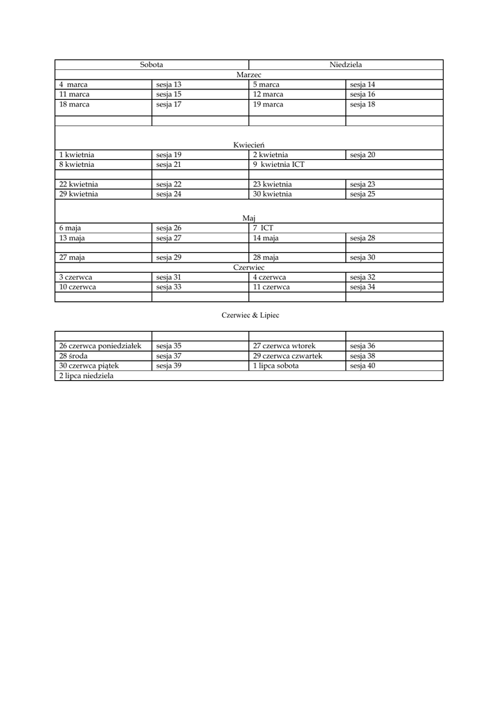 Sobota 4 marca 11 marca 18 marca sesja 13 sesja 15 sesja 17 1 kwietnia 8 kwietnia sesja 19 sesja 21 22 kwietnia 29 kwietnia sesja 22 sesja 24 6 maja 13 maja sesja 26 sesja 27 27 maja sesja 29 3 czerwca 10 czerwca sesja 31 sesja 33 Niedziela Marzec 5 marca 12 marca 19 marca Kwiecień 2 kwietnia 9 kwietnia ICT 23 kwietnia 30 kwietnia Maj 7 ICT 14 maja 28 maja Czerwiec 4 czerwca 11 czerwca sesja 14 sesja 16 sesja 18 sesja 20 sesja 23 sesja 25 sesja 28 sesja 30 sesja 32 sesja 34 Czerwiec & Lipiec 26 czerwca poniedziałek 28 środa 30 czerwca piątek 2 lipca niedziela sesja 35 sesja 37 sesja 39 27 czerwca wtorek 29 czerwca czwartek 1 lipca sobota sesja 36 sesja 38 sesja 40