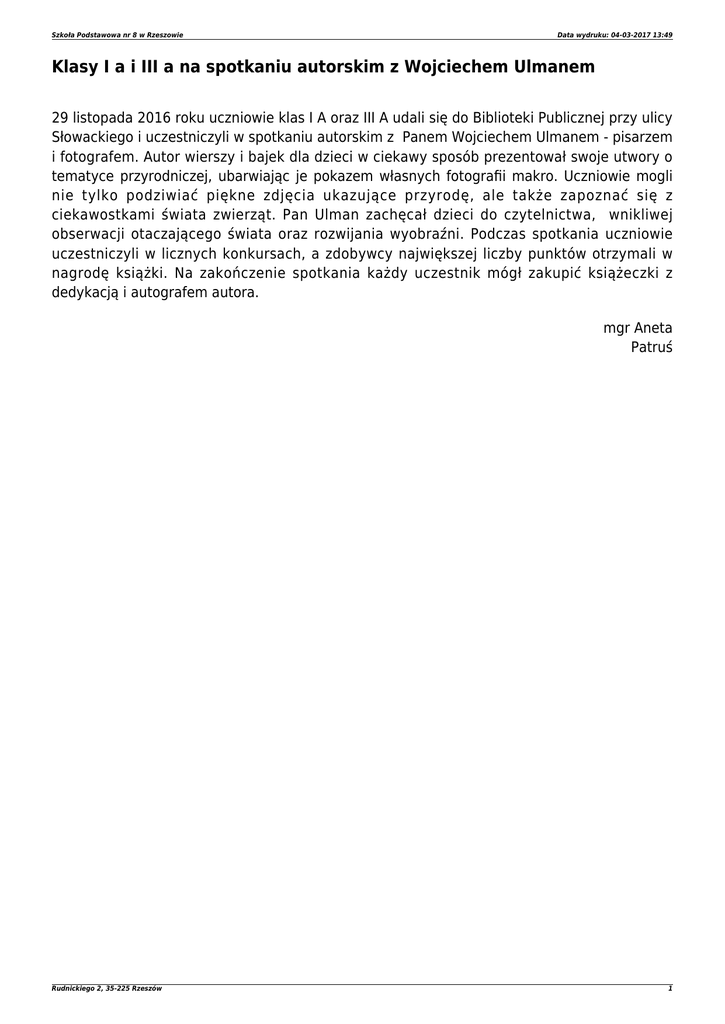 Szkoła Podstawowa nr 8 w Rzeszowie Data wydruku: 04-03-2017 13:49 Klasy I a i III a na spotkaniu autorskim z Wojciechem Ulmanem 29 listopada 2016 roku uczniowie klas I A oraz III A udali się do Biblioteki Publicznej przy ulicy Słowackiego i uczestniczyli w spotkaniu autorskim z Panem Wojciechem Ulmanem - pisarzem i fotografem. Autor wierszy i bajek dla dzieci w ciekawy sposób prezentował swoje utwory o tematyce przyrodniczej, ubarwiając je pokazem własnych fotografii makro. Uczniowie mogli nie tylko podziwiać piękne zdjęcia ukazujące przyrodę, ale także zapoznać się z ciekawostkami świata zwierząt. Pan Ulman zachęcał dzieci do czytelnictwa, wnikliwej obserwacji otaczającego świata oraz rozwijania wyobraźni. Podczas spotkania uczniowie uczestniczyli w licznych konkursach, a zdobywcy największej liczby punktów otrzymali w nagrodę książki. Na zakończenie spotkania każdy uczestnik mógł zakupić książeczki z dedykacją i autografem autora. mgr Aneta Patruś Rudnickiego 2, 35-225 Rzeszów 1