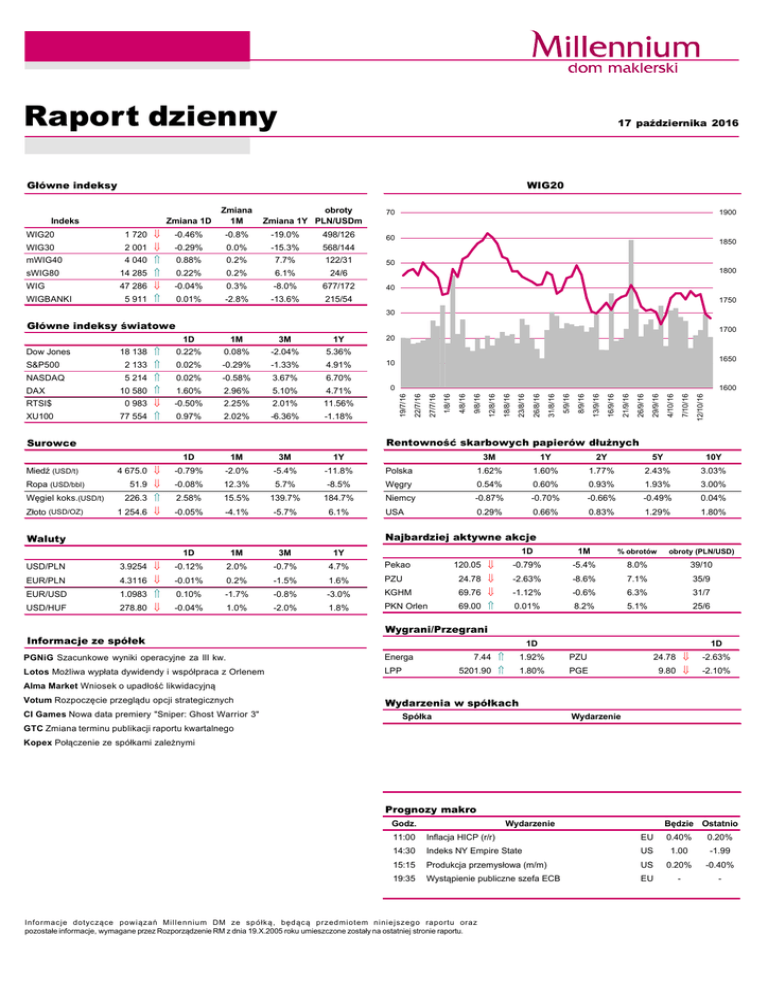 Raport dzienny 17 października 2016 Gł•wne indeksy WIG20 Indeks Zmiana 1D Zmiana 1M obroty Zmiana 1Y PLN/USDm WIG20 1 720 -0.46% -0.8% -19.0% 498/126 WIG30 -0.29% 0.0% -15.3% 568/144 mWIG40 2 001 4 040 0.88% 0.2% 7.7% 122/31 sWIG80 14 285 0.22% 0.2% 6.1% 24/6 WIG 47 286 -0.04% 0.3% -8.0% 677/172 5 911 0.01% -2.8% -13.6% 215/54 WIGBANKI 70 1900 60 1850 50 1800 40 1750 30 Gł•wne indeksy światowe 1700 1650 10 5 214 0.02% -0.58% 3.67% 6.70% 10 580 1.60% 2.96% 5.10% 4.71% RTSI$ 0 983 -0.50% 2.25% 2.01% 11.56% XU100 77 554 0.97% 2.02% -6.36% -1.18% 1D 1M 3M 1Y 4 675.0 -0.79% -2.0% -5.4% -11.8% Polska Ropa (USD/bbl) Węgiel koks.(USD/t) Złoto (USD/OZ) 7/10/16 12/10/16 4/10/16 29/9/16 26/9/16 21/9/16 16/9/16 8/9/16 13/9/16 5/9/16 1600 Rentowność skarbowych papier•w dłużnych Surowce Miedź (USD/t) 0 31/8/16 DAX 26/8/16 4.91% 23/8/16 5.36% -1.33% 18/8/16 -2.04% -0.29% 9/8/16 0.08% 0.02% 12/8/16 0.22% 2 133 4/8/16 18 138 20 19/7/16 NASDAQ 1Y 1/8/16 S&P500 3M 27/7/16 Dow Jones 1M 22/7/16 1D 3M 1Y 2Y 5Y 10Y 1.62% 1.60% 1.77% 2.43% 3.03% 51.9 -0.08% 12.3% 5.7% -8.5% Węgry 0.54% 0.60% 0.93% 1.93% 3.00% 226.3 2.58% 15.5% 139.7% 184.7% Niemcy -0.87% -0.70% -0.66% -0.49% 0.04% 1 254.6 -0.05% -4.1% -5.7% 6.1% USA 0.29% 0.66% 0.83% 1.29% 1.80% 1D 1M 3M 1Y Najbardziej aktywne akcje Waluty 1D 1M % obrot€w obroty (PLN/USD) 120.05 -0.79% -5.4% 8.0% 39/10 PZU 24.78 -2.63% -8.6% 7.1% 35/9 -3.0% KGHM 69.76 -1.12% -0.6% 6.3% 31/7 1.8% PKN Orlen 69.00 0.01% 8.2% 5.1% 25/6 USD/PLN 3.9254 -0.12% 2.0% -0.7% 4.7% Pekao EUR/PLN 4.3116 -0.01% 0.2% -1.5% 1.6% EUR/USD 1.0983 0.10% -1.7% -0.8% USD/HUF 278.80 -0.04% 1.0% -2.0% Wygrani/Przegrani Informacje ze sp•łek 1D PGNiG Szacunkowe wyniki operacyjne za III kw. Energa Lotos Możliwa wypłata dywidendy i wsp‚łpraca z Orlenem LPP 1D 7.44 1.92% PZU 24.78 -2.63% 5201.90 1.80% PGE 9.80 -2.10% Alma Market Wniosek o upadłość likwidacyjną Votum Rozpoczęcie przeglądu opcji strategicznych CI Games Nowa data premiery "Sniper: Ghost Warrior 3" Wydarzenia w sp•łkach Sp€łka Wydarzenie GTC Zmiana terminu publikacji raportu kwartalnego Kopex Połączenie ze sp‚łkami zależnymi Prognozy makro Godz. Wydarzenie Będzie Ostatnio 11:00 Inflacja HICP (r/r) EU 0.40% 14:30 Indeks NY Empire State US 1.00 -1.99 15:15 Produkcja przemysłowa (m/m) US 0.20% -0.40% 19:35 Wystąpienie publiczne szefa ECB EU - - Informacje dotyczące powiązań Millennium DM ze sp‚łką, będącą przedmiotem niniejszego raportu oraz pozostałe informacje, wymagane przez Rozporządzenie RM z dnia 19.X.2005 roku umieszczone zostały na ostatniej stronie raportu. 0.20% Informacje ze sp•łek PGNiG Szacunkowe wyniki operacyjne za III kw. Szacowany wolumen sprzedaży gazu ziemnego przez grupę PGNiG w III kw. 2016 r. wyni‚sł 4.27 mld m3 wobec 3.94 mld m3 w analogicznym okresie poprzedniego roku. Wydobycie gazu w III kw. kwartale wyniosło 1.04 mld m3 wobec 1.14 mld m3 przed rokiem. Import gazu ziemnego wyni‚sł 3.02 mld m3 wobec 2.40 mld m3 rok wcześniej, w tym import "z kierunku wschodniego" wyni‚sł 2.43 mld m3 wobec 2.33 mld m3 w III kwartale 2015 roku. Wydobycie ropy spadło do 298 tys. ton. z 367 tys. ton w III kw. 2015 roku, a sprzedaż ropy naftowej spadła do 287 tys. ton z 356 tys. ton. Lotos Możliwa wypłata dywidendy i wsp€łpraca z Orlenem Prezes Grupy Lotos Robert Pietryszyn stwierdził, że Grupa Lotos "poważnie myśli" o powrocie do wypłacania dywidendy, jest także zainteresowana wsp‚łpracą z PKN Orlen np. w zakresie logistyki i zakup‚w. Alma Market Wniosek o upadłość likwidacyjną Zarząd Alma Market złożył do Sądu Rejonowego w Krakowie wniosek o ogłoszenie upadłości obejmującej likwidację majątku w związku z tym, że postępowanie sanacyjne nie zostało otwarte w terminie trzydziestu dni od dnia złożenia wniosku. Jednocześnie sp‚łka podtrzymuje złożony wcześniej wniosek o otwarcie postępowania sanacyjnego. Votum Rozpoczęcie przeglądu opcji strategicznych Votum zdecydowało o rozpoczęciu przeglądu opcji strategicznych we wszystkich obszarach działalności. Sp‚łka bierze pod uwagę r‚żne opcje, w tym poszukiwanie inwestora branżowego lub finansowego. Sp‚łka podała, że jej akcjonariusz, posiadający bezpośrednio i pośrednio 53.42% akcji, ma wstępne, niewiążące zainteresowanie nabyciem tego pakietu przez potencjalnego inwestora. Sp‚łka podała, że w ramach przeglądu opcji strategicznych planuje udzielić wybranym inwestorom zgody na przeprowadzenie due diligence. CI Games Nowa data premiery "Sniper: Ghost Warrior 3" Zarząd sp‚łki CI Games informuje, że w dniu 17 października 2016 r. podjął decyzję o ustaleniu nowej daty premiery gry "Sniper: Ghost Warrior 3" na dzień 4 kwietnia 2017 r. Data premiery będzie jednolita dla wszystkich obszar‚w dystrybucji na świecie. Gra SGW3 zostanie wydana r‚wnocześnie na platformy PC, Xbox One oraz Playstation 4. GTC Zmiana terminu publikacji raportu kwartalnego Sp‚łka poinformowała o przesunięciu terminu publikacji skonsolidowanego raportu kwartalnego za trzeci kwartał br. na 28 listopada (z 14 listopada) 2016 roku Kopex Połączenie ze sp€łkami zależnymi Sp‚łka poinformowała o zamiarze połączenia KOPEX S.A. (Sp‚łka Przejmująca) z czterema sp‚łkami 100% zależnymi: KOPEX MACHINERY S.A., ZABRZAŃSKIMI ZAKŁADAMI MECHANICZNYMI - MASZYNAMI G‹RNICZYMI SP. Z O.O., FABRYKĄ MASZYN I URZĄDZEŃ TAGOR S.A. oraz KOPEX HYDRAULIKĄ SIŁO. Pakiety Mirbud Jerzy Mirgos poinformował o dokonanych w dniu 14 października br. zakupach łącznie 48,757 akcji po średniej cenie jednostkowej 0.74 PLN Millennium Dom Maklerski S.A. ul. Żaryna 2A, 02-593 Warszawa Telefon: (022) 598 26 00 2 Millennium Dom Maklerski S.A. ul. Żaryna 2A, 02-593 Warszawa Telefon: (022) 598 26 00 850 0 800 13/10/16 10000 10/10/16 30000 5/10/16 40000 30/9/16 50000 27/9/16 60000 22/9/16 1050 19/9/16 70000 8/9/16 RTSI$ 5/9/16 4500 1200 1000 1000 950 900 200 0 12/10/16 7/10