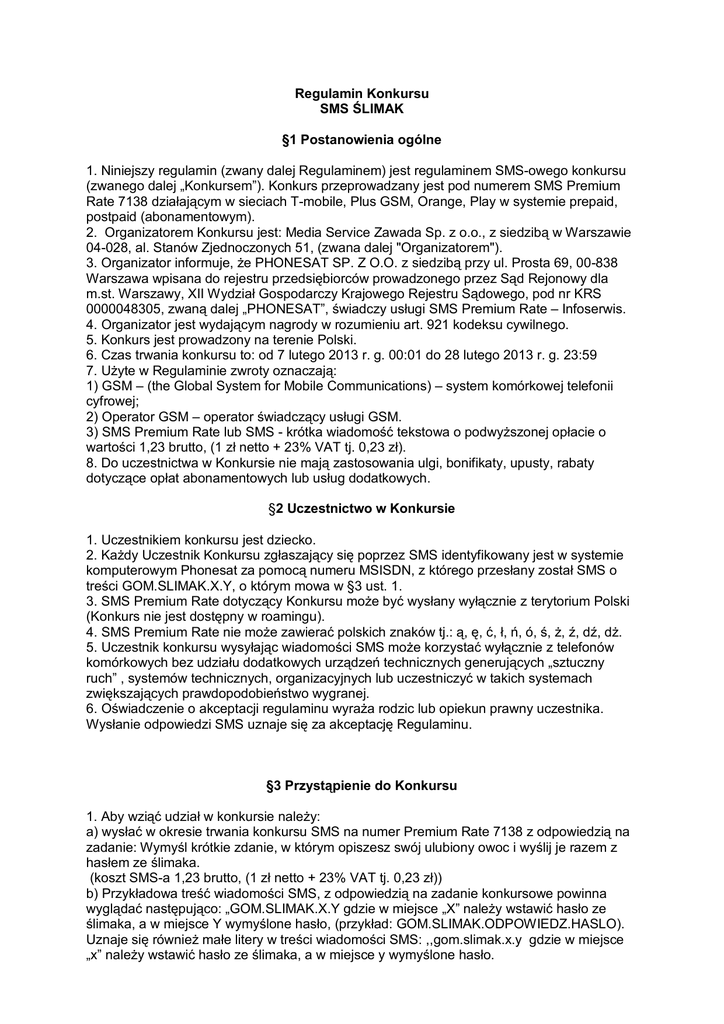 Regulamin Konkursu SMS ŚLIMAK §1 Postanowienia ogólne 1. Niniejszy regulamin (zwany dalej Regulaminem) jest regulaminem SMS-owego konkursu (zwanego dalej „Konkursem”). Konkurs przeprowadzany jest pod numerem SMS Premium Rate 7138 działającym w sieciach T-mobile, Plus GSM, Orange, Play w systemie prepaid, postpaid (abonamentowym). 2. Organizatorem Konkursu jest: Media Service Zawada Sp. z o.o., z siedzibą w Warszawie 04-028, al. Stanów Zjednoczonych 51, (zwana dalej "Organizatorem"). 3. Organizator informuje, że PHONESAT SP. Z O.O. z siedzibą przy ul. Prosta 69, 00-838 Warszawa wpisana do rejestru przedsiębiorców prowadzonego przez Sąd Rejonowy dla m.st. Warszawy, XII Wydział Gospodarczy Krajowego Rejestru Sądowego, pod nr KRS 0000048305, zwaną dalej „PHONESAT”, świadczy usługi SMS Premium Rate – Infoserwis. 4. Organizator jest wydającym nagrody w rozumieniu art. 921 kodeksu cywilnego. 5. Konkurs jest prowadzony na terenie Polski. 6. Czas trwania konkursu to: od 7 lutego 2013 r. g. 00:01 do 28 lutego 2013 r. g. 23:59 7. Użyte w Regulaminie zwroty oznaczają: 1) GSM – (the Global System for Mobile Communications) – system komórkowej telefonii cyfrowej; 2) Operator GSM – operator świadczący usługi GSM. 3) SMS Premium Rate lub SMS - krótka wiadomość tekstowa o podwyższonej opłacie o wartości 1,23 brutto, (1 zł netto + 23% VAT tj. 0,23 zł). 8. Do uczestnictwa w Konkursie nie mają zastosowania ulgi, bonifikaty, upusty, rabaty dotyczące opłat abonamentowych lub usług dodatkowych. §2 Uczestnictwo w Konkursie 1. Uczestnikiem konkursu jest dziecko. 2. Każdy Uczestnik Konkursu zgłaszający się poprzez SMS identyfikowany jest w systemie komputerowym Phonesat za pomocą numeru MSISDN, z którego przesłany został SMS o treści GOM.SLIMAK.X.Y, o którym mowa w §3 ust. 1. 3. SMS Premium Rate dotyczący Konkursu może być wysłany wyłącznie z terytorium Polski (Konkurs nie jest dostępny w roamingu). 4. SMS Premium Rate nie może zawierać polskich znaków tj.: ą, ę, ć, ł, ń, ó, ś, ż, ź, dź, dż. 5. Uczestnik konkursu wysyłając wiadomości SMS może korzystać wyłącznie z telefonów komórkowych bez udziału dodatkowych urządzeń technicznych generujących „sztuczny ruch” , systemów technicznych, organizacyjnych lub uczestniczyć w takich systemach zwiększających prawdopodobieństwo wygranej. 6. Oświadczenie o akceptacji regulaminu wyraża rodzic lub opiekun prawny uczestnika. Wysłanie odpowiedzi SMS uznaje się za akceptację Regulaminu. §3 Przystąpienie do Konkursu 1. Aby wziąć udział w konkursie należy: a) wysłać w okresie trwania konkursu SMS na numer Premium Rate 7138 z odpowiedzią na zadanie: Wymyśl krótkie zdanie, w którym opiszesz swój ulubiony owoc i wyślij je razem z hasłem ze ślimaka. (koszt SMS-a 1,23 brutto, (1 zł netto + 23% VAT tj. 0,23 zł)) b) Przykładowa treść wiadomości SMS, z odpowiedzią na zadanie konkursowe powinna wyglądać następująco: „GOM.SLIMAK.X.Y gdzie w miejsce „X” należy wstawić hasło ze ślimaka, a w miejsce Y wymyślone hasło, (przykład: GOM.SLIMAK.ODPOWIEDZ.HASLO). Uznaje się również małe litery w treści wiadomości SMS: ,,gom.slimak.x.y gdzie w miejsce „x” należy wstawić hasło ze ślimaka, a w miejsce y wymyślone hasło. c) prawidłową odpowiedź należy wysłać w trakcie trwania konkursu. d) maksymalna długość wiadomości, razem ze spacjami to 160 znaków. 2. Całkowity koszt jednego SMS, wysłanego na numer Premium Rate 7138, to 1,23 brutto, (1 zł netto + 23% VAT tj. 0,23 zł) we wszystkich sieciach Operatorów GSM. §4 Zasady Konkursu 1. Każdy Uczestnik może wysłać w konkursie dowolną liczbę SMS-ów aby zwiększyć swoje szanse na wygraną. Jedna osoba może wygrać tylko jedną nagrodę w danej edycji Konkursu. 2. Konkurs polega na wysłaniu odpowiedzi na zadanie konkursowe podane w regulaminie i nośnikach reklamowych. 3. Jeden numer telefonu MSISDN może być wykorzystany do udziału w Konkursie tylko przez jednego Uczestnika. 4. Po wysłaniu przez Uczestnika wiadomości SMS o treści zgodnej z treścią zawartą w § 3 ust. 1, Uczestnik otrzyma od Phonesat potwierdzenie udziału w Konkursie w formie zwrotnej wiadomości SMS o treści: „Dziękujemy za udział w Konkursie. Organizator skontaktuje się z Tobą w przypadku wygrania nagrody w terminie 14 dni od zakończenia konkursu”. §5 Nagrody 1. Nagrodami są a) 5 zestawów Gormiti ufundowanych przez firmę Media Service Zawada Sp. z o.o. o wartości jednostkowej 80 zł brutto. 2. Łączna wartość nagród wynosi 400 zł brutto. 3. Nie ma możliwości wymiany nagród na ekwiwalent pieniężny ani na inne nagrody rzeczowe. §6 Zasady przyznawania nagród 1. 5 osób, które prześlą poprawne, a zarazem najciekawsze odpowiedzi zostanie Laureatami Konkursu. Liczba laureatów jest równa liczbie nagród. 2. Każdy Uczestnik może zdobyć tylko jedną nagrodę w Konkursie. 3. Postanowienia ust. 2 powyżej mają zastosowanie również do tego Uczestnika, który uczestnicząc w Konkursie korzystał z więcej niż 1 numeru telefon MSISDN. 4. Phonesat za pomocą używanego systemu uzyska dane Laureatów i przekaże je Organizatorowi. §7 Zawiadamianie Laureata i wydanie nagrody 1. Laureat zostanie powiadomiony o wygranej za pomocą komunikatu SMS, wysłanego przez Phonesat na numer telefonu MSISDN, za pośrednictwem którego Uczestnik brał udział w Konkursie. Komunikat SMS będzie miał treść: „Zwyciężyłeś w konkursie magazynu Gormiti. Wpisz słowo DANE. swoje imie, nazwisko, adres dla doręczeń z kodem pocztowym i wyślij je w terminie 14 dni od daty otrzymania tego SMS-a na numer 7138, koszt to 1,23 brutto, (1 zł netto + 23% VAT tj. 0,23 zł) 2. Organizator informuje, że dane, o których mowa w ust. 1, dotyczące osób do 18 roku życia powinny być przekazane wyłącznie przez rodziców lub opiekunów prawnych. 3. Wiadomość SMS Premium Rate, o której mowa 