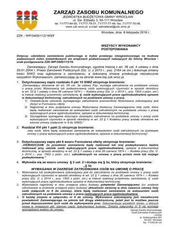 ZARZĄD ZASOBU KOMUNALNEGO JEDNOSTKA BUDŻETOWA GMINY WROCŁAW ul. Św. Elżbiety 3, 50-111 Wrocław tel. 71/777-84-00, 71/777-79-31, 71/777-77-49, fax. 71/777-75-06, www.zzk.wroc.pl e-mail: [email protected] _________________________________________________________________________________________________________________ Wrocław, dnia 8 listopada 2016 r. ZZK - WP/3400/112/16/EF WSZYSCY WYKONAWCY POSTĘPOWANIA Dotyczy: udzielenia zamówienia publicznego w trybie przetargu nieograniczonego na budowę zadaszonych osłon śmietnikowych we wnętrzach podwórzowych należących do Gminy Wrocław znak postępowania ZZK-WP/3400/112/16. Zamawiający, Zarząd Zasobu Komunalnego, zgodnie treścią z art. 38 ust. 4 ustawy z dnia 29.01.2004 r. Prawo Zamówień Publicznych (Dz. U. z 2015 r., poz. 2164 ze zm.) dokonuje zmiany treści SIWZ oraz ogłoszenia o zamówieniu, a dokonaną zmianę przekazuje niezwłocznie wszystkim Wykonawcom, zamieszczając ją na stronie www.bip.zzk.wroc.pl. 1. Dotychczasowy zapis rozdziału II pkt 10 SIWZ otrzymuje brzmienie: „Zamawiający stosownie do art. 29 ust. 3a ustawy Pzp, wymaga zatrudnienia na podstawie umowy o pracę przez Wykonawcę lub podwykonawcę osób wykonujących czynności w sposób określony w art. 22 § 1 ustawy z dnia 26 czerwca 1974 r. – Kodeks pracy (Dz. U. z 2014 r., poz. 1502 z późn. zm.) w trakcie realizacji przedmiotu zamówienia, tj. osób wykonujących prace ogólnobudowlane opisane w dokumentacji technicznej, zatrudnionych na podstawie umowy o pracę. 1) Oświadczenie odnośnie wymaganego zatrudnienia pracowników Wykonawca zobowiązany jest złożyć w Formularzu oferty. 2) Najpóźniej w dniu podpisania umowy Wykonawca dostarczy Zamawiającemu listę osób, które będą realizować zamówienie ze wskazaniem osób zatrudnionych na podstawie umowy o pracę wykonujących prace ogólnobudowlane, opisane w dokumentacji technicznej. 3) Szczegółowe wymagania dotyczące obowiązku zatrudniania na podstawie umowy o pracę osób wykonujących czynności w sposób określony w art. 22 § 1 Kodeksu pracy zostały określone we wzorze umowy (załącznik nr 8 do SIWZ).” 2. Rozdział XVI pkt 1 ppkt 2) otrzymuje brzmienie: „listy osób, które będą realizować zamówienie ze wskazaniem osób zatrudnionych na podstawie umowy o pracę wykonujących prace ogólnobudowlane, opisane w dokumentacji technicznej”. 3. Dotychczasowy zapis pkt 6 wzoru Formularza oferty otrzymuje brzmienie: „OŚWIADCZAM, że przedmiot zamówienia będę realizował lub mój podwykonawca będzie realizował przy udziale osób wykonujących prace ogólnobudowlane, opisane w dokumentacji technicznej, w sposób określony w art. 22 § 1 ustawy z dnia 26 czerwca 1974 r. – Kodeks pracy (Dz. U. z 2014 r., poz. 1502 z późn. zm.), zatrudnionych na umowę o pracę przeze mnie lub mojego podwykonawcę.” 4. Wykreśla się ze wzoru umowy § 3 ust. 2 i dodaje się § 3a, który otrzymuje brzmienie: „§ 3a WYMAGANIA W ZAKRESIE ZATRUDNIANIA OSÓB NA UMOWĘ O PRACĘ 1. Wykonawca lub podwykonawca zobowiązany jest do zatrudnienia na podstawie umowy o pracę osób wykonujących czynności w sposób określony w art. 22 § 1 ustawy z dnia 26 czerwca 1974 r. – Kodeks pracy (Dz. U. z 2014 r., poz. 1502 z późn. zm.) w trakcie realizacji przedmiotu zamówienia, tj. osób wykonujących prace ogólnobudowlane opisane w dokumentacji technicznej. 2. Wykonawca najpóźniej w dniu przejęcia placu budowy potwierdzi Zamawiającemu (co zostanie odnotowane w protokole przejęcia placu budowy) aktualność złożonej w dniu zawarcia umowy listy osób (załącznik nr 6 do umowy), które będą realizować zamówienie ze wskazaniem osób zatrudnionych na podstawie umowy o pracę realizujących prace ogólnobudowlane. 3. O każdej zmianie w załączniku nr 6 do umowy, Wykonawca zobowiązany jest niezwłocznie powiadomić Zamawiającego na piśmie lub drogą elektroniczną, jeżeli jest to możliwe jeszcze przed dopuszczeniem tych osób do wykonywania prac. Dokumentacja wszelkich zmian, o których mowa w niniejszym pkt, stanowi część dokumentacji budowy. Zmiana załącznika nr 6 nie wymaga sporządzana aneksu do umowy. Zarząd Zasobu Komunalnego Dział Zamówień Publicznych i Umów ul. Grabiszyńska 257 53-234 Wrocław fax. 71/332-81-23 4. W trakcie realizacji zamówienia Zamawiający uprawniony jest do wykonywania czynności kontrolnych wobec Wykonawcy odnośnie spełniania przez Wykonawcę lub podwykonawcę wymogu zatrudnienia na podstawie umowy o pracę osób wykonujących wskazane w punkcie 1 czynności. Zamawiający uprawniony jest w szczególności do: 1) żądania oświadczeń i dokumentów w zakresie potwierdzenia spełniania ww. wymogów i dokonywania ich oceny, 2) żądania wyjaśnień w przypadku wątpliwości w zakresie potwierdzenia spełniania ww. wymogów, 3) przeprowadzania kontroli na miejscu wykonywania świadczenia. 5. W trakcie realizacji zamówienia na każde wezwanie Zamawiającego w wyznaczonym w tym wezwaniu terminie Wykonawca przedłoży Zamawiającemu wskazane poniżej dowody w celu potwierdzenia spełnienia wymogu zatrudnienia na podstawie umowy o pracę przez Wykonawcę lub podwykonawcę osób wykonujących wskazane w punkcie 1 czynności w trakcie realizacji zamówienia: 1) oświadczenie Wykonawcy lub podwykonawcy o zatrudnieniu na podstawie umowy o pracę osób wykonujących czynności, których dotyczy wezwanie Zamawiającego. Oświadczenie to powinno zawierać w szczególności: dokładne określenie podmiotu składającego oświadczenie, datę złożenia oświadczenia, wskazanie, że objęte wezwaniem czynności wykonują osoby zatrudnione na podstawie umowy o pracę wraz ze wskazaniem liczby tych osób, rodzaju umowy o pracę i wymiaru etatu oraz podpis osoby uprawnionej do złożenia oświadczenia w imieniu Wykonawcy lub podwykonawcy; 2) poświadczoną za zgodność z oryginałem odpowiednio przez Wykonawcę lub podwykonawcę kopię umowy/umów o prac