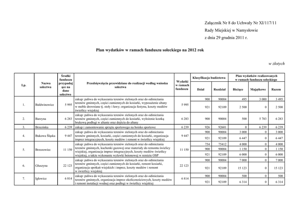 Załącznik Nr 8 do Uchwały Nr XI/117/11 Rady Miejskiej w Namysłowie z dnia 29 grudnia 2011 r. Plan wydatków w ramach funduszu sołeckiego na 2012 rok w złotych Lp. Nazwa sołectwa Środki funduszu przypadaj ące na dane sołectwo 1. Baldwinowice 5 995 2. Barzyna 6 283 3. Brzezinka 6 239 4. Bukowa Śląska 9 447 5. Brzozowiec 11 150 6. Głuszyna 22 123 7. Igłowice 6 814 Klasyfikacja budżetowa Przedsięwzięcia przewidziane do realizacji według wniosku sołectwa zakup: paliwa do wykaszania terenów zielonych oraz do odśnieżania terenów gminnych, części zamiennych do kosiarki, wyposażenie altany w meble drewniane tj. stoły i ławy; organizacja festynu, koszty mediów świetlicy wiejskiej zakup: paliwa do wykaszania terenów zielonych oraz do odśnieżania terenów gminnych, części zamiennych do kosiarki, wyłożenie kostką brukową podłogi w altanie oraz dojścia do altany zakup i zamontowanie sprzętu sportowego na boisko sportowe zakup: paliwa do wykaszania terenów zielonych oraz do odśnieżania terenów gminnych, kosiarki, części zamiennych do kosiarki, organizacja imprez integracyjnych, koszty mediów i remont w świetlicy wiejskiej zakup: paliwa do wykaszania terenów zielonych oraz do odśnieżania terenów gminnych, kuchenki gazowej oraz materiały do remontu świelicy wiejskiej, organizacja imprez integracyjnych, koszty mediów świetlicy wiejskiej, a także wykonanie wylewki betonowej w remizie OSP zakup: paliwa do wykaszania terenów zielonych oraz do odśnieżania terenów gminnych, części zamiennych do kosiarki, remont kosiarki, organizacja spotkań wiejskich i imprez, koszty mediów i remont w świetlicy wiejskiej zakup: paliwa do wykaszania terenów zielonych oraz do odśnieżania terenów gminnych, organizacja imprez okolicznościowych, koszty mediów i remont instalacji wodnej oraz podłogi w świetlicy wiejskiej Wydatki w ramach funduszu Dział Rozdział Plan wydatków realizowanych w ramach funduszu sołeckiego Bieżące Majątkowe Razem 900 90004 495 3 000 3 495 921 92109 2 500 0 2 500 6 283 900 90004 500 5 783 6 283 6 239 926 900 92601 90004 0 3 000 6 239 0 6 239 3 000 921 92109 6 447 0 6 447 754 900 75412 90004 4 000 1 150 0 0 4 000 1 150 921 92109 6 000 0 6 000 900 90004 7 000 0 7 000 921 92109 15 123 0 15 123 900 90004 500 0 500 921 92109 6 314 0 6 314 5 995 9 447 11 150 22 123 6 814 8. Jastrzębie Śl. 9. Józefków 10. Kamienna 11. 12. 13. 14. Kowalowice Krasowice Ligota Książęca Ligotka zakup: paliwa do wykaszania terenów zielonych oraz do odśnieżania 17 720 terenów gminnych, kosiarki spalinowej; organizacja festynu, wycinka drzew oraz czyszczenie kanalizacji burzowej wzdłuż ul. Dworcowej 5 288 remont przystanku autobusowego zakup: paliwa do wykaszania terenów zielonych oraz do odśnieżania 14 757 terenów gminnych, części zamiennych do kosiarki, sprzętu typu"outdoor fitness"; organizacja festynu, koszty mediów świetlicy wiejskiej zakup: paliwa do wykaszania terenów zielonych oraz do odśnieżania terenów gminnych, części zamiennych do kosiarki, zmywarki, kuchni 16 813 elektrycznej, lodówki, sprzętu nagłaśniającego i sprzętu sportowego; remont drogi w Nowym Dworze zakup: paliwa do wykaszania terenów zielonych oraz do odśnieżania 13 916 terenów gminnych, części zamiennych do kosiarek; opracowanie dokumentacji projektowej budowy remizy strażackiej zakup paliwa do wykaszania terenów zielonych oraz do odśnieżania 13 318 terenów gminnych; organizacja festynu, koszty mediów świetlicy wiejskiej, remont drogi gminnej nr 465 i nr 467, odprowadzenie wody ze stawu zakup: paliwa do wykaszania terenów zielonych oraz do odśnieżania terenów gminnych, wykaszarki i kosiarki oraz części zamiennych do 8 695 wykaszarki i kosiarki, koszty mediów świetlicy wiejskiej, ułożenie kostką brukową pod i wokół wiaty rekreacyjnej zakup: paliwa do wykaszania terenów zielonych oraz do odśnieżania terenów gminnych, kosy spalinowej oraz części zamiennych do kosiarek; 11 461 koszty mediów świetlicy wiejskiej, wykonanie ogrodzenia przy świetlicy wiejskiej - II etap 6 107 budowa placu zabaw 17 720 5 288 14 750 16 800 13 916 13 318 8 695 15. Łączany 16. Michalice 17. Mikowice zakup: paliwa do wykaszania terenów zielonych oraz do odśnieżania 12 677 terenów gminnych, części zamiennych do kosiarek, szatni kontenerowej; organizacja festynu, koszty mediów świetlicy wiejskiej 12 677 Minkowskie zakup: paliwa do wykaszania terenów zielonych oraz do odśnieżania terenów gminnych, części zamiennych do kosiarek, wykaszarki 13 606 ciągnikowej, stołu do kuchni i pochłaniacze pary do świetlicy wiejskiej; organizacja festynów, remont i koszty mediów świetlicy wiejskiej 13 606 18. 19. Niwki zakup: paliwa do wykaszania terenów zielonych oraz do odśnieżania terenów gminnych, kosiarki, materiałów do utrzymania altanki oraz 5 774 drzewek ozdobnych 11 460 6 107 5 774 921 600 900 90001 90004 92109 60016 90004 12 200 3 520 2 000 0 1 500 0 0 0 5 288 8 850 12 200 3 520 2 000 5 288 10 350 921 92109 4 400 0 4 400 600 900 60016 90004 3 500 6 300 0 0 3 500 6 300 921 92109 7 000 0 7 000 900 90004 2 000 0 2 000 754 75412 0 11 916 11 916 010 600 900 921 900 01008 60016 90004 92109 90004 2 800 8 718 600 1 200 7 885 0 0 0 0 0 2 800 8 718 600 1 200 7 885 921 92109 810 0 810 900 90004 3 600 0 3 600 921 92109 600 7 260 7 860 900 900 921 926 900 90004 90004 92109 92601 90004 0 977 700 0 2 400 6 107 0 0 11 000 7 800 6 107 977 700 11 000 10 200 921 92109 3 406 0 3 406 900 90004 5 774 0 5 774 900 20. Nowe Smarchowice zakup: paliwa do wykaszania terenów zielonych oraz do odśnieżania terenów gminnych, części zamiennych do kosiarki, odtwarzacza płyt 10 908 kompaktowych, rolet, firanek i stołu do gry w bilarda do świetlicy wiejskiej; koszty mediów świetlicy wiejskiej i wykonanie oświetlenia ulicznego w przysiółkach Bławaciska i Stanek zakup: paliwa do koszenia placu zabaw, sprzętu do wypoczynku w parku; remont kosiarki