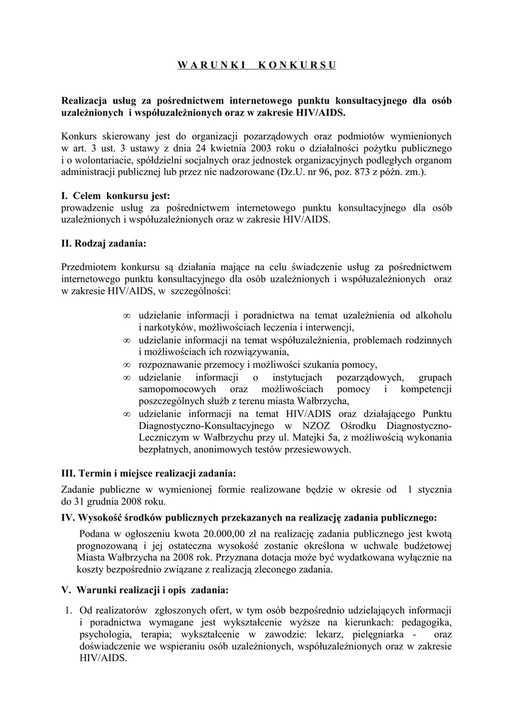 WARUNKI KONKURSU Realizacja usług za pośrednictwem internetowego punktu konsultacyjnego dla osób uzależnionych i współuzależnionych oraz w zakresie HIV/AIDS. Konkurs skierowany jest do organizacji pozarządowych oraz podmiotów wymienionych w art. 3 ust. 3 ustawy z dnia 24 kwietnia 2003 roku o działalności pożytku publicznego i o wolontariacie, spółdzielni socjalnych oraz jednostek organizacyjnych podległych organom administracji publicznej lub przez nie nadzorowane (Dz.U. nr 96, poz. 873 z późn. zm.). I. Celem konkursu jest: prowadzenie usług za pośrednictwem internetowego punktu konsultacyjnego dla osób uzależnionych i współuzależnionych oraz w zakresie HIV/AIDS. II. Rodzaj zadania: Przedmiotem konkursu są działania mające na celu świadczenie usług za pośrednictwem internetowego punktu konsultacyjnego dla osób uzależnionych i współuzależnionych oraz w zakresie HIV/AIDS, w szczególności: • • • • • udzielanie informacji i poradnictwa na temat uzależnienia od alkoholu i narkotyków, możliwościach leczenia i interwencji, udzielanie informacji na temat współuzależnienia, problemach rodzinnych i możliwościach ich rozwiązywania, rozpoznawanie przemocy i możliwości szukania pomocy, udzielanie informacji o instytucjach pozarządowych, grupach samopomocowych oraz możliwościach pomocy i kompetencji poszczególnych służb z terenu miasta Wałbrzycha, udzielanie informacji na temat HIV/ADIS oraz działającego Punktu Diagnostyczno-Konsultacyjnego w NZOZ Ośrodku DiagnostycznoLeczniczym w Wałbrzychu przy ul. Matejki 5a, z możliwością wykonania bezpłatnych, anonimowych testów przesiewowych. III. Termin i miejsce realizacji zadania: Zadanie publiczne w wymienionej formie realizowane będzie w okresie od do 31 grudnia 2008 roku. 1 stycznia IV. Wysokość środków publicznych przekazanych na realizację zadania publicznego: Podana w ogłoszeniu kwota 20.000,00 zł na realizację zadania publicznego jest kwotą prognozowaną i jej ostateczna wysokość zostanie określona w uchwale budżetowej Miasta Wałbrzycha na 2008 rok. Przyznana dotacja może być wydatkowana wyłącznie na koszty bezpośrednio związane z realizacją zleconego zadania. V. Warunki realizacji i opis zadania: 1. Od realizatorów zgłoszonych ofert, w tym osób bezpośrednio udzielających informacji i poradnictwa wymagane jest wykształcenie wyższe na kierunkach: pedagogika, psychologia, terapia; wykształcenie w zawodzie: lekarz, pielęgniarka oraz doświadczenie we wspieraniu osób uzależnionych, współuzależnionych oraz w zakresie HIV/AIDS. Koszty osobowe – wynagrodzenia płatne wraz z pochodnymi w celu realizacji zadania (wskazane są wynagrodzenia brutto za godzinę pracy w Punkcie zgodnie z rekomendacjami PARPA). 2. Obligatoryjny jest udział własny oferenta w wysokości 15% kosztu całkowitego zadania. 3. Realizatorzy zgłoszonych ofert zobowiązani są do: • posiadania strony internetowej, • zapewnienia całkowitej anonimowości z możliwością przeniesienia rozmów na „PRIV,” • świadczenie usług winno się odbywać 5 dni w tygodniu, od poniedziałku do piątku, przez 4 godziny dziennie, w godzinach od 17.00 do 21.00 , w tym: 3 godziny prowadzenia w chat rozmów z operatorem dyżurnym i jedną godzinę na odpowiedzi e-maile. 4. Kontroli podlegają wszystkie dokumenty służące ocenie zasadności wykorzystywania środków publicznych przeprowadzane przez Zleceniodawcę. VI. Warunki składania ofert: 1. Oferent zobowiązany jest do złożenia oferty zgodnie z wymogami określonymi w załączniku nr 1 do Rozporządzenia Ministra Pracy i Polityki Społecznej z dnia 27 grudnia 2005 r. w sprawie wzoru oferty realizacji zadania publicznego ramowego wzoru umowy o wykonanie zadania publicznego i wzoru sprawozdania z wykonania tego zadania (Dz.U. Nr 264 poz. 2207). 1. Ofertę należy: a. sporządzić w formie pisemnej pod rygorem nieważności, wypełnioną maszynowo lub czytelnym pismem ręcznym, drukowanym, wraz z ponumerowaniem każdej strony; b. sporządzić w sposób umożliwiający dopięcie jej jako załącznika do umowy, a więc z wykluczeniem sposobów trwałego spinania dokumentów (bindowanie, zszywania i in.); c. złożyć w kopercie ze wskazaniem konkursu, którego dotyczy oraz z oznaczeniem numeru zadania lub jego nazwy. VII. Wymogi formalne: Wymogi formalne obejmują następujące elementy: 1) aktualny odpis z rejestru lub odpowiednio wyciąg z ewidencji lub inne dokumenty potwierdzające status prawny oferenta i umocowanie osób go reprezentujących, 2) sprawozdanie merytoryczne i finansowe ( bilans, rachunek wyników lub rachunek zysków i strat, informacja dodatkowa) za ostatni rok, 3) umowa partnerska lub oświadczenie partnera ( w przypadku wskazania w Ofercie w pkt V.1. partnera), 4) oświadczenie o niezaleganiu z płatnościami na rzecz Gminy Wałbrzych, ZUS i Urzędu Skarbowego, 5) złożenie oferty na obowiązującym wzorze, podpisanym przez osobę lub osoby upoważnione do składania oświadczeń woli, zgodnie ze statutem lub innym dokumentem lub rejestrem określającym sposób reprezentacji wraz z pieczątkami imiennymi, a w przypadku ich braku czytelne podpisy oraz pieczątka nagłówkowa oferenta, 6) złożenie oświadczenia o posiadaniu tytułu prawnego do lokalu, w którym realizowane będzie zadanie ( np.: umowa najmu, użyczenia, dzierżawy, etc.), 7) złożenie imiennego wykazu osób realizujących zadanie z podaniem ich kwalifikacji i uprawnień wraz z załączeniem kserokopii kwalifikacji i uprawnień, 8) złożenie pieczątek oferenta we wszystkich wymaganych miejscach na wzorze oferty, 9) prawidłowo i czytelnie sporządzoną kalkulację kosztów, 10) wypełnienie wszystkich miejsc w ofercie, o której mowa w rozdz. VI pkt.1 warunków konkursu. UWAGA: Oferta, która nie będzie posiadała wszystkich elementów wyżej wymienionych zostanie odrzucona z powodów formalnych. VIII. Ocena ofert: Oceny merytorycznej ora