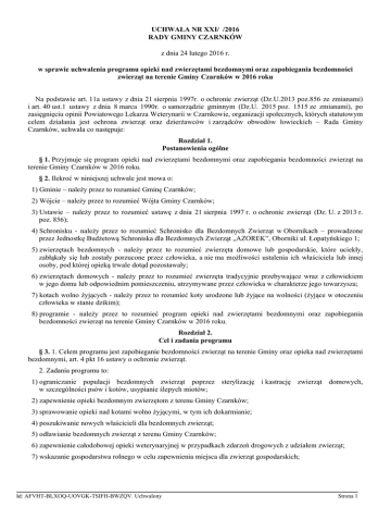UCHWAŁA NR XXI/ /2016 RADY GMINY CZARNKÓW z dnia 24 lutego 2016 r. w sprawie uchwalenia programu opieki nad zwierzętami bezdomnymi oraz zapobiegania bezdomności zwierząt na terenie Gminy Czarnków w 2016 roku Na podstawie art. 11a ustawy z dnia 21 sierpnia 1997r. o ochronie zwierząt (Dz.U.2013 poz.856 ze zmianami) i art. 40 ust.1 ustawy z dnia 8 marca 1990r. o samorządzie gminnym (Dz.U. 2015 poz. 1515 ze zmianami), po zasięgnięciu opinii Powiatowego Lekarza Weterynarii w Czarnkowie, organizacji społecznych, których statutowym celem działania jest ochrona zwierząt oraz dzierżawców i zarządców obwodów łowieckich – Rada Gminy Czarnków, uchwala co następuje: Rozdział 1. Postanowienia ogólne § 1. Przyjmuje się program opieki nad zwierzętami bezdomnymi oraz zapobiegania bezdomności zwierząt na terenie Gminy Czarnków w 2016 roku. § 2. Ilekroć w niniejszej uchwale jest mowa o: 1) Gminie – należy przez to rozumieć Gminę Czarnków; 2) Wójcie – należy przez to rozumieć Wójta Gminy Czarnków; 3) Ustawie – należy przez to rozumieć ustawę z dnia 21 sierpnia 1997 r. o ochronie zwierząt (Dz. U. z 2013 r. poz. 856); 4) Schronisku - należy przez to rozumieć Schronisko dla Bezdomnych Zwierząt w Obornikach – prowadzone przez Jednostkę Budżetową Schroniska dla Bezdomnych Zwierząt „AZOREK”, Oborniki ul. Łopatyńskiego 1; 5) zwierzętach bezdomnych - należy przez to rozumieć zwierzęta domowe lub gospodarskie, które uciekły, zabłąkały się lub zostały porzucone przez człowieka, a nie ma możliwości ustalenia ich właściciela lub innej osoby, pod której opieką trwale dotąd pozostawały; 6) zwierzętach domowych - należy przez to rozumieć zwierzęta tradycyjnie przebywające wraz z człowiekiem w jego domu lub odpowiednim pomieszczeniu, utrzymywane przez człowieka w charakterze jego towarzysza; 7) kotach wolno żyjących - należy przez to rozumieć koty urodzone lub żyjące na wolności (żyjące w otoczeniu człowieka w stanie dzikim); 8) programie - należy przez to rozumieć program opieki nad zwierzętami bezdomnymi oraz zapobiegania bezdomności zwierząt na terenie Gminy Czarnków w 2016 roku. Rozdział 2. Cel i zadania programu § 3. 1. Celem programu jest zapobieganie bezdomności zwierząt na terenie Gminy oraz opieka nad zwierzętami bezdomnymi, art. 4 pkt 16 ustawy o ochronie zwierząt. 2. Zadania programu to: 1) ograniczanie populacji bezdomnych zwierząt poprzez sterylizację i kastrację zwierząt domowych, w szczególności psów i kotów, usypianie ślepych miotów; 2) zapewnienie opieki bezdomnym zwierzętom z terenu Gminy Czarnków; 3) sprawowanie opieki nad kotami wolno żyjącymi, w tym ich dokarmianie; 4) poszukiwanie nowych właścicieli dla bezdomnych zwierząt; 5) odławianie bezdomnych zwierząt z terenu Gminy Czarnków; 6) zapewnienie całodobowej opieki weterynaryjnej w przypadkach zdarzeń drogowych z udziałem zwierząt; 7) wskazanie gospodarstwa rolnego w celu zapewnienia miejsca dla zwierząt gospodarskich; Id: AFVHT-BLXOQ-UOVGK-TSIFH-BWZQV. Uchwalony Strona 1 8) edukacja mieszkańców Gminy w zakresie opieki nad zwierzętami; 9) finansowanie realizacji programu w 2016r. Rozdział 3. Ograniczenie populacji bezdomnych zwierząt § 4. 1. Ograniczanie populacji bezdomnych zwierząt poprzez sterylizację i kastrację zwierząt domowych, w szczególności psów i kotów, realizują: 1) schronisko poprzez obligatoryjne przeprowadzanie zabiegów sterylizacji i kastracji zwierząt przyjętych do schroniska, z wyjątkiem zwierząt u których istnieją przeciwwskazania do wykonania tych zabiegów, z uwagi na stan zdrowia i/lub wiek, z którym Wójt zawiera stosowną umowę lub porozumienie; 2) Wójt za pośrednictwem Referatu Rolnictwa i Ochrony Środowiska poprzez prowadzenie akcji zachęcających właścicieli psów i kotów do wykonywania zabiegów sterylizacji i kastracji, na poniższych zasadach: a) zapewnia właścicielom psów dofinansowanie w wysokości 100% kosztów sterylizacji samic i kastracji samców; b) właściciele zwierząt mogą otrzymać dofinansowanie na zabieg sterylizacji i kastracji w ilości maksymalnie 2 sztuk zwierząt rocznie; c) zawiera umowę z zakładem leczniczym dla zwierząt na dokonywanie zabiegów sterylizacji i kastracji. 2. Właściciel zwierzęcia, w celu wykonania zabiegu sterylizacji lub kastracji psa, zgłasza się do Wójta celem uzyskania zezwolenia i wskazania zakładu leczniczego dla zwierząt, z którym została zawarta umowa na dokonanie zabiegu sterylizacji i kastracji. Rozdział 4. Usypianie ślepych miotów § 5. 1. Usypianie ślepych miotów zwierząt, zgodnie z art. 11a ust. 2 pkt 6 ustawy realizują: 1) schronisko poprzez dokonywanie przez lekarza weterynarii zabiegów usypiania ślepych miotów zwierząt aktualnie przebywających w schronisku, z którym Wójt zawiera stosowną umowę; 2) Wójt poprzez zawarcie umowy z zakładem leczniczym dla zwierząt zapewnia właścicielom zwierząt, dofinansowanie w wysokości 100% kosztów zabiegu usypiania ślepego miotu, maksymalnie 2 razy w ciągu roku. 2. Właściciel zwierząt, w celu wykonania zabiegu usypiania, zgłasza się do zakładu leczniczego dla zwierząt, o którym mowa w ust. 1 pkt 2 lit. a. Dostarcza zgodę na wykonanie usługi weterynaryjnej z dofinansowaniem. Wyraża zgodę na przetwarzanie swoich danych osobowych dla potrzeb wynikających z realizacji programu. Dofinansowanie kosztów sterylizacji i kastracji psów przysługuje osobom, które poddały psa szczepieniu przeciwko wściekliźnie i opłaciły obowiązującą opłatę od posiadania psów. 3. Informacja została podana do publicznej wiadomości, poprzez stronę internetową Gminy Czarnków (www.czarnkowgmina.pl). Rozdział 5. Opieka nad wolno żyjącymi kotami, w tym ich dokarmianie § 6. Sprawowanie opieki nad kotami wolno żyjącymi, w tym ich dokarmianie realizuje Wójt za pośrednictwem stanowiska ds. rolnictwa i ochrony środowiska po