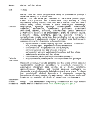 Nazwa: Garbarz skór bez włosa Kod: 753502 Synteza: Zadania zawodowe: Garbarz skór bez włosa przygotowuje skóry do garbowania, garbuje i wykańcza według ich przeznaczenia. Garbarz skór bez włosa jest zawodem o charakterze produkcyjnym. Celem pracy garbarza jest przetworzenie skóry surowej w skórę wyprawioną licową, inaczej skórę bez włosa. Garbarz skór bez włosa sortuje skóry surowe, dobiera w partie produkcyjne, konserwuje, magazynuje, wykonuje operacje technologiczne: rozmaczanie, wapnienie, odwapnianie, wytrawianie, piklowanie, garbowanie (mineralne, roślinne, żywicowe, kombinowane). Sortuje otrzymany półfabrykat w zależności od przeznaczenia: skóry na wierzchy obuwia, podszewki, odzież, galanterię, spodowe, tapicerkę meblową i samochodową, wyroby rymarskie. Odpowiedzialny jest za prawidłowe eksploatowanie i użytkowanie maszyn i urządzeń oraz kontrolowanie urządzeń sterowniczych procesu technologicznego. • organizowanie stanowiska pracy zgodnie z zasadami i przepisami BHP, ochrony ppoż., ergonomii i ochrony środowiska; • konserwowanie i magazynowanie skór surowych; • przygotowywanie skór bez włosa do wyprawy; • garbowanie i wstępne wykańczanie kąpielowe skór bez włosa; • wykańczanie właściwe skór bez włosa; • kontrolowanie jakości półfabrykatów i skór gotowych; • magazynowanie półfabrykatów skórzanych oraz skór gotowych. Pracownik wykonujący zawód garbarza skór bez włosa winien posiadać wykształcenie zasadnicze zawodowe w kierunkach związanych z przemysłem skórzanym bądź uzyskać je w drodze kształcenia rzemieślniczego. Możliwe jest również szkolenie praktyczne na stanowisku pracy i zdobywanie doświadczenia w trakcie pracy. Przydatna jest umiejętność obsługi komputera i stosowania programów komputerowych wspomagających wykonywane zadania oraz znajomość języka obcego (angielski lub niemiecki) na poziomie podstawowym. Dodatkowe zadania zawodowe: Uwaga – opis standardów kompetencji zawodowych dla tego zawodu można znaleźć w bazie danych: www.kwalifikacje.praca.gov.pl