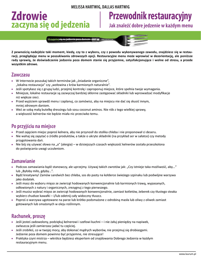 MELISSA HARTWIG, DALLAS HARTWIG Zdrowie zaczyna się od jedzenia Przewodnik restauracyjny Jak znaleźć dobre jedzenie w każdym menu Przygotuj się na jedzenie poza domem Z pewnością nadejdzie taki moment, kiedy, czy to z wyboru, czy z powodu wykonywanego zawodu, znajdziesz się w restauracji, przeglądając menu w poszukiwaniu zdrowszych opcji. Restauracyjne menu może wprawiać w dezorientację, ale poniższe rady sprawią, że doświadczenie jedzenia poza domem stanie się przyjemne, satysfakcjonujące i wolne od stresu, a przede wszystkim zdrowe. Zawczasu W Internecie poszukaj takich terminów jak „śniadanie organiczne”, „lokalna restauracja” czy „wołowina z krów karmionych naturalnie”. Jeśli spotykasz się z grupą ludzi, przejmij kontrolę i zaproponuj miejsce, które spełnia twoje wymagania. Mniejsze, lokalne restauracje są zazwyczaj bardziej skłonne zastępować składniki lub wprowadzać modyfikacje niż większe sieci. Przed wyjściem sprawdź menu i zaplanuj, co zamówisz, aby na miejscu nie dać się skusić innym, mniej zdrowym daniom. Weź ze sobą małą butelkę dressingu lub sosu coconut aminos. Nie rób z tego wielkiej sprawy, a większość kelnerów nie będzie miała nic przeciwko temu. Po przyjściu na miejsce Przed zajęciem miejsc poproś kelnera, aby nie przynosił do stolika chleba i nie proponował ci deseru. Nie wahaj się zapytać o źródło produktów, a także o ukryte składniki (na przykład ser w sałatce) czy metody przygotowania dań. Nie bój się używać słowa na „a” (alergia) – w dzisiejszych czasach większość kelnerów została przeszkolona do poświęcania uwagi uczuleniom. Zamawianie Podczas zamawiania bądź stanowczy, ale uprzejmy. Używaj takich zwrotów jak: „Czy istnieje taka możliwość, aby…” lub „Byłoby miło, gdyby…”. Bądź kreatywny! Zamów sandwich bez chleba, sos do pasty na kołderce świeżego szpinaku lub podwójne warzywa jako dodatek. Jeśli masz do wyboru mięso ze zwierząt hodowanych konwencjonalnie lub karmionych trawą, wypasanych, odłowionych z natury i organicznych, zrezygnuj z tego pierwszego. Jeśli musisz wybrać mięso ze zwierząt hodowanych konwencjonalnie, zamiast kotletów, żeberek czy tłustego steaka wybierz chudsze kawałki – i/lub odetnij cały widoczny tłuszcz. Poproś o warzywa ugotowane na parze lub krótko podsmażone z odrobiną masła lub oliwy z oliwek zamiast gotowanych lub smażonych w oleju roślinnym. Rachunek, proszę Jeśli jesteś zadowolony, podziękuj kelnerowi i szefowi kuchni – i nie żałuj pieniędzy na napiwek, zwłaszcza jeśli zamierzasz jadać tu częściej. Jeśli zrobiłeś, co w twojej mocy, aby dokonać mądrych wyborów, nie przejmuj się drobiazgami. Jedzenie poza domem powinno być przyjemne, nie stresujące! Praktyka czyni mistrza – wkrótce będziesz ekspertem od znajdowania Dobrego Jedzenia w każdym restauracyjnym menu. www.laurum.pl