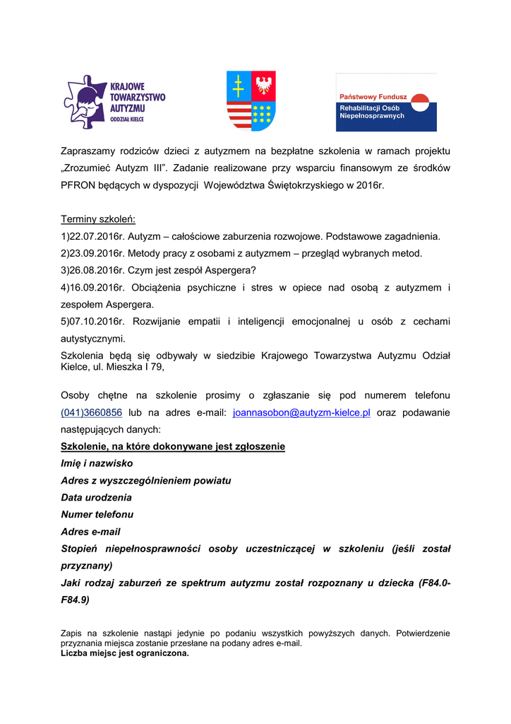 Zapraszamy rodziców dzieci z autyzmem na bezpłatne szkolenia w ramach projektu „Zrozumieć Autyzm III”. Zadanie realizowane przy wsparciu finansowym ze środków PFRON będących w dyspozycji Województwa Świętokrzyskiego w 2016r. Terminy szkoleń: 1)22.07.2016r. Autyzm – całościowe zaburzenia rozwojowe. Podstawowe zagadnienia. 2)23.09.2016r. Metody pracy z osobami z autyzmem – przegląd wybranych metod. 3)26.08.2016r. Czym jest zespół Aspergera? 4)16.09.2016r. Obciążenia psychiczne i stres w opiece nad osobą z autyzmem i zespołem Aspergera. 5)07.10.2016r. Rozwijanie empatii i inteligencji emocjonalnej u osób z cechami autystycznymi. Szkolenia będą się odbywały w siedzibie Krajowego Towarzystwa Autyzmu Odział Kielce, ul. Mieszka I 79, Osoby chętne na szkolenie prosimy o zgłaszanie się pod numerem telefonu (041)3660856 lub na adres e-mail: [email protected] oraz podawanie następujących danych: Szkolenie, na które dokonywane jest zgłoszenie Imię i nazwisko Adres z wyszczególnieniem powiatu Data urodzenia Numer telefonu Adres e-mail Stopień niepełnosprawności osoby uczestniczącej w szkoleniu (jeśli został przyznany) Jaki rodzaj zaburzeń ze spektrum autyzmu został rozpoznany u dziecka (F84.0F84.9) Zapis na szkolenie nastąpi jedynie po podaniu wszystkich powyższych danych. Potwierdzenie przyznania miejsca zostanie przesłane na podany adres e-mail. Liczba miejsc jest ograniczona.