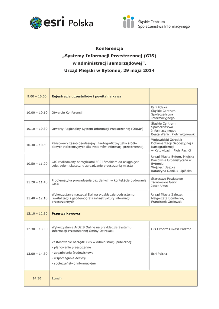 Konferencja „Systemy Informacji Przestrzennej (GIS) w administracji samorządowej", Urząd Miejski w Bytomiu, 29 maja 2014 9.00 – 10.00 Rejestracja uczestników i powitalna kawa Otwarcie Konferencji Esri Polska Śląskie Centrum Społeczeństwa Informacyjnego 10.10 – 10.30 Otwarty Regionalny System Informacji Przestrzennej (ORSIP) Śląskie Centrum Społeczeństwa Informacyjnego: Beata Wanic, Piotr Wojnowski 10.30 – 10.50 Państwowy zasób geodezyjny i kartograficzny jako źródło danych referencyjnych dla systemów informacji przestrzennej. Wojewódzki Ośrodek Dokumentacji Geodezyjnej i Kartograficznej w Katowicach: Piotr Pachół 10.50 – 11.20 GIS realizowany narzędziami ESRI środkiem do osiągnięcia celu, celem skuteczne zarządzanie przestrzenią miasta Urząd Miasta Bytom, Miejska Pracownia Urbanistyczna w Bytomiu: Wojciech Jeszka Katarzyna Daniluk-Lipińska 11.20 – 11.40 Problematyka prowadzenia baz danych w kontekście budowania GISu Starostwo Powiatowe Tarnowskie Góry: Jacek Ukuś 11.40 – 12.10 Wykorzystanie narzędzi Esri na przykładzie podsystemu rewitalizacji i geodemografii infrastruktury informacji przestrzennych Urząd Miasta Zabrze: Małgorzata Bombelka, Franciszek Gosiewski 12.10 – 12.30 Przerwa kawowa 12.30 – 13.00 Wykorzystanie ArcGIS Online na przykładzie Systemu Informacji Przestrzennej Gminy Ostrówek 10.00 – 10.10 Gis-Expert: Łukasz Prażmo Zastosowanie narzędzi GIS w administracji publicznej: - planowanie przestrzenne 13.00 – 14.30 - zagadnienia środowiskowe - wspomaganie decyzji - społeczeństwo informacyjne 14.30 Lunch Esri Polska