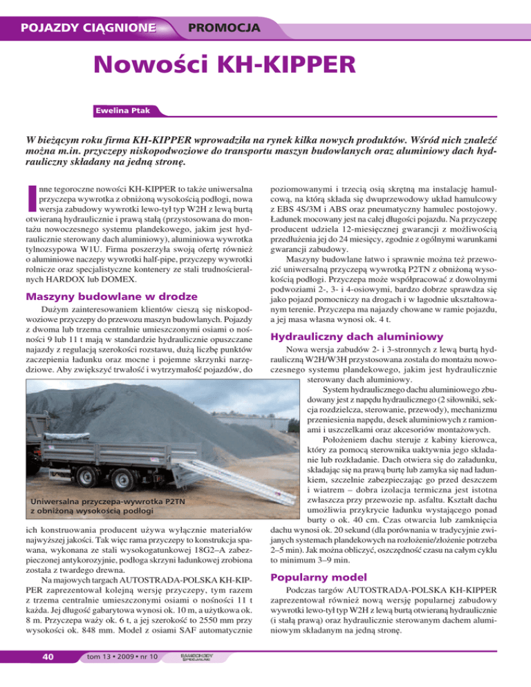 POJAZDY CI¥GNIONE PROMOCJA Nowości KH-KIPPER Ewelina Ptak W bieżącym roku firma KH-KIPPER wprowadziła na rynek kilka nowych produktów. Wśród nich znaleźć można m.in. przyczepy niskopodwoziowe do transportu maszyn budowlanych oraz aluminiowy dach hydrauliczny składany na jedną stronę. I nne tegoroczne nowości KH-KIPPER to także uniwersalna przyczepa wywrotka z obniżoną wysokością podłogi, nowa wersja zabudowy wywrotki lewo-tył typ W2H z lewą burtą otwieraną hydraulicznie i prawą stałą (przystosowana do montażu nowoczesnego systemu plandekowego, jakim jest hydraulicznie sterowany dach aluminiowy), aluminiowa wywrotka tylnozsypowa W1U. Firma poszerzyła swoją ofertę również o aluminiowe naczepy wywrotki half-pipe, przyczepy wywrotki rolnicze oraz specjalistyczne kontenery ze stali trudnościeralnych HARDOX lub DOMEX. Maszyny budowlane w drodze Dużym zainteresowaniem klientów cieszą się niskopodwoziowe przyczepy do przewozu maszyn budowlanych. Pojazdy z dwoma lub trzema centralnie umieszczonymi osiami o nośności 9 lub 11 t mają w standardzie hydraulicznie opuszczane najazdy z regulacją szerokości rozstawu, dużą liczbę punktów zaczepienia ładunku oraz mocne i pojemne skrzynki narzędziowe. Aby zwiększyć trwałość i wytrzymałość pojazdów, do Uniwersalna przyczepa-wywrotka P2TN z obniżoną wysokością podłogi ich konstruowania producent używa wyłącznie materiałów najwyższej jakości. Tak więc rama przyczepy to konstrukcja spawana, wykonana ze stali wysokogatunkowej 18G2–A zabezpieczonej antykorozyjnie, podłoga skrzyni ładunkowej zrobiona została z twardego drewna. Na majowych targach AUTOSTRADA-POLSKA KH-KIPPER zaprezentował kolejną wersję przyczepy, tym razem z trzema centralnie umieszczonymi osiami o nośności 11 t każda. Jej długość gabarytowa wynosi ok. 10 m, a użytkowa ok. 8 m. Przyczepa waży ok. 6 t, a jej szerokość to 2550 mm przy wysokości ok. 848 mm. Model z osiami SAF automatycznie 40 tom 13 • 2009• nr 10 poziomowanymi i trzecią osią skrętną ma instalację hamulcową, na którą składa się dwuprzewodowy układ hamulcowy z EBS 4S/3M i ABS oraz pneumatyczny hamulec postojowy. Ładunek mocowany jest na całej długości pojazdu. Na przyczepę producent udziela 12-miesięcznej gwarancji z możliwością przedłużenia jej do 24 miesięcy, zgodnie z ogólnymi warunkami gwarancji zabudowy. Maszyny budowlane łatwo i sprawnie można też przewozić uniwersalną przyczepą wywrotką P2TN z obniżoną wysokością podłogi. Przyczepa może współpracować z dowolnymi podwoziami 2-, 3- i 4-osiowymi, bardzo dobrze sprawdza się jako pojazd pomocniczy na drogach i w łagodnie ukształtowanym terenie. Przyczepa ma najazdy chowane w ramie pojazdu, a jej masa własna wynosi ok. 4 t. Hydrauliczny dach aluminiowy Nowa wersja zabudów 2- i 3-stronnych z lewą burtą hydrauliczną W2H/W3H przystosowana została do montażu nowoczesnego systemu plandekowego, jakim jest hydraulicznie sterowany dach aluminiowy. System hydraulicznego dachu aluminiowego zbudowany jest z napędu hydraulicznego (2 siłowniki, sekcja rozdzielcza, sterowanie, przewody), mechanizmu przeniesienia napędu, desek aluminiowych z ramionami i uszczelkami oraz akcesoriów montażowych. Położeniem dachu steruje z kabiny kierowca, który za pomocą sterownika uaktywnia jego składanie lub rozkładanie. Dach otwiera się do załadunku, składając się na prawą burtę lub zamyka się nad ładunkiem, szczelnie zabezpieczając go przed deszczem i wiatrem – dobra izolacja termiczna jest istotna zwłaszcza przy przewozie np. asfaltu. Kształt dachu umożliwia przykrycie ładunku wystającego ponad burty o ok. 40 cm. Czas otwarcia lub zamknięcia dachu wynosi ok. 20 sekund (dla porównania w tradycyjnie zwijanych systemach plandekowych na rozłożenie/złożenie potrzeba 2–5 min). Jak można obliczyć, oszczędność czasu na całym cyklu to minimum 3–9 min. Popularny model Podczas targów AUTOSTRADA-POLSKA KH-KIPPER zaprezentował również nową wersję popularnej zabudowy wywrotki lewo-tył typ W2H z lewą burtą otwieraną hydraulicznie (i stałą prawą) oraz hydraulicznie sterowanym dachem aluminiowym składanym na jedną stronę. POJAZDY CI¥GNIONE stosowano do montażu nowoczesnego systemu zabezpieczania ładunku przed niekorzystnym działaniem warunków atmosferycznych, tj. systemu plandekowego Cramaro. Wywrotka tylnozsypowa W1M Kopalniana wywrotka tylnozsypowa typ W1M Burta hydrauliczna, tzw. Hydroboard, opuszcza się płynnie w dół od pozycji pionowej o 170°. Przy opuszczeniu burty o 90° możliwy jest wysyp ładunku na bok w pewnej odległości od pojazdu bez zasypywania kół pojazdu, np. przy sypaniu wałów bądź zasypywaniu wykopów wzdłuż drogi. Można ją obsługiwać zarówno z ziemi, jak i z fotela kierowcy w kabinie. Podłoga skrzyni wykonana została z 5-milimetrowej stali trudnościeralnej HARDOX, a burty boczne z 4-milimetrowej stali HARDOX. Ze względu na funkcjonalność ten rodzaj zabudowy wypiera klasyczne trójstronne wywrotki z burtami uchylnymi w górnej osi. Zabudowa tylnozsypowa W1U Targową nowością jest także aluminiowa wywrotka tylnozsypowa typ W1U. Zabudowa wykonana z trudnościeralnego czystego aluminium jest lekka, waży tylko ok. 2,5 t. Wywrotka (grubość podłogi i burt to odpowiednio: 8 i 6 mm, wysokość burt 1500 mm) ma kształt zapobiegający pozostawianiu materiału wewnątrz przestrzeni ładunkowej. Przy objętości 18,7 m3 jej ładowność administracyjna wynosi 19 t. Zabudowę przy- Jednym z mniej znanych na polskim rynku produktów KH-KIPPER są zabudowy do wewnętrznego transportu w kopalniach na trasie ściana-kruszarka. Zabudowy takie zamontowane na specjalnie wzmocnionym podwoziu 8×4 o nośności technicznej ponad 50 t mogą z powodzeniem zastąpić wozidła przegubowe. Jedynym warunkiem, jaki należy spełnić, by wykorzystać możliwości zastosowania wywrotek na podwoziach 8×