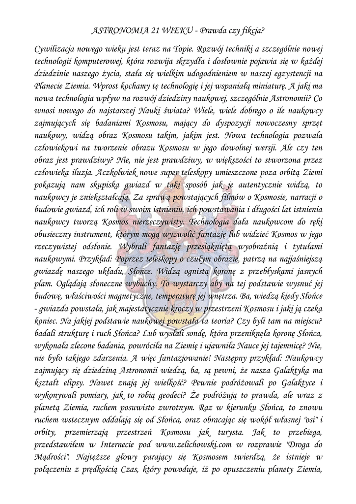 ASTRONOMIA 21 WIEKU - Prawda czy fikcja? Cywilizacja nowego wieku jest teraz na Topie. Rozwój techniki a szczególnie nowej technologii komputerowej, która rozwija skrzydła i dosłownie pojawia się w każdej dziedzinie naszego życia, stała się wielkim udogodnieniem w naszej egzystencji na Planecie Ziemia. Wprost kochamy tę technologię i jej wspaniałą miniaturę. A jaki ma nowa technologia wpływ na rozwój dziedziny naukowej, szczególnie Astronomii? Co wnosi nowego do najstarszej Nauki świata? Wiele, wiele dobrego o ile naukowcy zajmujących się badaniami Kosmosu, mający do dyspozycji nowoczesny sprzęt naukowy, widzą obraz Kosmosu takim, jakim jest. Nowa technologia pozwala człowiekowi na tworzenie obrazu Kosmosu w jego dowolnej wersji. Ale czy ten obraz jest prawdziwy? Nie, nie jest prawdziwy, w większości to stworzona przez człowieka iluzja. Aczkolwiek nowe super teleskopy umieszczone poza orbitą Ziemi pokazują nam skupiska gwiazd w taki sposób jak je autentycznie widzą, to naukowcy je zniekształcają. Za sprawą powstających filmów o Kosmosie, narracji o budowie gwiazd, ich roli w swoim istnieniu, ich powstawania i długości lat istnienia naukowcy tworzą Kosmos nierzeczywisty. Technologia dała naukowcom do ręki obusieczny instrument, którym mogą wyzwolić fantazję lub widzieć Kosmos w jego rzeczywistej odsłonie. Wybrali fantazję przesiąkniętą wyobraźnią i tytułami naukowymi. Przykład: Poprzez teleskopy o czułym obrazie, patrzą na najjaśniejszą gwiazdę naszego układu, Słońce. Widzą ognistą koronę z przebłyskami jasnych plam. Oglądają słoneczne wybuchy. To wystarczy aby na tej podstawie wysnuć jej budowę, właściwości magnetyczne, temperaturę jej wnętrza. Ba, wiedzą kiedy Słońce - gwiazda powstała, jak majestatycznie kroczy w przestrzeni Kosmosu i jaki ją czeka koniec. Na jakiej podstawie naukowej powstała ta teoria? Czy byli tam na miejscu? badali strukturę i ruch Słońca? Lub wysłali sondę, która przeniknęła koronę Słońca, wykonała zlecone badania, powróciła na Ziemię i ujawniła Nauce jej tajemnicę? Nie, nie było takiego zdarzenia. A więc fantazjowanie! Następny przykład: Naukowcy zajmujący się dziedziną Astronomii wiedzą, ba, są pewni, że nasza Galaktyka ma kształt elipsy. Nawet znają jej wielkość? Pewnie podróżowali po Galaktyce i wykonywali pomiary, jak to robią geodeci? Że podróżują to prawda, ale wraz z planetą Ziemia, ruchem posuwisto zwrotnym. Raz w kierunku Słońca, to znowu ruchem wstecznym oddalają się od Słońca, oraz obracając się wokół własnej "osi" i orbity, przemierzają przestrzeń Kosmosu jak turysta. Jak to przebiega, przedstawiłem w Internecie pod www.zelichowski.com w rozprawie "Droga do Mądrości". Najtęższe głowy parający się Kosmosem twierdzą, że istnieje w połączeniu z prędkością Czas, który powoduje, iż po opuszczeniu planety Ziemia, podróżując prędkością, zwaną obecnie podświetlną, możemy oddalić się od Ziemi np. na jedną godzinę a następnie po tej godzinie naszej nieobecności powrócić i stwierdzić, iż podczas naszej dwugodzinnej nieobecności na planecie Ziemia minęło, powiedzmy dwieście lat. Czy ta teoria w połączeniu z fizyką ma swoje uzasadnienie? Nie niema. To teoria przeciwstawna prawu fizyki. Czas jest jeden, aczkolwiek wyrażony jako czas przeszły, teraźniejszy i przyszły, ale sam w sobie przedstawiany w liczbie pojedynczej w większości języków świata. Czas powstaje wraz z istnieniem życia i jego ruchu. Mierzymy Czas w milisekundach, w sekundach, minutach, godzinach lub latach. Czasu nie da się przyśpieszyć ani opóźnić. Lub teoria zwana Czarnymi dziurami, z wielkim umiłowaniem opowiadana przez ludzi Nauki o Kosmosie. Jak Uczeni wypatrzyli w ciemnej przestrzeni Kosmosu czarną dziurę? Są nawet tacy, którzy twierdzą, że biel jest bielsza od bieli! Czytelniku! zanim będziesz wypowiadać teorie o Kosmosie w oparciu na badaniach ludzi Nauki, zapoznaj się z rozprawą Droga do Mądrości, i wówczas dokonaj wyboru, która z tych teorii jest trafniejsza. Rozprawa mówi o życiu, teoria naukowa o katastrofie Wszechświata. Tobie pozostawiam wybór i ocenę tych dwóch sprzeczności. Życzy trafnego wyboru Jerzy Zygmunt Żelichowski, dnia 8 listopada 2012 roku.