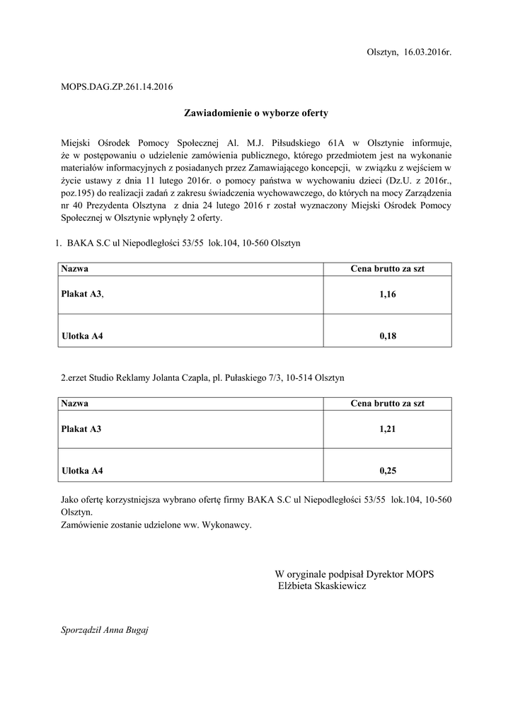 Olsztyn, 16.03.2016r. MOPS.DAG.ZP.261.14.2016 Zawiadomienie o wyborze oferty Miejski Ośrodek Pomocy Społecznej Al. M.J. Piłsudskiego 61A w Olsztynie informuje, że w postępowaniu o udzielenie zamówienia publicznego, którego przedmiotem jest na wykonanie materiałów informacyjnych z posiadanych przez Zamawiającego koncepcji, w związku z wejściem w życie ustawy z dnia 11 lutego 2016r. o pomocy państwa w wychowaniu dzieci (Dz.U. z 2016r., poz.195) do realizacji zadań z zakresu świadczenia wychowawczego, do których na mocy Zarządzenia nr 40 Prezydenta Olsztyna z dnia 24 lutego 2016 r został wyznaczony Miejski Ośrodek Pomocy Społecznej w Olsztynie wpłynęły 2 oferty. 1. BAKA S.C ul Niepodległości 53/55 lok.104, 10-560 Olsztyn Nazwa Cena brutto za szt Plakat A3, 1,16 Ulotka A4 0,18 2.erzet Studio Reklamy Jolanta Czapla, pl. Pułaskiego 7/3, 10-514 Olsztyn Nazwa Cena brutto za szt Plakat A3 1,21 Ulotka A4 0,25 Jako ofertę korzystniejsza wybrano ofertę firmy BAKA S.C ul Niepodległości 53/55 lok.104, 10-560 Olsztyn. Zamówienie zostanie udzielone ww. Wykonawcy. W oryginale podpisał Dyrektor MOPS Elżbieta Skaskiewicz Sporządził Anna Bugaj