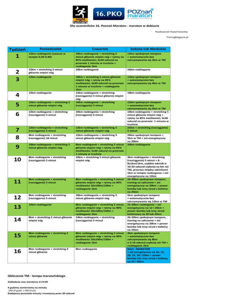 Dla uczestników 16. Poznań Maraton - maraton w debiucie Pozdrawiam Paweł Grzonka. Treningbiegacza.pl Tydzień Poniedziałek Czwartek 1 12km rozbieganie (zawsze w tempie 6:20-6:40) 2 3 12km + stretching 5 minut głównie mięśni nóg 4 12km rozbieganie 5 12km rozbieganie + stretching 5 minut głównie mięśni nóg 10km + stretching 5 minut głównie mięśni nóg + rytmy na 85% możliwości, 4x30 sekund na przerwie 1 minuta w truchcie + rozbieganie 1km 14km rozbieganie + stretching (rozciąganie) 5 minut głównie mięśni nóg 16km rozbieganie + stretching (rozciąganie) 5 minut 6 12km rozbieganie + stretching (rozciąganie) 5 minut 10km rozbieganie + stretching (rozciąganie) 5 minut 7 8 12km rozbieganie + stretching (rozciąganie) 5 minut 12km rozbieganie + stretching 5 minut głównie mięśni nóg 8km rozbieganie + stretching (rozciąganie) 10 minut 12km rozbieganie + stretching 5 minut głównie mięśni nóg 9 10km rozbieganie + stretching 5 minut głównie mięśni nóg 8km rozbieganie + stretching 5 minut głównie mięśni nóg + rytmy na 85% możliwości, 5x30 sekund na przerwie 1 minuta w truchcie 10km + stretching 5 minut głównie mięśni nóg 12km rozbieganie 10km rozbieganie + stretching 5 minut głównie mięśni nóg + rytmy na 85% możliwości, 3x30 sekund na przerwie 1 minuta w truchcie + rozbieganie 1km 10km rozbieganie 12km spokojnym tempem + automatycznie bez zatrzymywania się 2km w TM 12km spokojnym tempem + automatycznie bez zatrzymywania się 4km w TM 10 8km rozbieganie + stretching (rozciąganie) 5 minut 11 8km rozbieganie + stretching (rozciąganie) 5 minut 8km rozbieganie + stretching 5 minut głównie mięśni nóg + rytmy na 90% możliwości 10x100m/100m + rozbieganie 1km 12 8km rozbieganie + stretching (rozciąganie) 5 minut 18km rozbieganie + stretching 5 minut głównie mięśni nóg 13 12km rozbieganie 14 8km + stretching 5 minut głównie mięśni nóg 8km rozbieganie + stretching 5 minut głównie mięśni nóg + rytmy na 90% możliwości 10x100m/100m + rozbieganie 1km 14km rozbieganie + stretching (rozciąganie) 5 minut 15 8km rozbieganie + stretching 5 minut głównie 8km rozbieganie + stretching 5 minut głównie mięśni nóg + rytmy na 90% możliwości 10x100m/100m + rozbieganie 1km 16 8km rozbieganie + stretching 5 minut głównie 8km rozbieganie Obliczenie TM - tempa maratońskiego Zakładany czas maratonu 4:15:00 4 godziny zamieniamy na minuty 240 (4 godz. x 60minut) Dodajemy pozostałe minuty i mnożymy przez 30 sekund Sobota lub Niedziela 16km rozbieganie 18km rozbieganie 15km spokojnym tempem + automatycznie bez zatrzymywania się 5km w TM 10km rozbieganie + stretching 5 minut głównie mięśni nóg + rytmy na 85% możliwości, 5x30 sekund na przerwie 1 minuta w truchcie 25km + stretching (rozciąganie) 5 minut 20km spokojnym tempem + 5km w TM + żel energetyczny na 20km 20km rozbieganie 3km rozbieganie + stretching (rozciąganie) 5 minut + 68x1km/1km, szybkie odcinki o 10-20 sekund szybciej na km niż TM, przerwa między odcinkami 1km w tempie rozbiegania + żel energetyczny na 12km 26-30km spokojnym tempem, trening na zaliczenie + żel energetyczny na 20km + power bomba lub inny strzał z kofeiny na 25km 5km spokojnym tempem + automatycznie bez zatrzymywania się 12km w TM 25-30km rozbieganie + żel energetyczny na 12 i 20km + power bomba lub inny strzał kofeinowy na 20 lub 25km 26-30km spokojnym tempem, trening na zaliczenie + żel energetyczny na 20km + power bomba lub inny strzał z kofeiny na 25km 4km spokojnym tempem + automatycznie bez zatrzymywania się 8km o 5-10 sekund szybciej niż TM + rozbieganie 2km Start - MARATON + żel energetyczny na 10, 15, 20, 25, 30 i 35km + power bomba lub inny strzał z kofeiny na 25 i 35km 240 + 15 = 255 255x60 = 15300 Sekundy dzielimy przez 42,195 15300/42,195 = 298,6 Uzyskany wynik zapisujemy w sekundach i zamieniamy na minuty 362,6/60 = 6 minut i 4 sekundy Uzyskany wynik zaokrąglamy 6:04 - tyle wynosi TM (tempo maratońskie) Przykład zastosowania TM w planie treningowym. 10km spokojnym tempem + automatycznie bez zatrzymywania się 10km w TM oznacza to: 10km pokonuję spokojnym tempem przeciętnego rozbiegania (załóżmy 6:30 na kilometr, co daje wynik 1:05:00 na 10km). Po minięciu 10 kilometra przyspieszam do TM, czyli drugą część treningu biegnę ze średnią prędkością 5:59 na kilometr (co daje wynik 59:50 na 10km). Łączny czas pokonania 20km wyniósł 2:04:50.