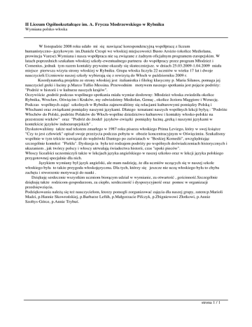 II Liceum Ogólnokształcące im. A. Frycza Modrzewskiego w Rybniku Wymiana polsko-włoska W listopadzie 2008 roku udało mi się nawiązać korespondencyjną współpracę z liceum humanistyczno--językowym im.Daniele Crespi we włoskiej miejscowości Busto Arsizio (okolice Mediolanu, prowincja Varese).Wymiana i nasza współpraca nie są związane z żadnym oficjalnym programem europejskim. W latach poprzednich szukałam włoskiej szkoły-ewentualnego partnera do współpracy przez program Młodzież i Comenius, jednak tym razem kontakty prywatne okazały się skuteczniejsze. w dniach 25.03.2009-1.04.2009 miała miejsce pierwsza wizyta strony włoskiej w Rybniku. Grupa włoska liczyła 22 uczniów w wieku 17 lat i dwoje nauczycieli.Uczniowie naszej szkoły wybierają się z rewizytą do Włoch w październiku 2009 r. Koordynatorką projektu ze strony włoskiej jest italianistka i filolog klasyczny p. Maria Silanos, pomaga jej nauczyciel greki i łaciny p.Marco Tullio Messina. Przewodnim motywem naszego spotkania jest pojęcie podróży: "Podróż w historii i w kulturze naszych krajów". Oczywiście ,podróż podczas wspólnego spotkania miała wymiar dosłowny: Młodzież włoska zwiedziła okolice Rybnika, Wrocław, Oświęcim i Kraków, my odwiedzimy Mediolan, Genuę , okolice Jeziora Maggiore i Wenecję. Podczas wspólnych zajęć szkolnych w Rybniku zajmowaliśmy się relacjami kulturowymi pomiędzy Polską i Włochami oraz związkami pomiędzy naszymi językami. Dlatego tematami naszych wspólnych lekcji byłyą : "Podróże Włochów do Polski, podróże Polaków do Włoch-wspólne dziedzictwo kulturowe i kontakty włosko-polskie na przestrzeni wieków" oraz "Podróż do źrodeł języków-związki pomiędzy łaciną ,greką i naszymi językami w kontekście języków indoeuropejskich" . Dyskutowaliśmy także nad tekstem zmarłego w 1987 roku pisarza włoskiego Prima Leviego, który w swej książce "Czy to jest człowiek" opisał swoje przeżycia podczas pobytu w obozie koncentracyjnym w Oświęcimiu. Szukalismy wspólnie w tym tekście nawiązań do wędrówki Dantego po zaświatach w "Boskiej Komedii", uwzględniając szczególnie kontekst "Piekła". Dyskusja ta była też rodzajem podróży po wspólnych doświadczeniach historycznych i ukazaniem , jak twórcy polscy i włoscy utrwalają świadectwa historii, czas "epoki pieców". Włoscy licealiści uczestniczyli także w lekcjach języka angielskiego w naszej szkoleo oraz w lekcji języka polskiego przygotownej specjalnie dla nich. Językiem wymiany był język angielski, ale mam nadzieję, że dla uczniów uczących się w naszej szkole włoskiego była to także przygoda włoskojęzyczna. Dla tych, którzy się jeszcze nie uczą włoskiego była to chyba zachęta i stworzenie motywacji do nauki . Dziękuję serdecznie wszystkim uczniom biorącym udzial w wymianie, za otwartość , gościnność.Szczególnie dziękuję także rodzicom-gospodarzom, za ciepło, serdeczność i dyspozycyjność oraz pomoc w organizacji przedsięwzięcia. Podziękowania należą się też nauczycielom, ktorzy pomogli zorganizować zajęcia dla naszej grupy, zatem:p.Marioli Madzi, p.Hannie Skowrońskiej, p.Barbarze Leftih, p.Małgorzacie Pifczyk, p.Zbigniewowi Złotkowi, p.Annie Szołtys-Górce, p.Annie Trybuś. strona 1 / 1