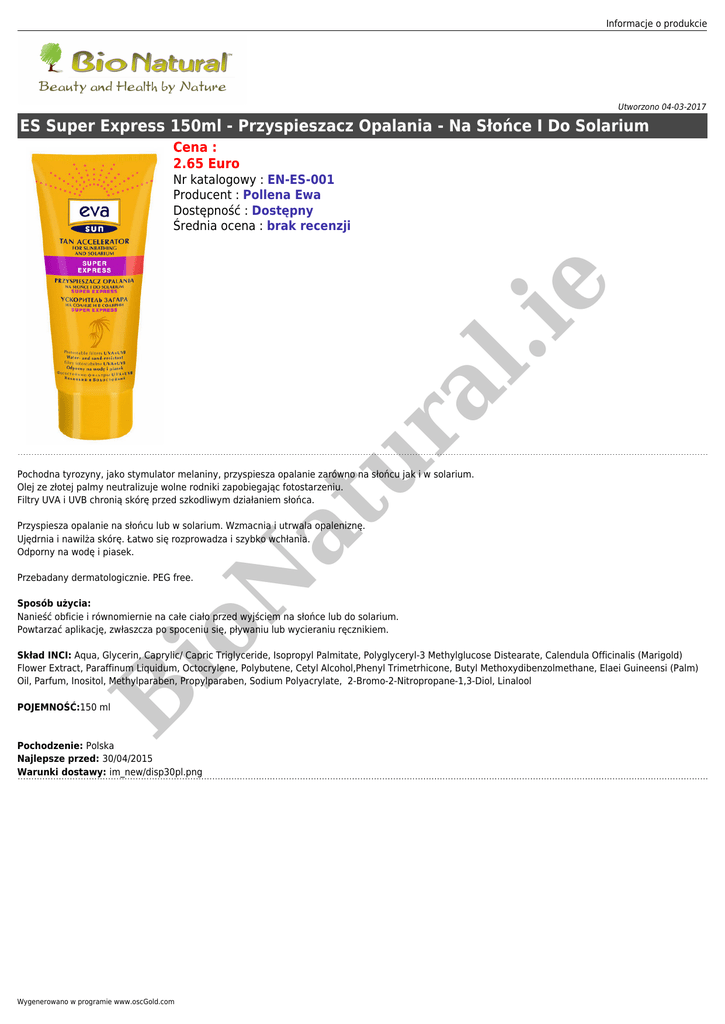 Informacje o produkcie Utworzono 04-03-2017 ES Super Express 150ml - Przyspieszacz Opalania - Na Słońce I Do Solarium Cena : 2.65 Euro ur al .ie Nr katalogowy : EN-ES-001 Producent : Pollena Ewa Dostępność : Dostępny Średnia ocena : brak recenzji N at Pochodna tyrozyny, jako stymulator melaniny, przyspiesza opalanie zarówno na słońcu jak i w solarium. Olej ze złotej palmy neutralizuje wolne rodniki zapobiegając fotostarzeniu. Filtry UVA i UVB chronią skórę przed szkodliwym działaniem słońca. Przyspiesza opalanie na słońcu lub w solarium. Wzmacnia i utrwala opaleniznę. Ujędrnia i nawilża skórę. Łatwo się rozprowadza i szybko wchłania. Odporny na wodę i piasek. Przebadany dermatologicznie. PEG free. io Sposób użycia: Nanieść obficie i równomiernie na całe ciało przed wyjściem na słońce lub do solarium. Powtarzać aplikację, zwłaszcza po spoceniu się, pływaniu lub wycieraniu ręcznikiem. B Skład INCI: Aqua, Glycerin, Caprylic/ Capric Triglyceride, Isopropyl Palmitate, Polyglyceryl-3 Methylglucose Distearate, Calendula Officinalis (Marigold) Flower Extract, Paraffinum Liquidum, Octocrylene, Polybutene, Cetyl Alcohol,Phenyl Trimetrhicone, Butyl Methoxydibenzolmethane, Elaei Guineensi (Palm) Oil, Parfum, Inositol, Methylparaben, Propylparaben, Sodium Polyacrylate, 2-Bromo-2-Nitropropane-1,3-Diol, Linalool POJEMNOŚĆ:150 ml Pochodzenie: Polska Najlepsze przed: 30/04/2015 Warunki dostawy: im_new/disp30pl.png Wygenerowano w programie www.oscGold.com