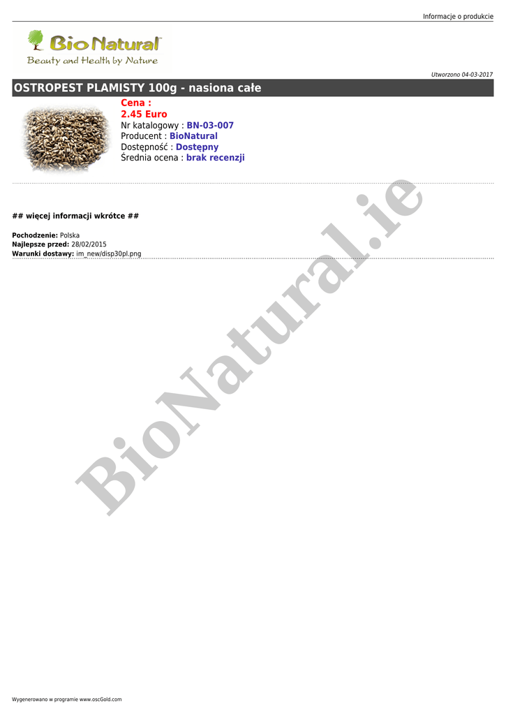 Informacje o produkcie Utworzono 04-03-2017 OSTROPEST PLAMISTY 100g - nasiona całe Cena : 2.45 Euro .ie Nr katalogowy : BN-03-007 Producent : BioNatural Dostępność : Dostępny Średnia ocena : brak recenzji B io N at ur Pochodzenie: Polska Najlepsze przed: 28/02/2015 Warunki dostawy: im_new/disp30pl.png al ## więcej informacji wkrótce ## Wygenerowano w programie www.oscGold.com