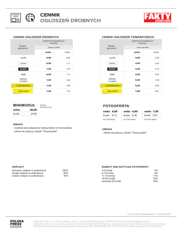 CENNIK OGŁOSZEŃ DROBNYCH CENNIK OGŁOSZEŃ DROBNYCH CENNIK OGŁOSZEŃ TOWARZYSKICH DZIEŃ WYDAWNICZY PIĄTEK Rodzaj ogłoszenia DZIEŃ WYDAWNICZY PIĄTEK Rodzaj ogłoszenia Cena za linię netto brutto zwykłe 0,80 0,98 ramka 0,90 kontra Cena za linię netto brutto zwykłe 4,00 4,92 1,11 ramka 4,50 5,54 1,00 1,23 kontra 5,00 6,15 bold 0,90 1,11 bold 4,50 5,54 HASŁO z hasłem 1,20 1,48 HASŁO z hasłem 6,00 7,38 z zakreślaczem 1,30 1,60 z zakreślaczem 6,50 8,00 żółta kartka 1,40 1,72 żółta kartka 7,00 8,61 MINIMODUŁ netto20,00 FOTOOFERTA Wymiar 40,5x19,4 mm brutto24,60 netto 6,60 netto6,80 netto7,00 brutto 8,12 brutto8,36 brutto8,61 do 2 linii tekstu do 4 linii tekstu do 6 linii tekstu UWAGA -m ożliwe jest połączenie maksymalnie 8 minimodułów - oferta nie dotyczy rubryki "Towarzyskie" UWAGA - oferta nie dotyczy rubryki "Towarzyskie" DOPŁATY RABATY (NIE DOTYCZĄ FOTOOFERT) pierwsze miejsce w podrubryce drugie miejsce w podrubryce trzecie miejsce w podrubryce 100% 50% 30% 3-5 emisji 6-10 emisji 11-15 emisji 16-25 emisji powyżej 25 emisji 5% 8% 11% 15% 20% Ceny w PLN, obowiązują od 1 stycznia 2016 r. Polska Press Sp. z o.o., Fakty Jasielskie, Jasło, ul. Kościuszki 37. Reklama: tel. 691-453-914, e-mail: [email protected] Polska Press Sp. z o.o. z siedzibą przy ulicy Domaniewskiej 45, 02-672 Warszawa, zarejestrowana w Sądzie Rejonowym dla m.st. Warszawy, XIII Wydział Gospodarczy Krajowego Rejestru Sądowego, KRS 0000002408, NIP: 522-01-03-609, Kapitał zakładowy: 42 000 000,00 zł.
