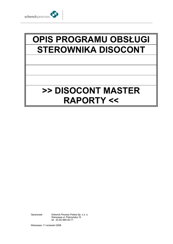 __________________________________________________________________________________________ OPIS PROGRAMU OBSŁUGI STEROWNIKA DISOCONT >> DISOCONT MASTER RAPORTY << Opracował: Schenck Process Polska Sp. z o. o. Warszawa ul. Połczyńska 10 tel . (0-22) 665-40-11 Warszawa, 11 wrzesień 2008 __________________________________________________________________________________________ SPIS TREŚCI Wstęp ................................................................................................................................... 4 Opis systemu ................................................................................................................ 5 Ekran główny .............................................................................................................. 7 Ekran archiwum........................................................................................................ 9 Konfiguracja programu ................................................................................... 11 Wymagania programu ...................................................................................... 12 3 __________________________________________________________________________________________ Wstęp Instalacja systemu oparta jest na komputerze sterowniku Disocont Master oraz 3 (lub więcej) sterownikach (modułach obsługujących wagi dozujące). Disocont Master obsługuje wagi składników wejściowych, dane gromadzone są w systemie komputerowym, możliwy jest późniejszy wydruk raportów oraz pobieranie wyeksportowanych danych. 4 __________________________________________________________________________________________ Opis systemu System dla zaprojektowany jest jak na poniższym rysunku: Komputer PC z monitorem i drukarką Ethernet Disocont Master RS-485 Disocont 1 RS-232 RS-485 Ethernet Disocont n Komputer PC systemu rys.1 Schemat systemu Do sterownika Disocont Master podłączone są sterowniki Disocont (na obecną chwilę 3 sterowniki). Podłączony jest także poprzez RS-232 oraz łącze ethernetowe zewnętrzny komputer PC gromadzący wyniki i drukujący raporty. Program w sterowniku Disocont Master steruje obsługą ważeń, przykładowy ekran wygląda jak na poniższym obrazku. rys.2 Ekran Disocont Mastera 5 __________________________________________________________________________________________ Na komputerze PC zainstalowany jest program Disocont Master Raporty, przykładowy ekran przedstawiono na rysunku poniżej rys.3 Ekran Disocont Master Raporty Program Disocont Master Raporty posiada dwa przyciski Wagi i Archiwum umieszczone na w małym oknie. Po kliknięciu w Wagi ukazuje się okienko na środku ekranu. Lokalizację tego okienka można zmienić przesuwając go w inne miejsce i klikając w to okienko (poza przyciskami), po ponownym uruchomieniu ukaże się w zapisanym miejscu z zapisaną szerokością i wysokością 6 __________________________________________________________________________________________ Ekran główny Program gromadzi dane wag oraz zapisuje je do bazy danych. W każdej chwili możliwy jest podgląd aktualnie rozpoznanego produktu i materiałów. Należy kliknąć na przycisk Wagi widoczny na rys.2, zostanie otwarte okno widoczne poniżej. rys.3 Ekran wyświetlający brak komunikacji Na rys.3 widać wypisany na czerwono tekst o braku komunikacji oraz 8 wag ich przepływ i materiał. W przypadku przywrócenia komunikacji ekran wag będzie wyglądał jak na poniższym rysunku. rys.4 Ekran po nawiązaniu komunikacji 7 __________________________________________________________________________________________ W przypadku gdy wybrana receptura w Disocont Masterze będzie inna niż dotychczasowa w programie raportującym nazwa będzie migać na czerwono tak jak na rysunku powyżej. Aby zatwierdzić zmianę receptury należy kliknąć na przycisk „recepta ->” zostanie wtedy zatwierdzona zmiana receptury oraz zapisana dla raportu receptur. 8 __________________________________________________________________________________________ Ekran archiwum Na powyższym ekranie po naciśnięciu Archiwum (można go też kliknąć na startowym oknie programu) można otworzyć ekran archiwum który umożliwia zrobienie raportów oraz plików danych. Są dostępne dwa raporty: archiwum ważeń oraz zmian receptur. Ponadto wygenerowane pliki raportów zapamiętywane są jako pliki *.html i *.txt w katalogu widzianym w sieci komputerowej jako \\raporty. Na poniższym rysunku pokazano ekran archiwum. rys.5 Ekran archiwum Dla ułatwienia obsługi dodano przyciski ostatniej zmiany doby tygodnia oraz miesiąca, a także bieżącej zmiany, doby, tygodnia i miesiąca. Po naciśnięciu data początkowa i końcowa przyjmie wybrane wartości, oczywiście można ustawić inny zakres dat i godzin dla wygenerowania raportu. Po naciśnięciu Szukaj zostanie wygenerowany wybrany raport: Przykładowy raport archiwum pokazano poniżej. rys.6 Przykładowy ekran raportu archiwum 9 __________________________________________________________________________________________ W raporcie pokazano nazwy oraz składniki receptur aktywnych w wybranym okresie, zmierzoną ilość z podziałem na materiały użyte do receptury oraz sumaryczną ilość zmierzonych materiałów. Po wygenerowaniu raportu dane są wyeksportowane do plików tekstowych które mogą zostać zaimportowane do systemu nadrzędnego. Pliki zapamiętywane są w strukturze katalogu \\raporty\(rok)\(miesiąc)\(dzień) Przykładowy raport receptur pokazano poniżej. rys.7 Przykładowy ekran raportu receptur Raport ten pokazuje datę i godzinę zmiany receptury, nazwę oraz jej składniki i wartości przepływu. 10 __________________________________________________________________________________________ Konfiguracja programu W katalogu programu zapisany jest plik konfiguracyjny konfiguracja.ini. Przykładową zawartość wypisano poniżej: [serwis] port_COM=1 ilosc_wag=8 parametry_portu=9600,E,8,1 disocont_pliku_danych=19