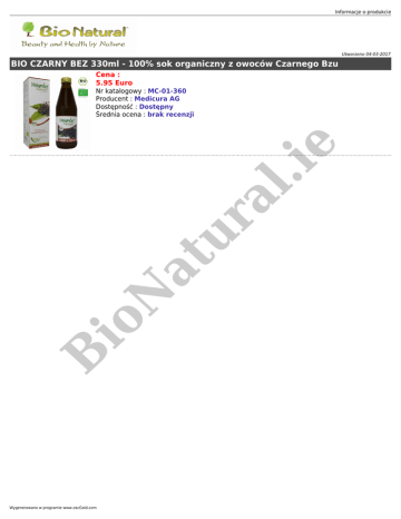 Informacje o produkcie Utworzono 04-03-2017 BIO CZARNY BEZ 330ml - 100% sok organiczny z owoców Czarnego Bzu Cena : 5.95 Euro B io N at ur al .ie Nr katalogowy : MC-01-360 Producent : Medicura AG Dostępność : Dostępny Średnia ocena : brak recenzji Wygenerowano w programie www.oscGold.com Organiczny sok z Czarnego Bzu - 100% czystego soku, wyciskanego z owoców pochodzących z certyfikowanych upraw ekologicznych. BIO SOK Z CZARNEGO BZU Wspomaganie systemu immunologicznego Owoce dzikiego bzu rosną na krzewach o tej samej nazwie. Nie nadają się do spożycia na surowo. Nasiona, zielone części rośliny i niedojrzałe owoce zawierają glukozyd, który wytrąca cyjanowodór i powoduje, że te części rośliny są trujące. Przez przecieranie jagód i gotowanie soku trujące substancje są eliminowane. Sok z owoców dzikiego bzu jest bogaty w potas i zawiera witaminę C. Za intensywną barwą owoców odpowiada barwnik antocyjan. Sok z dzikiego bzu tradycyjnie stosowany jest przy zwiększonym ryzyku wystąpienia infekcji. Owoce wykorzystywane do produkcji soku pochodzą z certyfikowanych upraw ekologicznych. Zawartość: 330ml w butelce szklanej. Działanie: Czarny bez działa napotnie, moczopędnie, poprawia elastyczność naczyń krwionośnych oraz stanowi bogate źródło wymiataczy wolnych rodników. Silny efekt napotny wywołany jest pobudzeniem ośrodka regulującego wydzielanie potu i powoduje szybkie obniżanie podwyższonej temperatury. Czarny bez, zażywany regularnie w początkowym okresie infekcji wirusowych, łagodzi dolegliwości, obniża gorączkę i skraca okres choroby. Podaje się jako środek wzmacniający i witalizujący, jako środek lekko napotny przy przeziębieniach, zapaleniu migdałków i grypie. Podczas słoty jesienno-zimowej spożywamy sok w postaci gorącej. Można również stosować jako środek uśmierzający ból, np. migrena. Działa też jako środek moczopędny. Skład: Wartości odżywcze: Wartość energetyczna < 0,1 g .ie 100% sok z owoców Czarnego Bzu, bez dodatku cukru, sztucznych barwników i konserwantów. Wyciskany z owoców pochodzących z certyfikowanych upraw ekologicznych. < 0,1 g < 0,1 g w 100 ml w 30 ml 36 Kcal 10,8 Kcal 1g Węglowodany 7g - w tym cukier 7g Tłuszcz - w tym nasycone kwasy tłuszczowe Powyższe wartości mogą nieznacznie odbiegać ze względu na naturalne pochodzenie surowca. 2,1 g 2,1 g < 0,1 g ur Sposoby stosowania 0,3 g al Proteiny Pić 30 ml dziennie, czystego soku lub rozcieńczonego wodą lub innym sokiem. Przed użyciem wstrząsnąć. Po otwarciu trzymać w chłodnym miejscu, spożyć w krótkim czasie. Dodatkowe informacje na temat właściwości Czarnego Bzu INFORMACJE OGÓLNE N at Czarny bez (Sambucus nigra), zwany też dzikim bzem jest krzewem występującym w naszym rejonie pospolicie. Od tysiącleci związany jest z kulturą ludów zamieszkujących teren Europy. Dawni Słowianie cenili go, jako niezastąpiony środek oczyszczający z flegmy, śluzu i wilgoci. Ze względu na jego rozgrzewające i przeciwgorączkowe działanie używano go podczas przeziębień. Czarny bez działa napotnie, moczopędnie, poprawia elastyczność naczyń krwionośnych. Silny efekt napotny wywołany jest pobudzeniem ośrodka regulującego wydzielanie potu i powoduje szybkie obniżanie podwyższonej temperatury. Któż z nas nie cierpiał z powodu przeziębień. Są one plagą szczególnie w sezonie jesienno zimowym i chociaż nie uważa się ich za ciężką chorobę, powodują wiele nieprzyjemnych dolegliwości. Sięgamy wówczas po aspirynę i inne syntetyczne pochodne salicylanów, co pomaga jedynie na krótko i nie wpływa istotnie na przebieg choroby. Tym bardziej, że istnieje duża grupa chorych, dla których aspiryna i jej pochodne są wręcz przeciwwskazane. Znamy jej niekorzystny wpływ na przebieg choroby wrzodowej, w której nasilenie dolegliwości także pojawia się jesienią. Coraz częściej mówi się o uczuleniach na salicylany, o astmie aspirynozależnej. Tymczasem w arsenale środków naturalnych mamy znakomity produkt, który nie tylko łagodzi objawy i przyspiesza zdrowienie, ale zastosowany odpowiednio wcześnie zapobiega przeziębieniom . Zażywany regularnie w początkowym okresie infekcji wirusowych, łagodzi ich dolegliwości. W sezonie gryp i przeziębień czarny bez stanowi znakomitą alternatywę dla aspiryny. io Kwiaty dzikiego bzu zawierają olejki eteryczne, śluzy, związki wapnia, potasu, sodu, glinu i żelaza, glikozydy cyjanogenne, saponiny triterpenowe, flawonoidy (rutyna, kwercetyna, estragalina), garbniki. Owoce zawierają witaminy (A, B1, B2, C i J), antocyjany, olejki eteryczne, garbniki, glikozydy cyjanogenne (sambunigryna), pektyny, kwasy organiczne (octowy, jabłkowy, walerianowy, winowy i benzoesowy). Owoce działają łagodnie przeczyszczająco, moczopędnie, napotnie, przeciwbólowo, odtruwająco. Podaje się jako środek witaminizujący i wzmacniający, jako środek lekko napotny przy przeziębieniach, zapaleniu migdałów i grypie. INFORMACJE DODATKOWE B Organiczne soki Medicura - zdrowy początek dnia Charakteryzując w pełni znaczenie słowa "zdrowie", mówimy o stanie całkowitej sprawności fizycznej i psychicznej oraz komfortu społecznego, a nie tylko o braku choroby lub niepełnosprawności. (Światowa Organizacja Zdrowia) Aby wesprzeć twoje dobre samopoczucie oraz ogólną kondycję fizyczną i psychiczną, firma Medicura Naturprodukte AG, postanowiła wprowadzić na rynek szereg odżywczych soków organicznych produkowanych z kontrolowanych upraw owoców egzotycznych. Ta ekologiczna linia spełnia oczekiwania konsumentów poszukujących wysokiej jakości naturalnych produktów o właściwościach prozdrowotnych. Ludzie chcą wiedzieć, skąd pochodzą produkty, które spożywają każdego dnia. Oczekują przejrzystych i czytelnych zasad wprowadzania produktów do obrotu, gwarantujących najwyższą jakość i czystość produktów spożywczych. Jednocześnie oczekuj