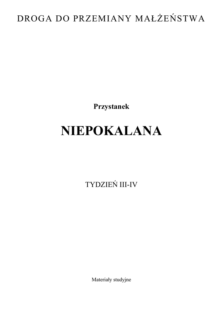 DROGA DO PRZEMIANY MAŁŻEŃSTWA Przystanek NIEPOKALANA TYDZIEŃ III-IV Materiały studyjne Opracowała Jolanta Prokopiuk Wydanie 1 wrzesień 2007 TYDZIEŃ III TAJEMNICA KOŚCIOŁA MATKI Niepokalana Katecheza Tydzień III Trzeci tydzień jest zaproszeniem, aby wejść w tajemnicę Kościoła Matki, gdzie wzorem i modelem jest Maryja i Jej oblubieńcze oddanie Jezusowi. Akt konstytutywny Ruchu Światło-Życie tak to streszcza: wyznajemy także, że zjednoczenie się z Tobą w tej postawie oblubieńczego oddania się Chrystusowi jest i pozostanie na zawsze jedyną, prawdziwą i najgłębszą zasadą żywotności i płodności Kościoła. Kościół o tyle wraz z Tobą będzie Kościołem Matką, o ile w poszczególnych swoich członkach będzie wraz z Tobą Oblubienicą oddaną Panu w wierze i miłości. Każdy członek Kościoła ma być na wzór Maryi oddany Chrystusowi w sposób osobowy przez wiarę i miłość. To przyjęcie Chrystusa w postawie oblubienicy jest możliwe tylko dzięki Duchowi Świętemu. Na tym polega nie tylko bycie w Kościele, przynależność do niego, ale bycie Kościołem. ISTOTA KOŚCIOŁA ZJEDNOCZENIE Z JEZUSEM OBLUBIEŃCZOŚĆ Charyzmat maryjny jest dla całego zespołu posługującego zarówno na rekolekcjach jak i w parafii swoistym „zmysłem” wiary, który ustrzeże ich przed spłyceniem tego dzieła i pozwoli na zachowanie tego co jest istotne w charyzmacie. Proces budowania, rozwoju Kościoła jest równoznaczny z rozwojem i wychowaniem nowego człowieka, ponieważ fundamentem Kościoła jest osoba. Kościół ma także swój wymiar horyzontalny z ludźmi. Tam, gdzie świadomość bycia z Jezusem w relacji oblubieńczej obejmuje grupę ludzi, powstaje żywy Kościół. Zrealizowana zostaje wspólnota braterska w Chrystusie i Jego Duchu. 4 Tydzień III Katecheza KOŚCIÓŁ WYMIAR PIONOWY Niepokalana WYMIAR POZIOMY RELACJA Z BRAĆMI W WIERZE RELACJA OBLUBIEŃCZA Z JEZUSEM 5 Niepokalana Tajemnica Kościoła Matki Tydzień III Pierwszy dzień MARYJA MODELEM (FIGURĄ) KOŚCIOŁA Twierdząc, że Maryja jest figurą Kościoła, Sobór nie zamierza zrównać Jej z figurami lub typami Starego Testamentu, lecz pragnie powiedzieć, że w Niej dokonuje się w całej pełni duchowa rzeczywistość, którą ona zapowiada i przedstawia. Stwierdziwszy, że Maryja jest „figurą Kościoła”, Sobór dodaje, iż jest Ona jego „najdoskonalszym wzorcem”, godnym naśladowania przykładem doskonałości. Jan Paweł II, Katechezy. Maryja, nr 58.3,4 A. Modlitwa poranna Wzywaj Ducha Świętego, aby prowadził cię drogami Maryi, Matki Jezusa. Oto ja służebnica Pańska, niech mi się stanie według twego słowa! Łk 1, 38 B. Studium Biblii Przeczytaj Łk 8, 16-21; J 4, 23-24. I. WIDZIEĆ 1. Nikt nie zapala lampy i nie przykrywa jej garncem ani nie stawia pod łóżkiem. Opisz w jaki sposób Maryja jest lampą, która postawiona jest na świeczniku. ........................................................................................ ........................................................................................ ........................................................................................ 2. Opisz w jaki sposób Maryja jest lampą według św. Jana Apostoła. ........................................................................................ ........................................................................................ ........................................................................................ II. OSĄDZIĆ 1. Co jest światłem w twojej osobie dla innych ludzi? ........................................................................................ ........................................................................................ 2. Duch i prawda kroczą wspólnymi ścieżkami. Ile jest w tobie prawdy, tyle jest Ducha Świętego. Jak wygląda ta rzeczywistość w twoim życiu? ........................................................................................ ........................................................................................ ........................................................................................ 6 Niepokalana Tajemnica Kościoła Matki Tydzień III III. DZIAŁAĆ Co wymaga zmian w twoim życiu, abyś był czcicielem Boga w Duchu i prawdzie? ........................................................................................ ........................................................................................ ........................................................................................ C. Modlitwa małżonków Podzielcie się Łk 2, 1-7. Nadszedł dla Maryi czas rozwiązania. Porodziła swego pierworodnego Syna, owinęła Go w pieluszki i położyła w żłobie. Czy nadszedł dla waszego małżeństwa czas rozwiązania, aby porodzić Jezusa? W jakich dziedzinach waszego małżeństwa Jezus się jeszcze nie narodził? 7 Niepokalana Tajemnica Kościoła Matki Tydzień III Drugi dzień MATER ECCLESIAE – MATKA KOŚCIOŁA „Nowe macierzyństwo Maryi”, jest zrodzone przez wiarę, jest owocem „nowej” miłości, która ostatecznie dojrzała w Niej u stóp Krzyża, poprzez uczestnictwo w odkupieńczej miłości Syna. W ekonomii łaski, sprawowanej pod działaniem Ducha Świętego, zachodzi szczególna odpowiedniość pomiędzy momentem Wcielenia Słowa a momentem narodzin Kościoła. Osobą, która łączy te dwa momenty, jest Maryja: Maryja w Nazarecie – i – Maryja w wieczerniku Zielonych Świąt. Jan Paweł II, Redemptoris mater, nr 24 A. Modlitwa poranna Przyzywaj Ducha Świętego, aby uzdolnił cię do bycia oblubienicą Jezusa, abyś był macierzyński i życiodajny. Duch Święty zstąpi na Ciebie i moc Najwyższego osłoni Cię. Dlatego też Święte, które się narodzi, będzie nazwane Synem Bożym. Łk 1, 35 B. Studium Biblii Przeczytaj Łk 1, 26-38; Dz 2, 1-4. 37-41. I. WIDZIEĆ 1. Jaki jest początek macierzyństwa Maryi? Co sprawia, ż