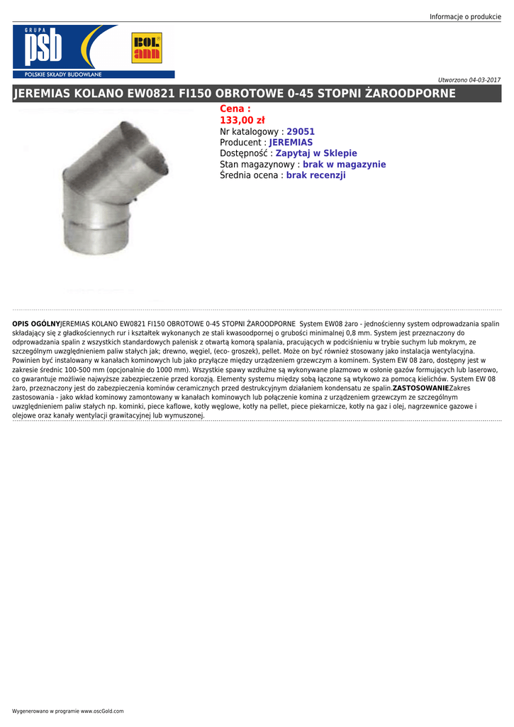 Informacje o produkcie Utworzono 04-03-2017 JEREMIAS KOLANO EW0821 FI150 OBROTOWE 0-45 STOPNI ŻAROODPORNE Cena : 133,00 zł Nr katalogowy : 29051 Producent : JEREMIAS Dostępność : Zapytaj w Sklepie Stan magazynowy : brak w magazynie Średnia ocena : brak recenzji OPIS OGÓLNYJEREMIAS KOLANO EW0821 FI150 OBROTOWE 0-45 STOPNI ŻAROODPORNE System EW08 żaro - jednościenny system odprowadzania spalin składający się z gładkościennych rur i kształtek wykonanych ze stali kwasoodpornej o grubości minimalnej 0,8 mm. System jest przeznaczony do odprowadzania spalin z wszystkich standardowych palenisk z otwartą komorą spalania, pracujących w podciśnieniu w trybie suchym lub mokrym, ze szczególnym uwzględnieniem paliw stałych jak; drewno, węgiel, (eco- groszek), pellet. Może on być również stosowany jako instalacja wentylacyjna. Powinien być instalowany w kanałach kominowych lub jako przyłącze między urządzeniem grzewczym a kominem. System EW 08 żaro, dostępny jest w zakresie średnic 100-500 mm (opcjonalnie do 1000 mm). Wszystkie spawy wzdłużne są wykonywane plazmowo w osłonie gazów formujących lub laserowo, co gwarantuje możliwie najwyższe zabezpieczenie przed korozją. Elementy systemu między sobą łączone są wtykowo za pomocą kielichów. System EW 08 żaro, przeznaczony jest do zabezpieczenia kominów ceramicznych przed destrukcyjnym działaniem kondensatu ze spalin.ZASTOSOWANIEZakres zastosowania - jako wkład kominowy zamontowany w kanałach kominowych lub połączenie komina z urządzeniem grzewczym ze szczególnym uwzględnieniem paliw stałych np. kominki, piece kaflowe, kotły węglowe, kotły na pellet, piece piekarnicze, kotły na gaz i olej, nagrzewnice gazowe i olejowe oraz kanały wentylacji grawitacyjnej lub wymuszonej. Wygenerowano w programie www.oscGold.com