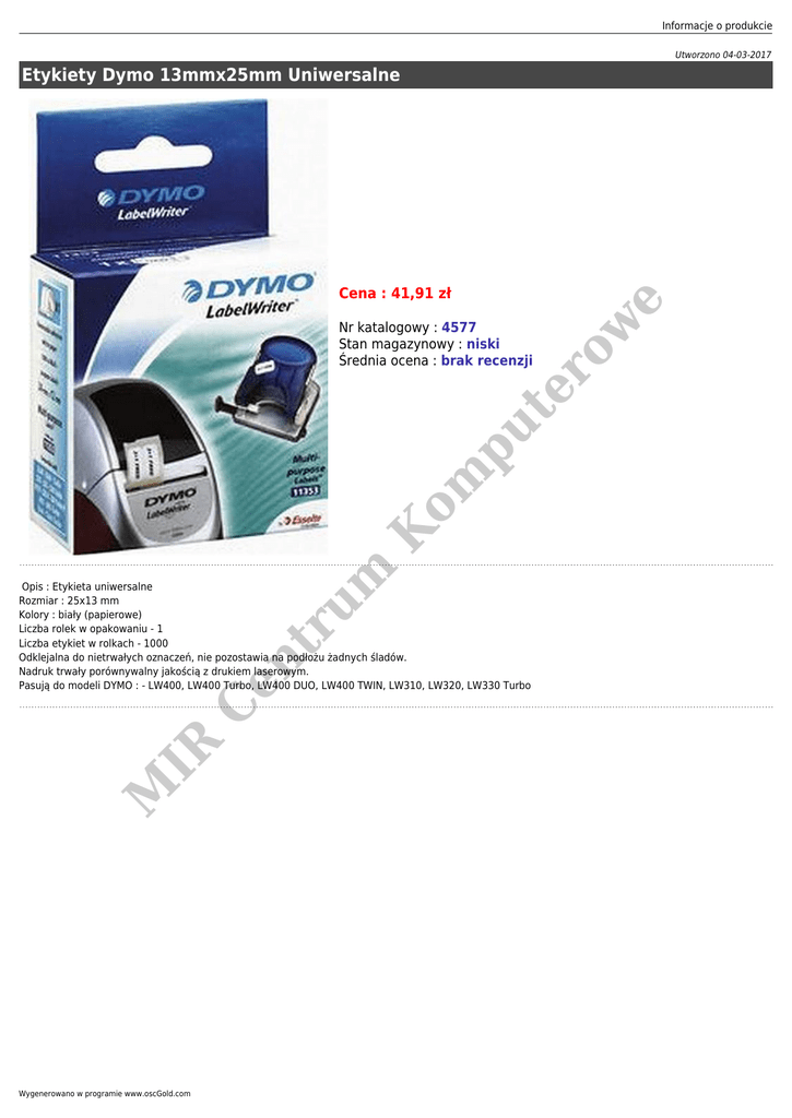 Informacje o produkcie Utworzono 04-03-2017 Etykiety Dymo 13mmx25mm Uniwersalne um K ow om pu te r Nr katalogowy : 4577 Stan magazynowy : niski Średnia ocena : brak recenzji e Cena : 41,91 zł M IR C en tr Opis : Etykieta uniwersalne Rozmiar : 25x13 mm Kolory : biały (papierowe) Liczba rolek w opakowaniu - 1 Liczba etykiet w rolkach - 1000 Odklejalna do nietrwałych oznaczeń, nie pozostawia na podłożu żadnych śladów. Nadruk trwały porównywalny jakością z drukiem laserowym. Pasują do modeli DYMO : - LW400, LW400 Turbo, LW400 DUO, LW400 TWIN, LW310, LW320, LW330 Turbo Wygenerowano w programie www.oscGold.com