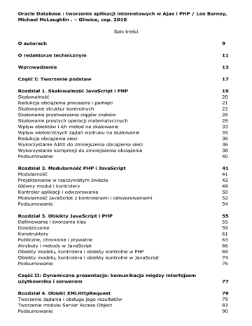 Oracle Database : tworzenie aplikacji internetowych w Ajax i PHP / Lee Barney, Michael McLaughlin . – Gliwice, cop. 2010 Spis treści O autorach 9 O redaktorze technicznym 11 Wprowadzenie 13 Część I: Tworzenie podstaw 17 Rozdział 1. Skalowalność JavaScript i PHP Skalowalność Redukcja obciąŜenia procesora i pamięci Skalowanie struktur kontrolnych Skalowanie przetwarzania ciągów znaków Skalowanie prostych operacji matematycznych Wpływ obiektów i ich metod na skalowanie Wpływ wielokrotnych Ŝądań wydruku na skalowanie Redukcja obciąŜenia sieci Wykorzystanie AJAX do zmniejszenia obciąŜenia sieci Wykorzystanie kompresji do zmniejszenia obciąŜenia Podsumowanie 19 20 21 22 26 28 33 35 36 36 38 40 Rozdział 2. Modularność PHP i JavaScript Modularność Projektowanie w rzeczywistym świecie Główny moduł i kontrolery Kontroler aplikacji i odwzorowania Modularność JavaScript z kontrolerami i odwzorowaniami Podsumowanie 41 41 42 49 50 52 54 Rozdział 3. Obiekty JavaScript i PHP Definiowanie i tworzenie klas Dziedziczenie Konstruktory Publiczne, chronione i prywatne Atrybuty i metody w JavaScript Obiekty modelu, kontrolera i obiekty kontrolne w PHP Obiekty modelu, kontrolera i obiekty kontrolne w JavaScript Podsumowanie 55 55 59 61 63 66 69 74 76 Część II: Dynamiczna prezentacja: komunikacja między interfejsem uŜytkownika i serwerem 77 Rozdział 4. Obiekt XMLHttpRequest Tworzenie Ŝądania i obsługa jego rezultatów Tworzenie modułu Server Access Object Podsumowanie 79 79 83 90 Rozdział 5. AJAX, zaawansowany HTML i komunikacja HTTP Tworzenie rozwijanych tabel HTML Nagłówki HTTP, błędy i komunikacja z serwerem Podsumowanie 93 93 102 108 Rozdział 6. Modyfikowanie DOM za pomocą JavaScript Obiektowy model dokumentu DOM Przeciągnij i upuść Biblioteka Obiekty kontrolne w PHP Obiekty kontrolne JavaScript Zapisywanie informacji z mechanizmu przeciągnij i upuść w bazie danych Podsumowanie 109 110 112 112 122 125 130 133 Część III: Zaawansowane zagadnienia dynamicznej prezentacji i komunikacji 135 Rozdział 7. Dostęp do danych z innych aplikacji Zdalne wywołania w PHP i HTTP-RPC Zdalne wywołania za pomocą klientów i usług XML-RPC z PEAR Podsumowanie 137 138 142 152 Rozdział 8. AJAX, tworzenie wykresów i proste przesyłanie danych Korzystanie z biblioteki SimplePlot Generowanie danych do wykresu Pobieranie danych za pomocą AJAX Podsumowanie 155 155 159 162 165 Rozdział 9. Przycisk cofania w AJAX Dodawanie śledzenia historii Korzystanie z historii iframe Sesje po stronie klienta Podsumowanie 167 167 175 177 179 Część IV: Tworzenie bardzo elastycznych, skalowalnych aplikacji 181 Rozdział 10. Sesje po stronie klienta i po stronie serwera Śledzenie i wykorzystywanie stanu logowania po stronie klienta Śledzenie i wykorzystywanie stanu logowania po stronie serwera Definiowanie i przechowywanie preferencji uŜytkownika między sesjami Wykorzystanie preferencji zapisanych przez uŜytkownika JSON Podsumowanie 183 183 192 197 201 204 205 Rozdział 11. Tworzenie modyfikowanych przez uŜytkowników serwisów typu mashup Tworzenie prostej strony typu mashup Wbudowanie mashupa do systemu obsługi danych medycznych Jak to działa Podsumowanie 207 208 211 214 218 Rozdział 12. Wielowymiarowa komunikacja: VOIP, IM oraz predefiniowane raporty Udostępnianie VOIP i IM Rozproszone, ukierunkowane, raportowane Podsumowanie 219 220 225 243 Dodatki 245 Dodatek A: Indeks znaczników HTML 247 Dodatek B: Wprowadzenie do PHP Historia i tło Czym jest PHP? Czym jest Zend? Tworzenie aplikacji internetowych Co z czym łączyć i dlaczego? Co Oracle wnosi do PHP? Dlaczego PHP 5 jest waŜny? Jak korzystać z PHP? Jak za pomocą PHP i OCI8 korzystać z bazy danych Oracle? Podsumowanie 255 256 256 257 257 257 258 259 259 278 299 Dodatek C: Wprowadzenie do administracji bazą danych Oracle Architektura baz danych Oracle Uruchamianie i wyłączanie bazy danych Oracle Operacje w systemie Linux Operacje w systemie Windows Uruchamianie i wyłączanie procesu nasłuchującego Korzystanie z programu SQL*Plus Interfejs wiersza poleceń Zmienne łączące Podsumowanie 301 302 307 307 311 314 319 321 323 323 Dodatek D: Wprowadzenie do SQL Typy danych Oracle SQL Język definicji danych DDL Zarządzanie tabelami i ograniczeniami Zarządzanie widokami Zarządzanie procedurami składowanymi Zarządzanie sekwencjami Zarządzanie własnymi typami Język pobierania danych DQL Zapytania Język modyfikacji danych DML Polecenia INSERT Polecenia UPDATE Polecenia DELETE Język sterowania danymi DCL Podsumowanie 325 326 329 330 333 334 335 336 338 338 342 342 344 345 345 346 Dodatek E: Wprowadzenie do PL/SQL Struktura bloków PL/SQL Zmienne, przypisania i operatory Struktury sterujące Instrukcje warunkowe Pętle Procedury składowane, funkcje składowane oraz pakiety Funkcje składowane Procedury Pakiety Wyzwalacze bazodanowe Wyzwalacze DDL Wyzwalacze DML Wyzwalacze "zamiast" Wyzwalacze systemowe lub bazodanowe Kolekcje Typ danych VARRAY Typ danych NESTED TABLE Tablica asocjacyjna Interfejs kolekcji Wykorzystanie pakietu DBMS_LOB Konfiguracja i weryfikacja środowiska dla typów LOB Zapis i odczyt typu danych CLOB Podsumowanie 347 348 352 354 355 358 360 361 364 366 369 370 370 372 372 373 374 375 376 379 379 379 381 386 Skorowidz 387 oprac. BPK