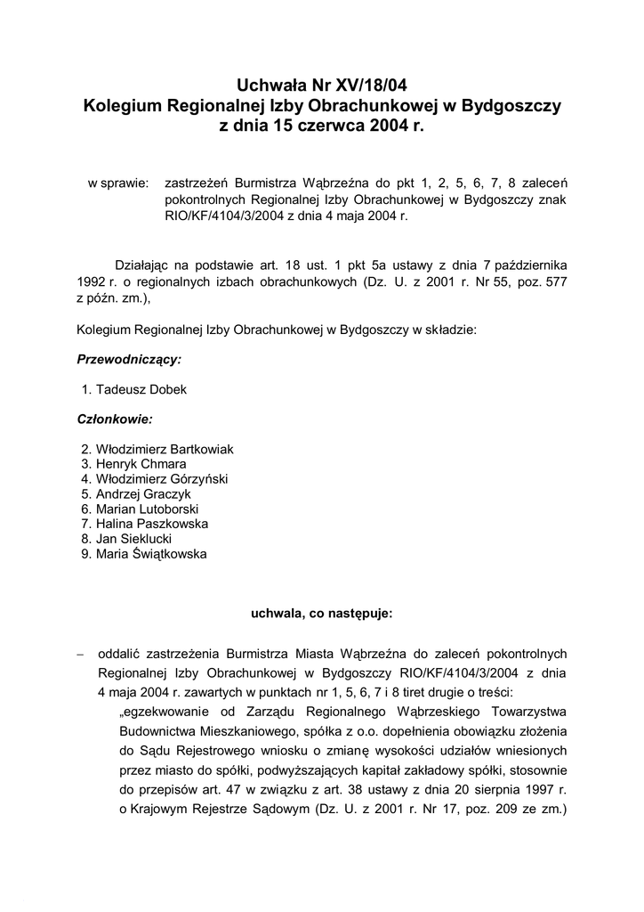 Uchwała Nr XV/18/04 Kolegium Regionalnej Izby Obrachunkowej w Bydgoszczy z dnia 15 czerwca 2004 r. w sprawie: zastrzeżeń Burmistrza Wąbrzeźna do pkt 1, 2, 5, 6, 7, 8 zaleceń pokontrolnych Regionalnej Izby Obrachunkowej w Bydgoszczy znak RIO/KF/4104/3/2004 z dnia 4 maja 2004 r. Działając na podstawie art. 18 ust. 1 pkt 5a ustawy z dnia 7 października 1992 r. o regionalnych izbach obrachunkowych (Dz. U. z 2001 r. Nr 55, poz. 577 z późn. zm.), Kolegium Regionalnej Izby Obrachunkowej w Bydgoszczy w składzie: Przewodniczący: 1. Tadeusz Dobek Członkowie: 2. 3. 4. 5. 6. 7. 8. 9. Włodzimierz Bartkowiak Henryk Chmara Włodzimierz Górzyński Andrzej Graczyk Marian Lutoborski Halina Paszkowska Jan Sieklucki Maria Świątkowska uchwala, co następuje: − oddalić zastrzeżenia Burmistrza Miasta Wąbrzeźna do zaleceń pokontrolnych Regionalnej Izby Obrachunkowej w Bydgoszczy RIO/KF/4104/3/2004 z dnia 4 maja 2004 r. zawartych w punktach nr 1, 5, 6, 7 i 8 tiret drugie o treści: „egzekwowanie od Zarządu Regionalnego Wąbrzeskiego Towarzystwa Budownictwa Mieszkaniowego, spółka z o.o. dopełnienia obowiązku złożenia do Sądu Rejestrowego wniosku o zmianę wysokości udziałów wniesionych przez miasto do spółki, podwyższających kapitał zakładowy spółki, stosownie do przepisów art. 47 w związku z art. 38 ustawy z dnia 20 sierpnia 1997 r. o Krajowym Rejestrze Sądowym (Dz. U. z 2001 r. Nr 17, poz. 209 ze zm.) a także art. 166 § 1 pkt 3, w związku z art. 168 i art. 188 § 3 ustawy z dnia 15 września 2000 r. kodeks spółek handlowych (Dz. U. Nr 94, poz. 1037 z późn. zm.)” − uznać zastrzeżenia Burmistrza Wąbrzeźna do zaleceń pokontrolnych zawartych w punktach nr 2 i 8 – tiret pierwsze o treści: „złożenie do Krajowego Rejestru Sądowego wniosku o dokonanie w prowadzonym przez Sąd rejestrze zmiany wysokości posiadanych przez miasto udziałów w Regionalnym Wąbrzeskim Towarzystwie Budownictwa Mieszkaniowego, spółka z o.o., w związku z wniesieniem przez miasto w 2003 roku nowych udziałów, podwyższających kapitał zakładowy spółki” Uzasadnienie W dniu 21 maja 2004 r. wpłynęło do Regionalnej Izby Obrachunkowej w Bydgoszczy pismo Burmistrza Miasta Wąbrzeźno, w którym Burmistrz złożył zastrzeżenia do wystąpienia pokontrolnego Izby z dnia 4 maja 2004 r. Kolegium Regionalnej Izby Obrachunkowej w Bydgoszczy, po zapoznaniu się z treścią pisma Burmistrza Miasta Wąbrzeźna i wystąpienia pokontrolnego wraz z zaleceniami oraz protokołem kontroli, a także po wysłuchaniu przedstawicieli jednostki kontrolowanej uczestniczących w posiedzeniu, oddaliło wniesione zastrzeżenia do wniosków nr 1, 5, 6, 7 i 8 tiret drugie uznając, że brak jest podstaw prawnych i merytorycznych do uwzględnienia odwołania. Jednocześnie Kolegium ustaliło, że wydane w punkcie 2 zalecenie przestrzegania w przyszłości zasady wyboru najkorzystniejszej oferty zgodnie z przepisami art. 2 pkt 8, art. 82 ust. 3 i art. 91 ustawy z dnia 29 stycznia 2004 r. Prawo zamówień publicznych (Dz. U. Nr 19, poz. 177) jest bezzasadne w kontek ście ustaleń kontroli, z których wynika, że naruszenie powyższej zasady nie nastąpiło na etapie udzielenia zamówienia na „Budowę basenu i modernizacji hali sportowej” a na etapie realizacji umowy. Ponadto, Kolegium Izby uznało, że zawarte w punkcie 8 tiret pierwsze zalecenie nie może być zrealizowane przez Burmistrza. Staranne wykonanie zarządu mieniem komunalnym poprzez złożenie do Krajowego Rejestru wniosku o dokonanie w prowadzonym przez Sąd rejestrze zmiany udziałów w Regionalnym Wąbrzeskim Towarzystwie Budownictwa Mieszkaniowego, spółka z o.o., w związku z wniesieniem przez miasto w 2003 roku nowych udziałów, podwyższających kapitał zakładowy spółki, nie mieści się w kompetencjach gminy, a jest obowiązkiem Spółki. Natomiast obowiązkiem miasta jest wyegzekwowanie od Zarządu Spółki złożenia do Sądu Rejestrowego tego wniosku. Z powyższych względów Kolegium uznało, że zachodzą podstawy do uwzględnienia zarzutów Burmistrza odnośnie punktu 2 zaleceń i częściowo punktu 8 i orzekło jak w sentencji. Przewodniczący Kolegium mgr Tadeusz Dobek Pouczenie: Od niniejszego rozstrzygnięcia nie przysługuje odwołanie.