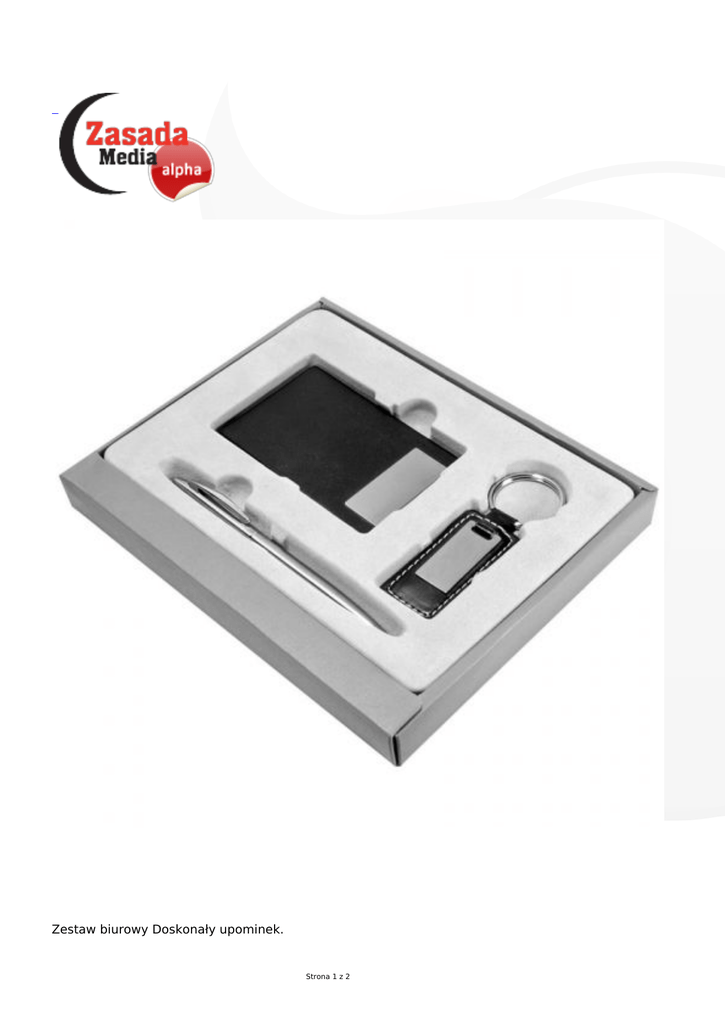 Zestaw biurowy Doskonały upominek. Strona 1 z 2 Wykonany z metalu i eko-skóry zestaw składający się z wizytownika, długopisu i breloka. Logo umieścimy na pudełku przy użyciu tampondruku Strona 2 z 2
