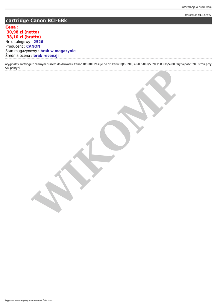 Informacje o produkcie Utworzono 04-03-2017 cartridge Canon BCI-6Bk Cena : 30,98 zł (netto) 38,10 zł (brutto) Nr katalogowy : 2526 Producent : CANON Stan magazynowy : brak w magazynie Średnia ocena : brak recenzji W IK O M P oryginalny zartridge z czarnym tuszem do drukarek Canon BCI6BK. Pasuje do drukarki: BJC-8200, i950, S800/S820D/S830D/S900. Wydajność: 280 stron przy 5% pokryciu. Wygenerowano w programie www.oscGold.com