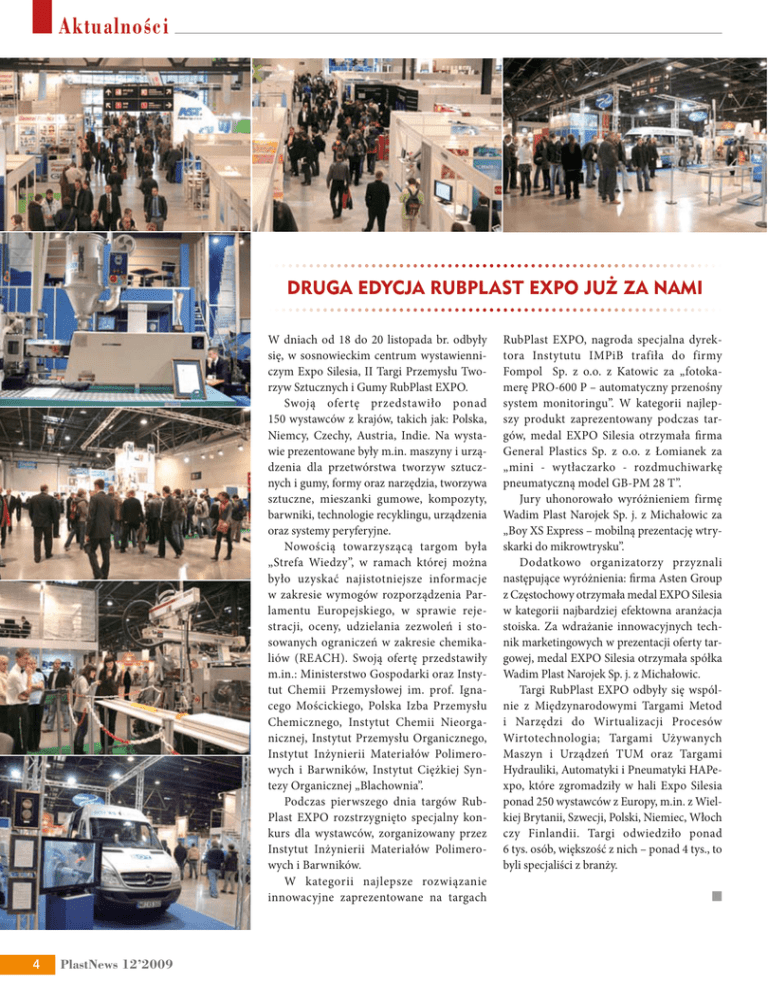 Aktualności Druga edycja RubPlast EXPO już za nami W dniach od 18 do 20 listopada br. odbyły się, w sosnowieckim centrum wystawienniczym Expo Silesia, II Targi Przemysłu Tworzyw Sztucznych i Gumy RubPlast EXPO. Swoją ofertę przedstawiło ponad 150 wystawców z krajów, takich jak: Polska, Niemcy, Czechy, Austria, Indie. Na wystawie prezentowane były m.in. maszyny i urządzenia dla przetwórstwa tworzyw sztucznych i gumy, formy oraz narzędzia, tworzywa sztuczne, mieszanki gumowe, kompozyty, barwniki, technologie recyklingu, urządzenia oraz systemy peryferyjne. Nowością towarzyszącą targom była „Strefa Wiedzy”, w ramach której można było uzyskać najistotniejsze informacje w zakresie wymogów rozporządzenia Parlamentu Europejskiego, w sprawie rejestracji, oceny, udzielania zezwoleń i stosowanych ograniczeń w zakresie chemikaliów (REACH). Swoją ofertę przedstawiły m.in.: Ministerstwo Gospodarki oraz Instytut Chemii Przemysłowej im. prof. Ignacego Mościckiego, Polska Izba Przemysłu Chemicznego, Instytut Chemii Nieorganicznej, Instytut Przemysłu Organicznego, Instytut Inżynierii Materiałów Polimerowych i Barwników, Instytut Ciężkiej Syntezy Organicznej „Blachownia”. Podczas pierwszego dnia targów RubPlast EXPO rozstrzygnięto specjalny konkurs dla wystawców, zorganizowany przez Instytut Inżynierii Materiałów Polimerowych i Barwników. W kategorii najlepsze rozwiązanie innowacyjne zaprezentowane na targach 4 PlastNews 12’2009 RubPlast EXPO, nagroda specjalna dyrektora Instytutu IMPiB trafiła do firmy Fompol Sp. z o.o. z Katowic za „fotokamerę PRO-600 P – automatyczny przenośny system monitoringu”. W kategorii najlepszy produkt zaprezentowany podczas targów, medal EXPO Silesia otrzymała firma General Plastics Sp. z o.o. z Łomianek za „mini - wytłaczarko - rozdmuchiwarkę pneumatyczną model GB-PM 28 T”. Jury uhonorowało wyróżnieniem firmę Wadim Plast Narojek Sp. j. z Michałowic za „Boy XS Express – mobilną prezentację wtryskarki do mikrowtrysku”. Dodatkowo organizatorzy przyznali następujące wyróżnienia: firma Asten Group z Częstochowy otrzymała medal EXPO Silesia w kategorii najbardziej efektowna aranżacja stoiska. Za wdrażanie innowacyjnych technik marketingowych w prezentacji oferty targowej, medal EXPO Silesia otrzymała spółka Wadim Plast Narojek Sp. j. z Michałowic. Targi RubPlast EXPO odbyły się wspólnie z Międzynarodowymi Targami Metod i Narzędzi do Wirtualizacji Procesów Wirtotechnologia; Targami Używanych Maszyn i Urządzeń TUM oraz Targami Hydrauliki, Automatyki i Pneumatyki HAPexpo, które zgromadziły w hali Expo Silesia ponad 250 wystawców z Europy, m.in. z Wielkiej Brytanii, Szwecji, Polski, Niemiec, Włoch czy Finlandii. Targi odwiedziło ponad 6 tys. osób, większość z nich – ponad 4 tys., to byli specjaliści z branży.