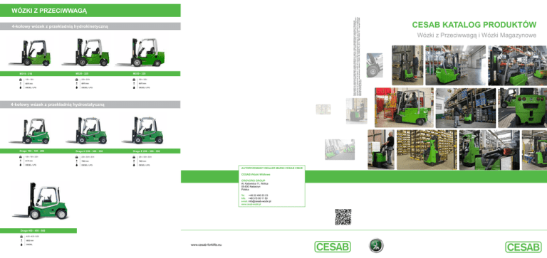Dane podane w powyższych materiałach zostały określone w oparciu o testy w standardowych warunkach. Wydajność wózka może się różnić w zależności od konfiguracji wózka, jego stanu jak również warunków w miejscu pracy. Dostępność i specyfikacja są uzależnione od regionu i mogą ulec zmianie bez wcześniejszej informacji. W celu uzyskania szczegółowych informacji skontaktuj się z autoryzowanym dealerem CESAB. BR_RANGE_PL_2013 / P&B RANGE V2 – Copyright CESAB Material Handling Europe. WÓZKI Z PRZECIWWAGĄ 4-kołowy wózek z przekładnią hydrokinetyczną M315 - 318 KG 1.5 t - 1.8 t M320 - 325 KG 2.0 t - 2.5 t M330 - 335 KG 3.0 t - 3.5 t 6970 mm 6970 mm 6970 mm DIESEL / LPG DIESEL / LPG DIESEL / LPG 4-kołowy wózek z przekładnią hydrostatyczną Drago 150 - 180 - 200 KG 1.5 t - 1.8 t - 2.0 t Drago H 250 - 300 - 350 KG 2.5 t - 3.0 t - 3.5 t Drago E 250 - 300 - 350 KG 2.5 t - 3.0 t - 3.5 t 6170 mm 7960 mm 7960 mm DIESEL / LPG DIESEL / LPG DIESEL / LPG AUTORYZOWANY DEALER MARKI CESAB CMHE CESAB Wózki Widłowe CROVORG GROUP Al. Katowicka 11, Wolica 05-830 Nadarzyn Polska Tel. +48 22 490 23 23 Info. +48 515 00 11 50 e-mail. [email protected] www.cesab-wozki.pl Drago 400 - 450 - 500 KG 4.0 t - 4.5 t - 5.0 t 6650 mm DIESEL www.cesab-forklifts.eu CESAB KATALOG PRODUKTÓW Wózki z Przeciwwagą i Wózki Magazynowe WÓZKI Z PRZECIWWAGĄ WÓZKI MAGAZYNOWE 3-kołowy wózek elektryczny Ręczny wózek paletowy BIT 800 - 1000 - 1200 KG 0.8 t - 1.0 t - 1.2 t B210 - 213 - 215 1.0 t - 1.25 t - 1.5 t KG B315 - 316 - 316L - 318 - 318L - 320 KG 1.5 t - 1.6 t - 1.8 t - 2.0 t 5965 mm 6470 mm 7470 mm 24V / 800 Ah 24V / 1000 Ah 48V / 750 Ah B415 - 416 - 416L - 418 - 418L - 420 KG 1.5 t - 1.6 t - 1.8 t - 2.0 t B620 - 625 - 625L - 630 - 630L - 635 2.0 t - 2.5 t - 3.0 t - 3.5 t KG Mak 400 - 450 - 500 KG 4.0 t - 4.5 t - 5.0 t 6500 mm 7450 mm 48V / 750 Ah 80V / 700 Ah 80V / 775 Ah Kompaktowy wózek elektyczny KG 1.6 t - 2.0 t KG 2.0 t - 2.3 t - 3.0 t KG Model 2.3 t dostepny także z niskimi widłami, w wersji z szybkim podnoszeniem i hamulcem ręcznym. Niskie widły w standardzie w modelu 2.0 t. i 2.0 t CE100HL - 100HLE KG 1.0 t S110 - 110S KG 810 mm Wersja ze stali nierdzewnej. i 1.0 t KG S110S: Regulowane podpory. 1.0 t - 1.2 t - 1.4 t KG i S212S KG 4755 mm Udżwig na widłach i raminach podporowych 2000 kg. Opcjonalni automatyczna regulacja wysokości. i Opcjonalnie dostepna platforma dla operatora. 1.2 t 4755 mm 24V / 300 Ah 24 V / 230 Ah 24 V / 63 Ah i 0.8 t 1580 mm 2000 mm Ręczne lub elektryczne podnoszenie nożycowe. S210 - 212 - 214 S208L 24 V / 300 Ah i Regulowane podpory. Opcjonalnie dostępna platforma dla operatora. Samobieżny wózek elektryczny 7470 mm cenTAURO 48 160L - 200L CE200ST CE200 - 230 - 300 i 4-kołowy wózek elektryczny Elektryczne wózki z masztem Wózki elektr. o wysokiej mocy cenTAURO 80 250 - 300 KG 2.5 t - 3.0 t B860 - 870 - 885 KG 6.0 t - 7.0 t - 8.5 t P113 KG P214 - 216 - 218 - 220 - 225 1.3 t KG 24V / 63 Ah 1.4 t - 1.6 t - 1.8 t - 2.0 t - 2.5 t P320 - 324 KG 24V / 300 Ah i Opcjonalnie dostępna platforma dla operatora dla modelu P220. i 2.0 t - 2.4 t S212L -214L KG 1.2 t - 1.4 t KG 1.2 t - 1.4 t - 1.6 t R314 - 316 - 318 - 320 - 325 KG 1.4 t - 1.6 t - 1.8 t - 2.0 t - 2.5 t 2100 mm 5400 mm 24V / 300 Ah 24 V / 300 Ah 24V / 425 Ah i System wstępnego podnoszenia. Opcjonalnie dostępna platforma dla operatora. (Obydwie widoczne na zdjęcu.) KG 1.35 t 6450 mm 8500 mm 12500 mm 48V / 840 Ah 80V / 735 Ah 80V / 1250 Ah 48 V / 620 Ah 48V / 930 Ah 24V / 425 Ah Dostępna także wersja chłodnicza z lub bez ogrzewanej kabiny, a także w wersji drive-in ze zwężaną kabiną. i System podwójnego paletowania, Na widłach 800 kg i ramionach 1200 kg oraz udźwig 2000 kg na widłach i ramionach podporowych. Opcjonalnie dostępna platforma dla operatora. S314S 5400 mm i 1.25 t - 1.6 t - 2.0 t KG 4755 mm 6860 mm Dostępna także wersja chłodnicza, również w wersji drive-in ze zwężaną kabiną. 1.0 t Dostępna wersja o zwiększonej wydajności (8.5 km/h). W P324 Dostepna wersja ze elektrycznym wspomaganiem sterowania. 6970 mm i KG S313 - 316 - 320 24V / 620 Ah Wózek wysokiego składowania - Reach Truck R212 - 214 - 216 S220D i Regulowane podpory. Dostępna także wersja piesza. (Bez platformy i dłuższym dyszlem.) i Dostępna wersja piesza. (Bez platformy i dłuższym dyszlem.) Legenda KG Ładowność i Wysokość podnoszenia Pojemność baterii Dodatkowe informacje Rodzaj paliwa N Siła pchania / ciągnięcia S313L - 316L - 320L KG 1.25 t - 1.6 t - 2.0 t 5400 mm 24V / 425 Ah i System wstępnego podnoszenia. Dostępna wersja piesza. (Bez platformy i dłuższym dyszlem.)
