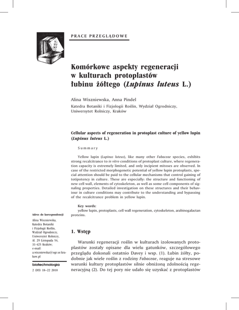 PRACE PRZEGL¥DOWE Komórkowe aspekty regeneracji w kulturach protoplastów ³ubinu ¿ó³tego (Lupinus luteus L.) Alina Wiszniewska, Anna Pindel Katedra Botaniki i Fizjologii Roœlin, Wydzia³ Ogrodniczy, Uniwersytet Rolniczy, Kraków Cellular aspects of regeneration in protoplast culture of yellow lupin (Lupinus luteus L.) Summary Yellow lupin (Lupinus luteus), like many other Fabaceae species, exhibits strong recalcitrance to in vitro conditions of protoplast culture, where regeneration capacity is extremely limited, and only incipient mitoses are observed. In case of the restricted morphogenetic potential of yellow lupin protoplasts, special attention should be paid to the cellular mechanisms that control gaining of totipotency in culture. These are especially: the structure and functioning of new cell wall, elements of cytoskeleton, as well as some cell components of signaling properties. Detailed investigation on these structures and their behaviour in culture conditions may contribute to the understanding and bypassing of the recalcitrance problem in yellow lupin. Adres do korespondencji Alina Wiszniewska, Katedra Botaniki i Fizjologii Roœlin, Wydzia³ Ogrodniczy, Uniwersytet Rolniczy, Al. 29 Listopada 54, 31-425 Kraków; e-mail: [email protected] 2 (89) 18–22 2010 Key words: yellow lupin, protoplasts, cell wall regeneration, cytoskeleton, arabinogalactan proteins. 1. Wstêp Warunki regeneracji roœlin w kulturach izolowanych protoplastów zosta³y opisane dla wielu gatunków, szczegó³owego przegl¹du dokonali ostatnio Davey i wsp. (1). £ubin ¿ó³ty, podobnie jak wiele roœlin z rodziny Fabaceae, reaguje na stresowe warunki kultury protoplastów silnie obni¿on¹ zdolnoœci¹ regeneracyjn¹ (2). Do tej pory nie uda³o siê uzyskaæ z protoplastów Komórkowe aspekty regeneracji w kulturach protoplastów ³ubinu ¿ó³tego (Lupinus luteus L.) tego gatunku materia³u do regeneracji w warunkach in vitro roœlin, ani nawet ich organów, chocia¿ notuje siê pewien postêp (3). Prowadzone badania maj¹ na celu prze³amanie istniej¹cych barier i wywo³anie pe³nej odpowiedzi morfogenetycznej. W sytuacji ograniczonego potencja³u regeneracyjnego, szczególn¹ uwagê nale¿y zwróciæ na komórkowe aspekty nabywania zdolnoœci podzia³owej przez protoplasty, takie jak odbudowa œciany komórkowej, organizacja cytoszkieletu czy te¿ rola pewnych sk³adników komórkowych, pe³ni¹cych funkcje sygnalne. Okreœlenie sekwencji zachodz¹cych procesów i ich ewentualnych zaburzeñ mo¿e przyczyniæ siê do zrozumienia problemu nadwra¿liwoœci protoplastów ³ubinu i podwy¿szenia ich aktywnoœci morfogenetycznej. 2. Œciana komórkowa W pierwszych badaniach nad kulturami protoplastów Nagata i Takebe (4) udowodnili, ¿e podzia³y s¹ uwarunkowane uprzedni¹ odbudow¹ œciany komórkowej. PóŸniej stwierdzano wielokrotnie, ¿e mitoza zachodzi tylko po prawid³owym odtworzeniu struktur œciany (5), dlatego te¿ niska czêstotliwoœæ podzia³ów protoplastów ³ubinu ¿ó³tego mo¿e byæ wynikiem zaburzeñ w tym procesie. Pojawianie siê sk³adników œciany na powierzchni b³ony komórkowej protoplastu jest u niektórych gatunków obserwowane ju¿ w ci¹gu kilku godzin od zawieszenia w po¿ywce, a po 2-4 dniach kultura staje siê zawiesin¹ komórek (6). U protoplastów hypokotylowych ³ubinu ¿ó³tego po 4 dniach kultury tylko u ok. 30% stwierdzono obecnoœæ fragmentów œciany komórkowej, w postaci pojedynczych w³ókien celulozy. W kolejnych dniach uk³ad fibryl celulozowych by³ nieregularny i chaotyczny. Z kolei szybsze tempo odtwarzania œciany przez protoplasty liœcieniowe wi¹za³o siê z powstawaniem na powierzchni protoplastów rozleg³ych obszarów bez celulozy, widocznych w postaci okr¹g³ych luk. W optymalnych warunkach, gdy œciana odbudowywana by³a wolniej, pasma celulozy uk³ada³y siê w pierœcienie obejmuj¹ce ca³y protoplast. U protoplastów uzyskanych z mezofilu liœci naprzemiennie wystêpowa³y obszary o stosunkowo grubym i cieñszym pok³adzie celulozy (badania w³asne). W œwietle najnowszych badañ brak wydajnych cytokinez u protoplastów ³ubinu ¿ó³tego mo¿na uznaæ za konsekwencjê nieprawid³owoœci w regeneracji œciany. Uwa¿a siê, ¿e przegroda komórkowa powstaj¹ca po podziale nie jest budowana tylko z nowo syntetyzowanych sk³adników, ale ich czêœæ jest wycofywana z ju¿ istniej¹cej œciany i transportowana do nowo powstaj¹cej (7). Interesuj¹cy jest równie¿ fakt, ¿e odtwarzanie œciany przez protoplasty uzyskane z ró¿nych eksplantatów ³ubinu ¿ó³tego zachodzi wed³ug odmiennych wzorów. Jest to znacz¹ca informacja, poniewa¿ prócz zmian sk³adu chemicznego œciany, tak¿e zmiany jej architektury stanowi¹ integraln¹ czêœæ procesu ró¿nicowania i oba czynniki odpowiadaj¹ za procesy morfogenetyczne w trakcie rozwoju roœlin (8). Na obecnym etapie badañ trudno okreœliæ przyczynê zaburzeñ procesu regeneracji nowej œciany komórkowej u ³ubinu ¿ó³tego. Uwa¿a BIOTECHNOLOGIA 2 (89) 18-22 2010 19 Alina Wiszniewska, Anna Pindel siê, ¿e poznanie sk³adu œciany, poprzez badania antygenów jej sk³adników, mo¿e przyczyniæ siê do zrozumienia tego problemu. Potwierdzaj¹ to badania na protoplastach buraka, gdzie wykazano, ¿e profil antygenów œcian odgrywa istotn¹ rolê we wra¿liwoœci protoplastów w kulturze (8). Jednak¿e sposób u³o¿enia mikrofibryl celulozy w regenerowanej œcianie jest œciœle kontrolowany i uwarunkowany uk³adem elementów szkieletu komórkowego. Seagull i wsp. (9) zasugerowali, ¿e filamenty aktynowe mog¹ braæ udzia³ w tworzeniu rusztowania z mikrotubul. Dziêki tej strukturze kompleks syntetyzuj¹cy w³ókna celulozy odk³ada j¹ w sposób uorganizowany. Zaburzenia funkcjonowania cytoszkieletu wywo³ane stresem izolacji mog¹ zatem skutkowaæ nieprawid³owoœciami w tym pierwszym stadium regeneracji protoplastów ³ubinu ¿ó³tego, jakim jest resynteza œciany komórkowej. P