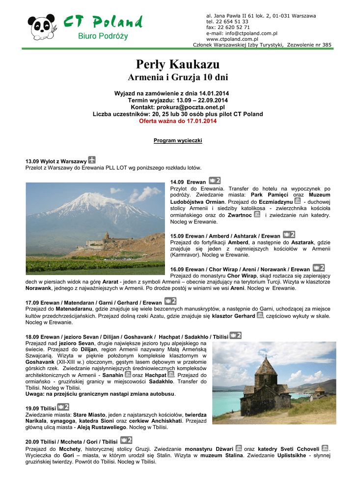 al. Jana Pawła II 61 lok. 2, 01-031 Warszawa tel. 22 654 51 33 fax: 22 620 52 71 e-mail: [email protected] www.ctpoland.com.pl Członek Warszawskiej Izby Turystyki, Zezwolenie nr 385 Perły Kaukazu Armenia i Gruzja 10 dni Wyjazd na zamówienie z dnia 14.01.2014 Termin wyjazdu: 13.09 – 22.09.2014 Kontakt: [email protected] Liczba uczestników: 20, 25 lub 30 osób plus pilot CT Poland Oferta ważna do 17.01.2014 Program wycieczki 13.09 Wylot z Warszawy Przelot z Warszawy do Erewania PLL LOT wg poniższego rozkładu lotów. 14.09 Erewan Przylot do Erewania. Transfer do hotelu na wypoczynek po podróży. Zwiedzanie miasta: Park Pamięci oraz Muzeum Ludobójstwa Ormian. Przejazd do Eczmiadzynu - duchowej stolicy Armenii i siedziby katolikosa - zwierzchnika kościoła ormiańskiego oraz do Zwartnoc i zwiedzanie ruin katedry. Nocleg w Erewanie. 15.09 Erewan / Amberd / Ashtarak / Erewan Przejazd do fortyfikacji Amberd, a następnie do Asztarak, gdzie znajduje się jeden z najmniejszych kościołów w Armenii (Karmravor). Nocleg w Erewanie. 16.09 Erewan / Chor Wirap / Areni / Norawank / Erewan Przejazd do monastyru Chor Wirap, skąd roztacza się zapierający dech w piersiach widok na górę Ararat - jeden z symboli Armenii – obecnie znajdujący na terytorium Turcji. Wizyta w klasztorze Norawank, jednego z najważniejszych w Armenii. Po drodze postój w winiarni we wsi Areni. Nocleg w Erewanie. 17.09 Erewan / Matendaran / Garni / Gerhard / Erewan Przejazd do Matenadaranu, gdzie znajduje się wiele bezcennych manuskryptów, a następnie do Garni, uchodzącej za miejsce kultów przedchrześcijańskich. Przejazd doliną rzeki Azatu, gdzie znajduje się klasztor Gerhard , częściowo wykuty w skale. Nocleg w Erewanie. 18.09 Erewan / jezioro Sevan / Dilijan / Goshavank / Hachpat / Sadakhlo / Tbilisi Przejazd nad jezioro Sevan, drugie największe jezioro typu alpejskiego na świecie. Przejazd do Dilijan, region Armenii nazywany Małą Armeńską Szwajcarią. Wizyta w pięknie położonym kompleksie klasztornym w Goshavank (XII-XIII w.) otoczonym, gęstym lasem dębowym w przełomie górskich rzek. Zwiedzanie najsłynniejszych średniowiecznych kompleksów architektonicznych w Armenii - Sanahin oraz Hachpat . Przejazd do ormiańsko - gruzińskiej granicy w miejscowości Sadakhlo. Transfer do Tbilisi. Nocleg w Tbilisi. Uwaga: na przejściu granicznym nastąpi zmiana autobusu. 19.09 Tbilisi Zwiedzanie miasta: Stare Miasto, jeden z najstarszych kościołów, twierdza Narikala, synagoga, katedra Sioni oraz cerkiew Anchiskhati. Przejazd główną ulicą miasta - Aleją Rustaweliego. Nocleg w Tbilisi. 20.09 Tbilisi / Mccheta / Gori / Tbilisi Przejazd do Mcchety, historycznej stolicy Gruzji. Zwiedzanie monastyru Dżwari oraz katedry Sveti Cchoveli . Wycieczka do Gori – miasta, w którym urodził się Stalin. Wizyta w muzeum Stalina. Zwiedzanie Uplistsikhe - słynnej gruzińskiej twierdzy. Powrót do Tbilisi. Nocleg w Tbilisi. 21.09 Tbilisi / winnice Kakheti / Tbilisi Przejazd do Kakheti - rejonu Gruzji słynnego z produkcji wina. Wizyta w mieście warownym Signagi. Zwiedzanie monastyru Bodbe, gdzie znajduje się grobowiec św. Nino, Apostołki Gruzji. Nocleg w Tbilisi. 22.09 Powrót do Warszawy Transfer na lotnisko i przelot do Warszawy PLL LOT. - miejsca wpisane przez UNESCO na listę Światowego Dziedzictwa Kulturowego i Naturalnego Termin: Symbol: 13.09 - 22.09.2014 PAGRU – 13/09/14 Cena od osoby: Dopłata do pokoju 1 os. 1550 PLN +1175 USD * (grupa min 20 os. hotele 3*) 1550 PLN +1115 USD * (grupa min 25 os. hotele 3*) 250 USD * 1550 PLN +1070 USD * (grupa min 30 os. hotele 3*) * Płatne w Polsce w USD lub równowartość w PLN według kursu sprzedaży USD w Pekao S.A. z dnia wpłaty. Cena obejmuje: 1. Przelot w klasie ekonomicznej na trasie Warszawa – Erewań, Tbilisi – Warszawa wg poniższej rezerwacji. 2. Transfery i przejazdy wg programu. 3. Zakwaterowanie w hotelach 3 * w pokojach dwuosobowych typu standrad room. 4. Opiekę anglojęzycznego lokalnego przewodnika tylko w czasie zwiedzania. 5. Asystę polskiego pilota na całej trasie wycieczki. 6. Wczesne zakwaterowanie po przylocie do Erewania. 7. Posiłki wg programu (liczba w ikonce wskazuje na ilość posiłków). Napoje dodatkowo płatne. 8. Bilety wstępu do obiektów wymienionych w programie. 9. Ubezpieczenie KL, NNW i bagażu. 10. Podatek 0 % VAT. Cena nie obejmuje: 1. Dodatkowych posiłków i napojów do posiłków. 2. Napiwków dla lokalnych przewodników i kierowców (50 USD od osoby). Napiwki zbiera pilot pierwszego dnia po przylocie. 3. Udziału w wycieczkach i zajęciach fakultatywnych nie objętych programem zwiedzania. 4. Ewentualnych opłat za fotografowanie i filmowanie. 5. Usługi tragarzy na lotniskach, w hotelach oraz na przejściu granicznym. Proponowane hotele: Erewan: Hotel Silachi 3*+ www.hotelsilachi.am Tbilisi: Hotel Sharden 3 * www.hotelsharden.com UWAGI: Oferta została skalkulowana dla grupy min. 20, 25 lub 30 osób dorosłych. W przypadku mniejszej liczby uczestników cena może ulec zmianie. Kolejność realizacji programu może ulec zmianie. Doba hotelowa zaczyna się o godz. 14 i trwa do godz. 12 dnia następnego. Wcześniejsze zakwaterowanie w dniu przybycia do hotelu jest możliwe jedynie w przypadku dostępności pokoi hotelowych i zgody hotelu. Brak możliwości zakwaterowania przed rozpoczęciem się doby hotelowej nie stanowi wady usługi. Podana standaryzacja hoteli jest kategoryzacją lokalną. Posiadaczy paszportów RP nie obowiązują wizy do Gruzji i Armenii. Paszport musi być ważny przynajmniej 6 miesięcy od daty powrotu i mieć przynajmniej dwie strony wolne. W wyjątkowych sytuacjach biuro zastrzega sobie prawo do zmiany podanych hoteli na inne o takim samym lub wyższym standardzie. Cena może ulec zmianie przed podpisaniem umowy w przypadku zmian cen w Armenii i Gruzji, zmiany kursu waluty lokalnej, wzrostu cen biletów lotniczych, zmian w programie. Bagaż główny na przeloty PLL LOT: 