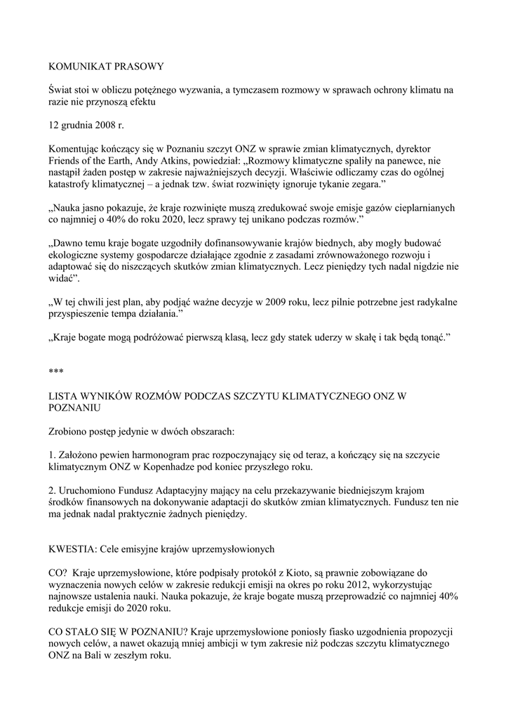 KOMUNIKAT PRASOWY Świat stoi w obliczu potężnego wyzwania, a tymczasem rozmowy w sprawach ochrony klimatu na razie nie przynoszą efektu 12 grudnia 2008 r. Komentując kończący się w Poznaniu szczyt ONZ w sprawie zmian klimatycznych, dyrektor Friends of the Earth, Andy Atkins, powiedział: „Rozmowy klimatyczne spaliły na panewce, nie nastąpił żaden postęp w zakresie najważniejszych decyzji. Właściwie odliczamy czas do ogólnej katastrofy klimatycznej – a jednak tzw. świat rozwinięty ignoruje tykanie zegara.” „Nauka jasno pokazuje, że kraje rozwinięte muszą zredukować swoje emisje gazów cieplarnianych co najmniej o 40% do roku 2020, lecz sprawy tej unikano podczas rozmów.” „Dawno temu kraje bogate uzgodniły dofinansowywanie krajów biednych, aby mogły budować ekologiczne systemy gospodarcze działające zgodnie z zasadami zrównoważonego rozwoju i adaptować się do niszczących skutków zmian klimatycznych. Lecz pieniędzy tych nadal nigdzie nie widać”. „W tej chwili jest plan, aby podjąć ważne decyzje w 2009 roku, lecz pilnie potrzebne jest radykalne przyspieszenie tempa działania.” „Kraje bogate mogą podróżować pierwszą klasą, lecz gdy statek uderzy w skałę i tak będą tonąć.” *** LISTA WYNIKÓW ROZMÓW PODCZAS SZCZYTU KLIMATYCZNEGO ONZ W POZNANIU Zrobiono postęp jedynie w dwóch obszarach: 1. Założono pewien harmonogram prac rozpoczynający się od teraz, a kończący się na szczycie klimatycznym ONZ w Kopenhadze pod koniec przyszłego roku. 2. Uruchomiono Fundusz Adaptacyjny mający na celu przekazywanie biedniejszym krajom środków finansowych na dokonywanie adaptacji do skutków zmian klimatycznych. Fundusz ten nie ma jednak nadal praktycznie żadnych pieniędzy. KWESTIA: Cele emisyjne krajów uprzemysłowionych CO? Kraje uprzemysłowione, które podpisały protokół z Kioto, są prawnie zobowiązane do wyznaczenia nowych celów w zakresie redukcji emisji na okres po roku 2012, wykorzystując najnowsze ustalenia nauki. Nauka pokazuje, że kraje bogate muszą przeprowadzić co najmniej 40% redukcje emisji do 2020 roku. CO STAŁO SIĘ W POZNANIU? Kraje uprzemysłowione poniosły fiasko uzgodnienia propozycji nowych celów, a nawet okazują mniej ambicji w tym zakresie niż podczas szczytu klimatycznego ONZ na Bali w zeszłym roku. Unia Europejska równolegle dyskutuje w Brukseli na temat własnego planu dla ochrony klimatu, w tym na temat propozycji, aby dwie trzecie poziomu celów redukcyjnych emisji mogły być zaspokojone poprzez kupowanie kredytów z innych krajów pozaunijnych. Osłabienie stanowiska UE w tym zakresie zniweczyło niewielki postęp poczyniony w Poznaniu. CO TERAZ? Kraje uprzemysłowione muszą do czerwca 2009 roku złożyć propozycje co do poszczególnych własnych nowych celów emisyjnych, lecz hipotetyczny postęp w Poznaniu ułatwiłby znacznie podjęcie porozumienia w następnym roku. CO POWIEDZIAŁA WIELKA BRYTANIA? Wielka Brytania trzyma się stanowiska UE polegającego na zobowiązaniu się do redukowania do 2020 roku emisji o 20% lub 30% w konkteście międzynarodowego porozumienia. Wielka Brytania mogłaby zainspirować międzynarodowy poziom ambicji poprzez jednostronne zadeklarowanie zredukowania swoich emisji o 40% do 2020 roku. Brytyjski Komitet Krajowy ds. Zmian Klimatu zarekomendował 42% ograniczenie do 2020 roku w przypadku osiągnięcia globalnego porozumienia. KWESTIA: Zapewnienie środków finansowych dla krajów rozwijających się CO? Konwencja ONZ w sprawie zmian klimatu podpisana w 1992 roku zobowiązuje prawnie kraje uprzemysłowione do zapewnienia dofinansowywania biednych krajów, aby mogły budować ekologiczne systemy gospodarcze działające zgodnie z zasadami zrównoważonego rozwoju i radzić sobie ze zwiększającą się częstotliwością i intensywnością huraganów, powodzi, susz i klęsk głodu, które mają u nich miejsce z powodu globalnych zmian klimatycznych. ONZ szacuje, że krajom biednym potrzebne jest co najmniej 200 miliardów dolarów rocznie na pokrycie kosztów stąd wynikających. CO STAŁO SIĘ W POZNANIU? Kraje bogate nie poczyniły żadnych propozycji co do wielkości środków finansowych, jakie miałyby przekazywać, pomimo kilku przedłożonych przez kraje rozwijające się szczegółowych propozycji dotyczących mechanizmów transferów finansowych. UE ma jedynie na wiosnę przyszłego roku uzgodnić stanowiskio w sprawie środków finansowych dla krajów rozwijających. Ten brak działań spowodował frustrację podczas rozmów na szczycie wśród krajów rozwijających się. CO TERAZ? Kraje uprzemysłowione mają przewidziane na długi okres zobowiązania w zakresie pokrywania kosztów dostosowania i technologii związanych ze zmianami klimatu, zobowiązania, które pozostają niespełnione. Kwestia zapewnienia finansowania jest najistotniejsza z punktu widzenia wyjścia z impasu potrzebnego do osiągnięcia globalnego porozumienia w sprawie zmian klimatycznych w Kopenhadze w przyszłym roku, którego kraje rozwijające się nie będą w stanie podpisać, dopóki finansowanie nie będzie zagwarantowane. Postęp w zakresie finansowania musi być wyraźnie przyszpieszony w ciągu 2009 roku. CO POWIEDZIAŁA WIELKA BRYTANIA? Wielka Brytania nie określiła nawet w przybliżeniu ilości pieniędzy, jaką jest gotowa wyłożyć na potrzeby związane ze zmianami klimatycznymi. Jednak w swoim przemówieniu ministerialnym w Polsce, minister ds. zmian klimatycznych, Ed Miliband, uznał potrzebę udzielania znaczących i stałych źródeł dofinansowywania krajom rozwijającym się. KWESTIA: Deforestacja CO? 20% emisji gazów cieplarnianych spowodowane jest przez deforestację (masowe wycinanie lasów). Przedmiotem debaty podczas rozmów klimatycznych ONZ w Poznaniu była propozycja włączenia lasów do systemów handlu emisjami dwutlenkiem węgla, które pozwoliłoby bogatym krajom offsetować (rekompensować) własne emisje poprzez kupowanie 