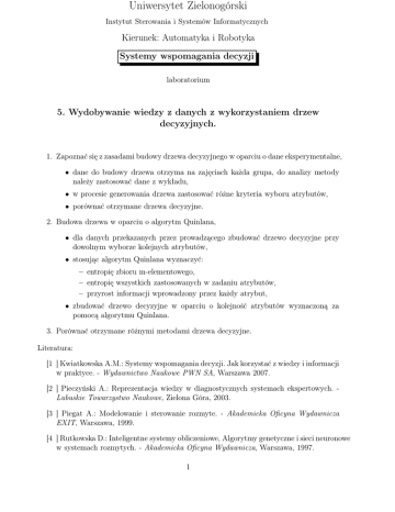 Uniwersytet Zielonogórski Instytut Sterowania i Systemów Informatycznych Kierunek: Automatyka i Robotyka Systemy wspomagania decyzji laboratorium 5. Wydobywanie wiedzy z danych z wykorzystaniem drzew decyzyjnych. 1. Zapoznać się z zasadami budowy drzewa decyzyjnego w oparciu o dane eksperymentalne, • dane do budowy drzewa otrzyma na zajęciach każda grupa, do analizy metody należy zastosować dane z wykładu, • w procesie generowania drzewa zastosować różne kryteria wyboru atrybutów, • porównać otrzymane drzewa decyzyjne. 2. Budowa drzewa w oparciu o algorytm Quinlana, • dla danych przekazanych przez prowadzącego zbudować drzewo decyzyjne przy dowolnym wyborze kolejnych atrybutów, • stosując algorytm Quinlana wyznaczyć: – entropię zbioru m-elementowego, – entropię wszystkich zastosowanych w zadaniu atrybutów, – przyrost informacji wprowadzony przez każdy atrybut, • zbudować drzewo decyzyjne w oparciu o kolejność atrybutów wyznaczoną za pomocą algorytmu Quinlana. 3. Porównać otrzymane różnymi metodami drzewa decyzyjne. Literatura: [1 ] Kwiatkowska A.M.: Systemy wspomagania decyzji. Jak korzystać z wiedzy i informacji w praktyce. - Wydawnictwo Naukowe PWN SA, Warszawa 2007. [2 ] Pieczyński A.: Reprezentacja wiedzy w diagnostycznych systemach ekspertowych. Lubuskie Towarzystwo Naukowe, Zielona Góra, 2003. [3 ] Piegat A.: Modelowanie i sterowanie rozmyte. - Akademicka Oficyna Wydawnicza EXIT, Warszawa, 1999. [4 ] Rutkowska D.: Inteligentne systemy obliczeniowe, Algorytmy genetyczne i sieci neuronowe w systemach rozmytych. - Akademicka Oficyna Wydawnicza, Warszawa, 1997. 1 [5 ] Rutkowska D., Piliński M., Rutkowski L.: Sieci neuronowe, algorytmy genetyczne i zbiory rozmyte, - Wydawnictwo Naukowe PWN, Warszawa, 1999. [6 ] Yager R.R., Filev D.P.: Podstawy modelowania i sterowania rozmytego, - J.Wiley § Sons. Inc. 1994. 2
