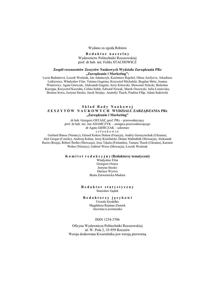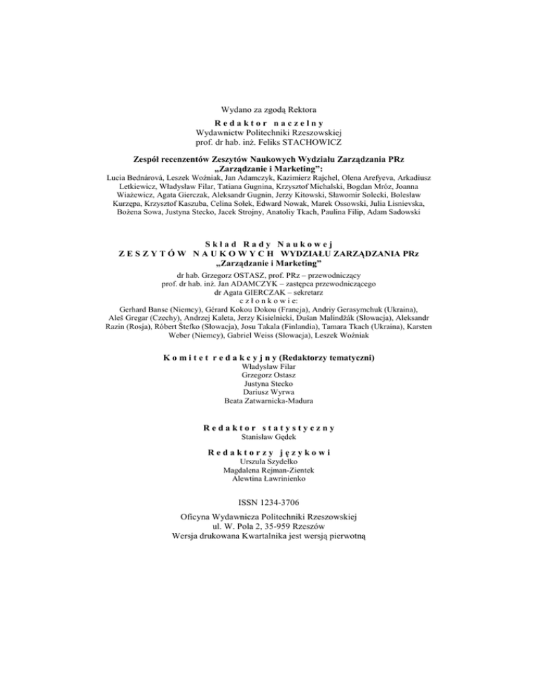 Wydano za zgodą Rektora Redaktor naczelny Wydawnictw Politechniki Rzeszowskiej prof. dr hab. inż. Feliks STACHOWICZ Zespół recenzentów Zeszytów Naukowych Wydziału Zarządzania PRz „Zarządzanie i Marketing”: Lucia Bednárová, Leszek Woźniak, Jan Adamczyk, Kazimierz Rajchel, Olena Arefyeva, Arkadiusz Letkiewicz, Władysław Filar, Tatiana Gugnina, Krzysztof Michalski, Bogdan Mróz, Joanna Wiażewicz, Agata Gierczak, Aleksandr Gugnin, Jerzy Kitowski, Sławomir Solecki, Bolesław Kurzępa, Krzysztof Kaszuba, Celina Sołek, Edward Nowak, Marek Ossowski, Julia Lisnievska, Bożena Sowa, Justyna Stecko, Jacek Strojny, Anatoliy Tkach, Paulina Filip, Adam Sadowski Skład Rady Naukowej Z E S Z Y T Ó W N A U K O W Y C H WYDZIAŁU ZARZĄDZANIA PRz „Zarządzanie i Marketing” dr hab. Grzegorz OSTASZ, prof. PRz – przewodniczący prof. dr hab. inż. Jan ADAMCZYK – zastępca przewodniczącego dr Agata GIERCZAK – sekretarz c z ł o n k o w i e: Gerhard Banse (Niemcy), Gérard Kokou Dokou (Francja), Andriy Gerasymchuk (Ukraina), Aleš Gregar (Czechy), Andrzej Kaleta, Jerzy Kisielnicki, Dušan Malindžák (Słowacja), Aleksandr Razin (Rosja), Róbert Štefko (Słowacja), Josu Takala (Finlandia), Tamara Tkach (Ukraina), Karsten Weber (Niemcy), Gabriel Weiss (Słowacja), Leszek Woźniak K o m i t e t r e d a k c y j n y (Redaktorzy tematyczni) Władysław Filar Grzegorz Ostasz Justyna Stecko Dariusz Wyrwa Beata Zatwarnicka-Madura Redaktor statystyczny Stanisław Gędek Redaktorzy językowi Urszula Szydełko Magdalena Rejman-Zientek Alewtina Ławrinienko ISSN 1234-3706 Oficyna Wydawnicza Politechniki Rzeszowskiej ul. W. Pola 2, 35-959 Rzeszów Wersja drukowana Kwartalnika jest wersją pierwotną SPIS TREŚCI Od Komitetu Redakcyjnego ............................................................................................... 7 Maria Adamska: Uwarunkowania skuteczności sukcesji w polskich przedsiębiorstwach rodzinnych ........................................................................ 9 Teresa Bal-Woźniak, Sławomir Gumienny: Podstawy metody action research i jej przydatność w naukach o zarządzaniu ...................................................................... 19 Halina Chłodnicka: Wartość godziwa czy koszt historyczny? ...................................... 27 Piotr Cyrek: Rzeczywistość a przekaz medialny ............................................................ 35 Marcin Gębarowski: Instalacje powitalne gmin, powiatów i województw – determinanty skutecznego stosowania oraz znaczenie dla działań wizerunkowych jednostek terytorialnych ......................................................................... 43 Marzena Jankowska-Mihułowicz: Modele stylów podejmowania decyzji menedżerskich .................................................................................................................. 53 Dorota Kulpa: Formalno-prawne oraz instytucjonalne aspekty kontroli budżetowej .... 65 Grzegorz Lew: Ewidencyjne potrzeby rachunku wyników w przedsiębiorstwach handlowych ...................................................................................................................... 79 Tadeusz Olejarz: Wsparcie logistyczne polskich kontyngentów wojskowych poza granicami kraju ........................................................................................................ 85 Anna Ostrowska-Dankiewicz, Sylwia Pieńkowska-Kamieniecka: Ubezpieczenie na życie typu unit-linked jako forma zabezpieczenia emerytalnego ................................ 93 Artur Polakiewicz, Krzysztof Kusch: Ekonomiczne postawy osób przekraczających granicę w celach przemytniczo-zarobkowych na podkarpackim pograniczu Polski i Ukrainy .............................................................. 107 Olga Jurjevna Shcheglova, Dmitriy Lvovich Levchynskiy: Формирование системы управления инвестиционно-строительным комплексом ................................121 Barbara Sieńko: Wykorzystanie metody analizy dynamiki kinetycznej procesów ekonomicznych do oceny rozwoju regionów ................................................. 131 Iwona Ślęzak-Gładzik: Coaching jako metoda wspierania rozwoju potencjału ludzkiego ...................................................................................................... 143 Beata Tarczydło: Marketing szeptany w działaniach organizacji. Przykłady zastosowań .................................................................................................... 155 Krzysztof Tereszkiewicz, Piotr Molenda: Referencyjne metody oceny zawartości mięsa i tłuszczu w tuszach wieprzowych ....................................................................... 161 Anatoliy Tkach: Институциональные предпосылки экономического роста и социального неравенства ................................................................................ 173 Natalia Vierchogliadowa, Aleksandra Rossichina: Исследование строительной области с целью обоснования формирования системы управления конкурентоспособности предприятия ......................................................................... 181 Joanna Wiażewicz: Tożsamość a wizerunek jednostki samorządu terytorialnego na przykładzie gminy ..................................................................................................... 191 Piotr Zawada: Zarządzanie przedsiębiorstwem w okresie dynamicznych zmian gospodarczych – studium przypadku .................................................................. 199 Agnieszka Zielińska: Strategie konkurencji w organizacjach pozarządowych ............ 209 CONTENTS From Editorial Committee ................................................................................................. 7 Ma