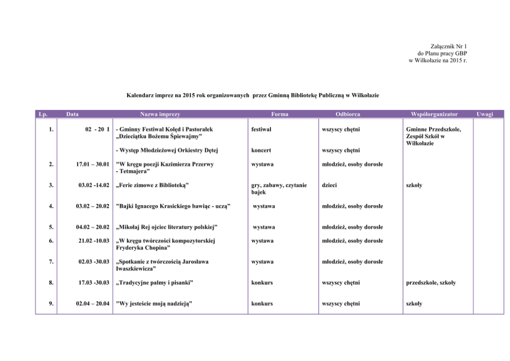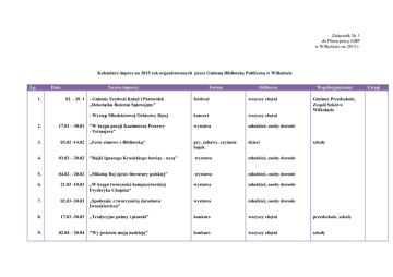 Załącznik Nr 1 do Planu pracy GBP w Wilkołazie na 2015 r. Kalendarz imprez na 2015 rok organizowanych przez Gminną Bibliotekę Publiczną w Wilkołazie Lp. Data 1. Nazwa imprezy 02 - 20 I Forma Odbiorca - Gminny Festiwal Kolęd i Pastorałek „Dzieciątku Bożemu Śpiewajmy” festiwal wszyscy chętni - Występ Młodzieżowej Orkiestry Dętej koncert wszyscy chętni "W kręgu poezji Kazimierza Przerwy - Tetmajera” wystawa młodzież, osoby dorosłe „Ferie zimowe z Biblioteką” gry, zabawy, czytanie bajek dzieci Współorganizator Gminne Przedszkole, Zespół Szkół w Wilkołazie 2. 17.01 – 30.01 3. 03.02 -14.02 4. 03.02 – 20.02 "Bajki Ignacego Krasickiego bawiąc - uczą” wystawa młodzież, osoby dorosłe 5. 04.02 – 20.02 „Mikołaj Rej ojciec literatury polskiej” wystawa młodzież, osoby dorosłe 6. 21.02 -10.03 „W kręgu twórczości kompozytorskiej Fryderyka Chopina” wystawa młodzież, osoby dorosłe 7. 02.03 -30.03 „Spotkanie z twórczością Jarosława Iwaszkiewicza” wystawa młodzież, osoby dorosłe 8. 17.03 -30.03 „Tradycyjne palmy i pisanki” konkurs wszyscy chętni przedszkole, szkoły 9. 02.04 – 20.04 "Wy jesteście moją nadzieją” konkurs wszyscy chętni szkoły szkoły Uwagi 10. 02.04 – 30.04 W krainie baśni Hansa Christiana Andersena” wystawa dzieci 11. 03.05- 30.05 „3 Maja 1791 Rok” wystawa młodzież 12. 09.05 – 30.05 Kiermasz książek kiermasz wszyscy chętni 13. 19.05 - 30.05 Śladami bohaterów Marii Dąbrowskiej” wystawa młodzież, osoby dorosłe 14. 10.06 – 30.06 10.08 - 31.08 Galeria sztuki i rękodzieła artystycznego/ wystawy młodzież i osoby dorosłe 15. 30.08 „Rozmaitości wilkołaskie” – Dożynki Gminne 2015, występ Młodzieżowej Orkiestry Dętej wystawy, kiermasz książki i koncert zespołu wszyscy chętni Wilkołascy synowie na wojennej tułaczce” wystawa młodzież, osoby dorosłe "Wilkołaz 2015”- stoisko promocyjne Gminy Wilkołaz na Dożynki Powiatowe stoisko promocyjne koncert zespołu dzieci, młodzież szkolna, osoby dorosłe 16. 01.09- 30.09 17. 06.09 18. „Cała Polska czyta dzieciom” wycieczki / 3 / 19. 10.09; 16.09; 25.09 08.10 – 30.10 „Świat książek Marii Konopnickiej”” wystawa dzieci 20. 06.11 -30.11. "Szlak wilkołaski Piotra Ściegiennego” wystawa dzieci, młodzież, osoby dorosłe szkoły Urząd Gminy, Starostwo Powiatowe; Urząd Gminy; Gminne Przedszkole dzieci / 3 i 5 letnie/ 21. 26.11 – 10.12 „Adam Mickiewicz – twórca polskiego romantyzmu” wystawa młodzież, osoby dorosłe 22. 01.12 – 15.12 „Anioł – Ozdoba Bożonarodzeniowa” konkurs dzieci, młodzież, osoby dorosłe Załącznik Nr 2 do Planu pracy GBP w Wilkołazie na 2015 Kalendarz imprez na 2015 rok organizowanych przez w Filię Gminnej Biblioteki Publicznej w Pułankowicach Lp Data Nazwa imprezy Forma Odbiorca Współorganizator Szkoła Podstawowa w Rudniku Szlacheckim GBP Wilkołaz 1. 12.01 – 23.01 ,,Moi kochani dziadkowie” Konkurs Dzieci 2. 02.02 – 13.02 ,A niechaj narodowie wżdy postronni znają, iż Polacy nie gęsi , iż swój język mają”- 510 rocz. ur. Mikołaja Reja (1505- 1569) Wystawa Dzieci Młodzież Dorośli 3. 16.03 – 27.03 ,,Gałązka Wielkanocna” Konkurs Dzieci 4. 01.04 – 10.04 ,,Święty nad świętymi” -10 rocz. śm. Jana Pawła II Papieża - Polaka Wystawa Dzieci Młodzież Dorośli 5. 06.05 ,,Książki dla dzieci – forma, kolor, druk’’ Wycieczka Dzieci 6. 01.06 – 12.06 Wystawa Młodzież Dorośli 7. 15.07 -24.07 ,,Dwa miecze”- 605 rocz. Bitwy pod Grunwaldem 1410 rok. Wystawa Młodzież Dorośli ,,Książka moich marzeń”- Światowy Dzień Umiejętności Czytania Konkurs Dzieci ,,Bajkowe południe” – czytanie bajek Marii Konopnickiej – 105 rocz. śm. Pisarki Spotkanie Dzieci ,,Nasz Patriota” -125 rocz. śm. Piotra Ściegiennego (1801- 1890) Wystawa Młodzież Dorośli 8. 07.09 – 18.09 9. 06.10 10. 02.11- 13.11 , ,Spieszmy się kochać ludzi ,tak szybko odchodzą”-100 rocz. ur. Ks. Jana Twardowskiego Szkoła Podstawowa w Rudniku Szlacheckim Szkoła Podstawowa w Rudniku Szlacheckim GBP Wilkołaz Szkoła Podstawowa w Rudniku Szlacheckim Szkoła Podstawowa w Rudniku Szlacheckim GBP Wilkołaz Szkoła Podstawowa w Rudniku Szlacheckim Uwagi 11. 06.12 12. 07.12 – 16.12 ,,Św. Mikołaj w Bibliotece” Spotkanie Dzieci ,, Kolorowa Bombka” Konkurs Dzieci Szkoła Podstawowa w Rudniku Szlacheckim