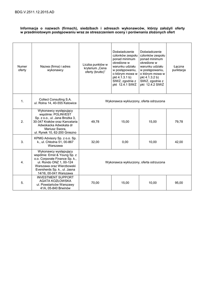 BDG.V.2511.12.2015.AD Informacja o nazwach (firmach), siedzibach i adresach wykonawców, którzy założyli oferty w przedmiotowym postępowaniu wraz ze streszczeniem oceny i porównania złożonych ofert Liczba punktów w kryterium „Cena oferty (brutto)” Doświadczenie członków zespołu ponad minimum określone w warunku udziału w postępowaniu, o którym mowa w pkt 4.1.3.1 b) SIWZ, zgodnie z pkt 12.4.1 SIWZ Doświadczenie członków zespołu ponad minimum określone w warunku udziału w postępowaniu, o którym mowa w pkt 4.1.3.2 b) SIWZ, zgodnie z pkt 12.4.2 SIWZ Łączna punktacja Numer oferty Nazwa (firma) i adres wykonawcy 1. Collect Consulting S.A. ul. Rolna 14, 40-555 Katowice 2. Wykonawcy występujący wspólnie: POLINVEST Sp. z o.o., ul. Jana Brożka 3, 30-347 Kraków oraz Kancelaria Adwokacka Adwokata dr Mariusz Swora, ul. Rynek 10, 62-200 Gniezno 49,78 15,00 15,00 79,78 3. KPMG Advisory Sp. z o.o. Sp. k., ul. Chłodna 51, 00-867 Warszawa 32,00 0,00 10,00 42,00 4. 5. Wykonawcy występujący wspólnie: Ernst & Young Sp. z o.o. Corporate Finance Sp. k., ul. Rondo ONZ 1, 00-124 Warszawa oraz Wierzbowski Eversherds Sp. k., ul. Jasna 14/16, 00-041 Warszawa INVESTMENT SUPPORT AGATA KOZŁOWSKA ul. Powstańców Warszawy 41A, 05-840 Brwinów Wykonawca wykluczony, oferta odrzucona Wykonawca wykluczony, oferta odrzucona 70,00 15,00 10,00 95,00