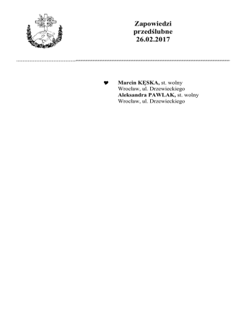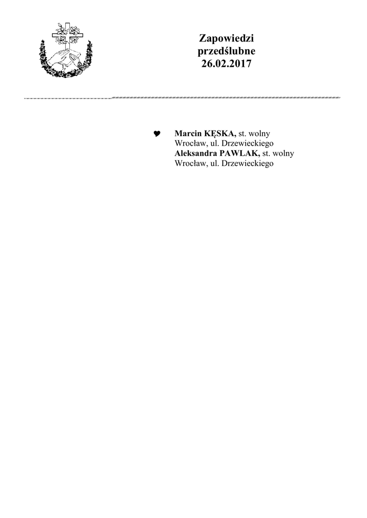 Zapowiedzi przedślubne 26.02.2017 Marcin KĘSKA, st. wolny Wrocław, ul. Drzewieckiego Aleksandra PAWLAK, st. wolny Wrocław, ul. Drzewieckiego