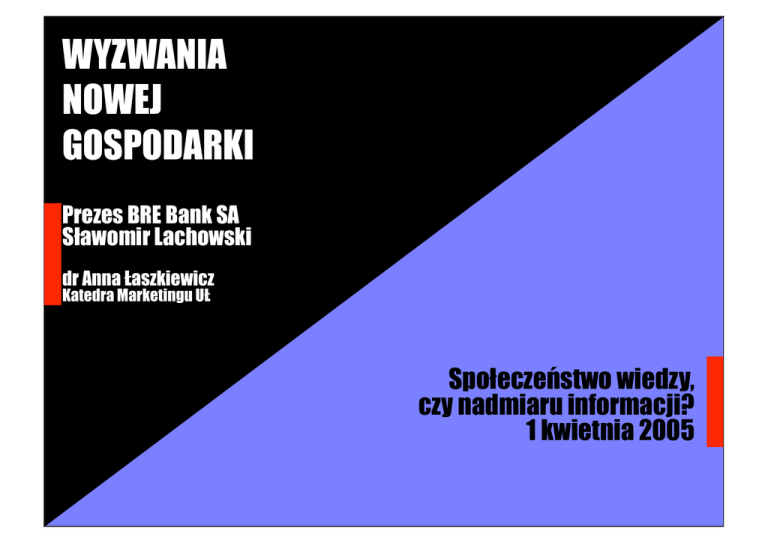 WYZWANIA NOWEJ GOSPODARKI Prezes BRE Bank SA Sławomir Lachowski dr Anna Łaszkiewicz Katedra Marketingu UŁ Społeczeństwo wiedzy, czy nadmiaru informacji? 1 kwietnia 2005 W latach 30 XX wieku typowy sklep spożywczy w USA oferował około 800 produktów... Lata 80-te w Polsce Skarga z 1983 roku: Na wystawie są wystawione różne sery żółte, ale w sklepie nie ma ich w sprzedaży. Co to za zwyczaj reklamowania towaru, którego nie ma w sklepie. Proszę o wyjaśnienie - Tadeusz Kędzielski. Wyjaśnienie kierownika: Sklep bierze udział w konkursie. Zrobiono więc wystawy konkursowe, na których umieszczono atrapy towarów. Samych towarów od dłuższego czasu niestety brak w sprzedaży. Pochwała z 1988 roku: Dziękuje za rodzynki, które kupiłam w tym sklepie, a nie mogłam dostać od 2 lat w całym śródmieściu. Szczególnie dziękuje pani sprzedawczyni, która z uśmiechem odważyła mi żądaną ilość Dominika Pytkowska. Skarga z 1988 roku: Odmówiono mi sprzedaży miodu z wystawy (podpis nieczytelny). Wyjaśnienie kierownika wpisane pod skargą: Miód znajdujący się na wystawie będzie sprzedany po zmianie dekoracji. Jest już sporządzona lista na te towary, ale klient stwierdził, że tyle to on nie będzie czekał. ŻYCIE WARSZAWY Program telewizyjny na czwartek 08.06.1978 PR 1 PR 2 9.00 - Studio Sport -sprawozdanie z meczu Brazylia - Hiszpania (program dla drugiej zmiany) 15.00 - Melodie - Rapsodia węgierska 15.30 - "Bilet do kina" (kolor) 16.00 - Dziennik 16.10 - Obiektyw 16.30 - Dla młodych widzów " Ekran z Bratkiem " 17.55 - "Patrol" 18.20 - Sonda - Ryby (kolor) 18.50 - Radzimy rolnikom 19.00 - Dobranocka dla najmłodszych 19.10 - Siódemka 19.30 - Wieczór z dziennikiem (kolor) 20.30 - kino letnie - Telefon 110 - "Zaginął Peter Schrank" film kryminalny produkcji tv NRD.(kolor) 21.35 - Festiwal Piosenki Radzieckiej - Koncert Przyjaźni (kolor) 22.35 - Dziennik (kolor) 22.50 - Festiwal Piosenki Radzieckiej - Koncert Przyjaźni cz.II(kolor) 23.50 - Pegaz 16.00 - Program dnia 16.05 - Dla młodych widzów - "Paragrafy i my" 16.35 - Dziedzictwo - Afryka bez maski 17.10 - Dwie brygady - program publicystyczny 17.40 - Magazyn morski - "Wielka brama" 18.10 - "Łuk tęczy" - odc.1 film fabularny produkcji tv CSRS 19.00 - Program lokalny 19.20 - Dobranocka dla najmłodszych 19.30 - Wieczór z dziennikiem (kolor) 20.30 - NURT - pedagogika - nauczyciel, szkoła, społeczeństwo 21.00 - NURT - pedagogika - nauczyciel, szkoła, społeczeństwo 21.30 - NURT - pedagogika - nauczyciel, szkoła, społeczeństwo 22.05 - 24 godziny 22.15 - Film latarni czarnoksięskiej- "Miłość" film obyczajowy produkcji Węgierskiej ....Dzisiaj średniej wielkości sklep oferuje ponad 35 000 produktów a producenci prześcigają się we wprowadzaniu na rynek coraz to nowszych wariantów Crest oferuje 85 rodzajów past do zębów. Budweiser produkuje 6 rodzajów piwa, Ford 20 typów samochodów. Niedawno, Coca-Cola wprowadziła swoją 15tą wariację Coli, pod nazwą Coca-Cola Zero, skierowaną do segmentu 18-34 lata. Prawie równocześnie Pepsi - posiadająca 11 odmian swojego produktu. wprowadziła kolejną Pepsi One dla 20latków. „Where is the life we have lost in living? Where is the Wisdom we have lost in knowledge? Where is the Knowledge we have lost in information?” Thomas S. Elliot POJĘCIE SPOŁECZEŃSTWA INFORMACYJNEGO NA PRZESTRZENI LAT • Pojęcie społeczeństwa informacyjnego pojawiło się po raz pierwszy w latach sześćdziesiątych XX w. Użył go japoński badacz i ekonomista Tadeo Umesao (w języku japońskim jako „Johoka Shakai”) opisując ewolucyjną teorię społeczeństwa, na przykładzie społeczeństwa japońskiego, w którym o standardach gospodarki zaczęły decydować informacja i technologia. • Kiedy D. Bell pisał o społeczeństwie postindustrialnym w początku lat 70-tych, zwrócił uwagę na nowy typ usług związanych z informacją; w 1980 r. Y. Masuda opublikował w Japonii książkę o Information Society, w 1979 r. we Francji S. Nora i A. Minc piszą o informatyzacji społeczeństwa. • Ostatnie dekady XX w. to ożywiona dyskusja nad tym, jak dalece następujące po sobie generacje technologii teleinformatycznych wpływają na społeczeństwa najbardziej zaawansowanych gospodarczo i technologicznie rejonów świata. Stawiano pytania o istotę informacji w procesie rozwoju społecznego, starając się stworzyć teorię społeczeństwa informacyjnego. SPOŁECZEŃSTWO INFORMACYJNE – FUNKCJONUJĄCE TERMINY • Zanim upowszechnił się termin „społeczeństwo informacyjne”, proponowano określenia „cybernetyczne”, „cyfrowe”, „multimedialne”. Stosowano również terminy: „społeczeństwo wiedzy” (P. Drucker), „era informacji trzeciej fali” (A. Toffler), „społeczeństwo telematyczne” (J. Martin) czy „społeczeństwo nadmiaru informacji” (M. Marien), słusznie zwracając uwagę, że dobrem, o które powinniśmy zabiegać, jest wiedza, a nie informacja jako taka. • Można by przytoczyć również długą listę określeń używanych dla scharakteryzowania współczesnego społeczeństwa globalnego, takich chociażby jak: rewolucja naukowotechniczna (lub druga czy trzecia rewolucja przemysłowa), społeczeństwo technologiczne (Z. Brzeziński), społeczeństwo ryzyka (U. Beck), społeczeństwo postindustrialne (D. Bell), postkapitalistyczne (P. Drucker), postmodernistyczne (Baudrillard, Z. Bauman), postrynkowe (J. Rifkin). NAJWAŻNIEJSZE WYZNACZNIKI SPOŁECZEŃSTWA INFORMACYJNEGO • traktowanie informacji jako dobra ekonomicznego, podstawowego zasobu i podstawowej kategorii ekonomicznej, • upowszechniony dostęp do technologii informacyjnej, tworzącej obecnie różne kanały dystrybucji, • swobodna cyrkulacja różnych kategorii informacji w społeczeństwie i nowe formy demokratyzacji – demokratyczny dostęp do informacji, • dominujący udział sektora informacyjnego w gospo-darce (zarówno w zatrudnieniu j