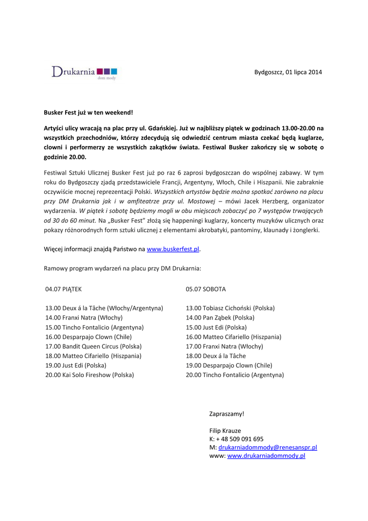 Bydgoszcz, 01 lipca 2014 Busker Fest już w ten weekend! Artyści ulicy wracają na plac przy ul. Gdańskiej. Już w najbliższy piątek w godzinach 13.00-20.00 na wszystkich przechodniów, którzy zdecydują się odwiedzić centrum miasta czekać będą kuglarze, clowni i performerzy ze wszystkich zakątków świata. Festiwal Busker zakończy się w sobotę o godzinie 20.00. Festiwal Sztuki Ulicznej Busker Fest już po raz 6 zaprosi bydgoszczan do wspólnej zabawy. W tym roku do Bydgoszczy zjadą przedstawiciele Francji, Argentyny, Włoch, Chile i Hiszpanii. Nie zabraknie oczywiście mocnej reprezentacji Polski. Wszystkich artystów będzie można spotkać zarówno na placu przy DM Drukarnia jak i w amfiteatrze przy ul. Mostowej – mówi Jacek Herzberg, organizator wydarzenia. W piątek i sobotę będziemy mogli w obu miejscach zobaczyć po 7 występów trwających od 30 do 60 minut. Na „Busker Fest” złożą się happeningi kuglarzy, koncerty muzyków ulicznych oraz pokazy różnorodnych form sztuki ulicznej z elementami akrobatyki, pantominy, klaunady i żonglerki. Więcej informacji znajdą Państwo na www.buskerfest.pl. Ramowy program wydarzeń na placu przy DM Drukarnia: 04.07 PIĄTEK 05.07 SOBOTA 13.00 Deux á la Tâche (Włochy/Argentyna) 14.00 Franxi Natra (Włochy) 15.00 Tincho Fontalicio (Argentyna) 16.00 Desparpajo Clown (Chile) 17.00 Bandit Queen Circus (Polska) 18.00 Matteo Cifariello (Hiszpania) 19.00 Just Edi (Polska) 20.00 Kai Solo Fireshow (Polska) 13.00 Tobiasz Cichoński (Polska) 14.00 Pan Ząbek (Polska) 15.00 Just Edi (Polska) 16.00 Matteo Cifariello (Hiszpania) 17.00 Franxi Natra (Włochy) 18.00 Deux á la Tâche 19.00 Desparpajo Clown (Chile) 20.00 Tincho Fontalicio (Argentyna) Zapraszamy! Filip Krauze K: + 48 509 091 695 M: [email protected] www: www.drukarniadommody.pl