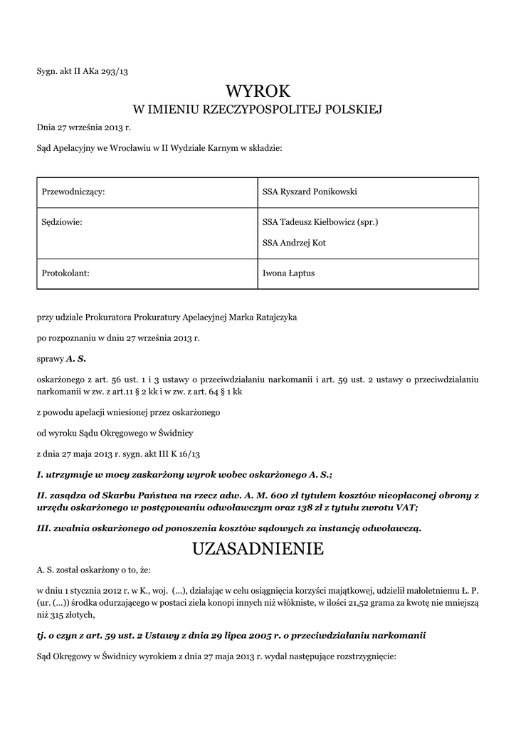 Sygn. akt II AKa 293/13 WYROK W IMIENIU RZECZYPOSPOLITEJ POLSKIEJ Dnia 27 września 2013 r. Sąd Apelacyjny we Wrocławiu w II Wydziale Karnym w składzie: Przewodniczący: SSA Ryszard Ponikowski Sędziowie: SSA Tadeusz Kiełbowicz (spr.) SSA Andrzej Kot Protokolant: Iwona Łaptus przy udziale Prokuratora Prokuratury Apelacyjnej Marka Ratajczyka po rozpoznaniu w dniu 27 września 2013 r. sprawy A. S. oskarżonego z art. 56 ust. 1 i 3 ustawy o przeciwdziałaniu narkomanii i art. 59 ust. 2 ustawy o przeciwdziałaniu narkomanii w zw. z art.11 § 2 kk i w zw. z art. 64 § 1 kk z powodu apelacji wniesionej przez oskarżonego od wyroku Sądu Okręgowego w Świdnicy z dnia 27 maja 2013 r. sygn. akt III K 16/13 I. utrzymuje w mocy zaskarżony wyrok wobec oskarżonego A. S.; II. zasądza od Skarbu Państwa na rzecz adw. A. M. 600 zł tytułem kosztów nieopłaconej obrony z urzędu oskarżonego w postępowaniu odwoławczym oraz 138 zł z tytułu zwrotu VAT; III. zwalnia oskarżonego od ponoszenia kosztów sądowych za instancję odwoławczą. UZASADNIENIE A. S. został oskarżony o to, że: w dniu 1 stycznia 2012 r. w K., woj. (...), działając w celu osiągnięcia korzyści majątkowej, udzielił małoletniemu Ł. P. (ur. (...)) środka odurzającego w postaci ziela konopi innych niż włókniste, w ilości 21,52 grama za kwotę nie mniejszą niż 315 złotych, tj. o czyn z art. 59 ust. 2 Ustawy z dnia 29 lipca 2005 r. o przeciwdziałaniu narkomanii Sąd Okręgowy w Świdnicy wyrokiem z dnia 27 maja 2013 r. wydał następujące rozstrzygnięcie: I. A. S. uznał za winnego tego, że w dniu 1 stycznia 2012 r. w K., wprowadził do obrotu, w ten sposób, że udzielił w celu osiągnięcia korzyści majątkowej małoletniemu Ł. P. znaczne ilości środka odurzającego w postaci ziela konopi innych niż włókniste, w ilości 21,52 grama, za kwotę nie mniejszą niż 315 złotych, w celu dalszej odsprzedaży, przy czym czynu tego dopuścił się w warunkach powrotu do przestępstwa, będąc uprzednio skazanym wyrokiem Sądu Rejonowego w Ząbkowicach Śląskich z dnia 10.10.2005 roku sygn. akt VI K 469/05 za czyn z art. 279 § 1 k.k. na karę 1 roku i 6 miesięcy pozbawienia wolności, wyrokiem Sądu Rejonowego w Ząbkowicach Śląskich z dnia 10.08.2004 roku sygn. akt VI 374/04 za czyn z art. 279 § 1 k.k. na karę 1 roku pozbawienia wolności, wyrokiem Sądu Rejonowego w Ząbkowicach Śląskich z dnia 12 sierpnia 2004 roku sygn. akt II K 138/04 za czyny z art. 279 § 1 k.k. i inne na karę 2 lat pozbawienia wolności oraz Sądu Rejonowego w Ząbkowicach Śląskich z dnia 22.09.2004 roku sygn. akt VI K 383/04 za czyn z art. 279 § 1 k.k. na karę 1 roku pozbawienia wolności, które to kary odbył w ramach wyroku łącznego Sądu Rejonowego w Ząbkowicach Śląskich z dnia 28 marca 2006 roku sygn. akt II K 5/06, którym to wyrokiem wymierzono mu karę łączną 4 lat pozbawienia wolności, którą odbywał w okresach od 13.06.2004 roku do 15.06.2004 roku, od 2.08.2005 roku do 23.12.2005 roku oraz od 29.12.2007 roku do 12.05.2011 roku, to jest popełnienia czynu z art. 56 ust. 1 i 3 ustawy o przeciwdziałaniu narkomanii i art. 59 ust. 2 ustawy o przeciwdziałaniu narkomanii i art. 59 ust. 2 ustawy o przeciwdziałaniu narkomanii w zw. z art. 11 § 2 k.k. i art. 64 § 1 k.k. i za czyn ten na podstawie art. 59 ust. 2 ustawy o przeciwdziałaniu narkomanii w zw. z art. 11 § 2 k.k.i art. 64 § 1 k.k. i za czyn ten na podstawie art. 59 ust. 2 ustawy o przeciwdziałaniu narkomanii w zw. z art. 11 § 3 k.k. wymierzył mu karę 3 (trzech) lat i 6 (sześciu) miesięcy pozbawienia wolności; II. na podstawie art. 70 ust. 1 ustawy z dnia 29 lipca 2005 r. o przeciwdziałaniu narkomanii orzekł przepadek na rzecz Skarbu Państwa i zarządził zniszczenie dowodu rzeczowego w postaci woreczka foliowego z zawartością suszu roślinnego w woreczku strunowym, ujętego w wykazie dowodów rzeczowych na k. 41 akt sprawy; III. zasądził od Skarbu Państwa na rzecz adw. A. M. z Kancelarii Adwokackiej w Ś. kwotę 885,60 (osiemset osiemdziesiąt pięć 60/100) złotych tytułem nieopłaconej pomocy prawnej udzielonej oskarżonemu A. S. z urzędu; IV. zwolnił oskarżonego od ponoszenia wyłożonych wydatków od chwili wszczęcia postępowania w sprawie, zaliczając je na rachunek Skarbu Państwa oraz ponoszenia opłaty. Wyrok powyższy w całości zaskarżył obrońca oskarżonego zarzucając mu „błąd w ustaleniach faktycznych mogący mieć wpływ na jego treść (art. 438 pkt. 3 kpk), a polegający na przyjęciu za wiarygodne i nie budzącą wątpliwości wersję przebiegu wydarzeń w dniu 1 stycznia 2012 r. przedstawioną przez świadków Ł. P., P. B. i E. B., gdy tymczasem w zeznaniach Ł. P. wystąpiło wiele nieścisłości co do samego przebiegu zdarzenia jak i udziału w nim oskarżonego, zaś zeznania świadków P. B. jak i E. B. zważając na ich stan psychiczny budzą zasadnicze wątpliwości, co do ich wiarygodności „ (cytat z apelacji). Stawiając powyższy zarzut obrońca oskarżonego A. S. wnosi o zmianę zaskarżonego wyroku poprzez uniewinnienie oskarżonego od popełnienia zarzucanego mu czynu. Sąd Apelacyjny zważył co następuje. Apelacja obrońcy oskarżonego A. S. nie jest zasadna. Z jej uzasadnienia wynika, iż podniesiony przez skarżącego zarzut błędu w ustaleniach faktycznych przyjętych za podstawę zaskarżonego wyroku wynika z następujących uchybień, których dopuścił się Sąd Okręgowy: a) dania wiary chwiejnym i niekonsekwentnym zeznaniom świadka Ł. P. w części, w której obciążał oskarżonego; b) dania wiary zeznaniom świadków E. B. i P. B. w części, w której obciążano oskarżonego, w sytuacji gdy biegły psycholog stwierdził u E. B. osłabienie funkcji pamięci, a u P. B., u którego iloraz inteligencji mieści się w granicach upośledzenia umysłowego, również osłabienie funkcji pamięci, osłabienie wnioskowania oraz trudności w zapamiętaniu wszystki