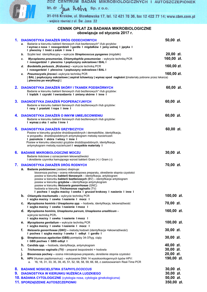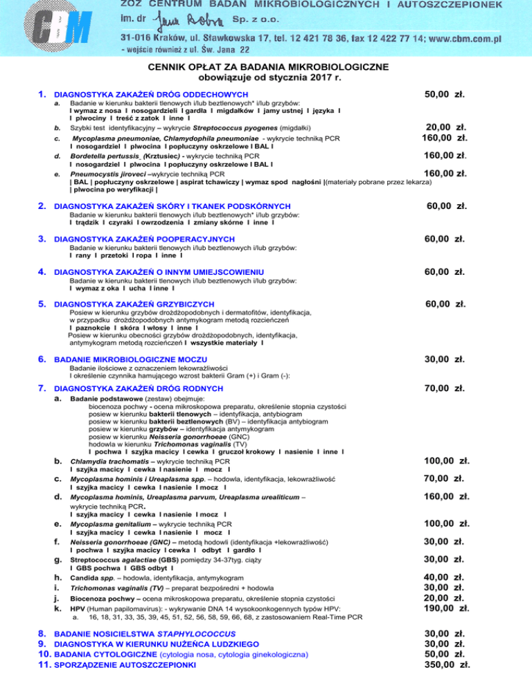CENNIK OPŁAT ZA BADANIA MIKROBIOLOGICZNE obowiązuje od stycznia 2017 r. 1. DIAGNOSTYKA ZAKAŻEŃ DRÓG ODDECHOWYCH a. b. c. d. e. Badanie w kierunku bakterii tlenowych i/lub beztlenowych* i/lub grzybów: I wymaz z nosa I nosogardzieli I gardła I migdałków I jamy ustnej I języka I I plwociny I treść z zatok I inne I Szybki test identyfikacyjny – wykrycie Streptococcus pyogenes (migdałki) 50,00 zł. 20,00 zł. 160,00 zł. Mycoplasma pneumoniae, Chlamydophila pneumoniae - wykrycie techniką PCR I nosogardziel I plwocina I popłuczyny oskrzelowe I BAL I Bordetella pertussis (Krztusiec) - wykrycie techniką PCR 160,00 I nosogardziel I plwocina I popłuczyny oskrzelowe I BAL I Pneumocystis jiroveci –wykrycie techniką PCR 160,00 | BAL | popłuczyny oskrzelowe | aspirat tchawiczy | wymaz spod nagłośni |(materiały pobrane przez lekarza) | plwocina po weryfikacji | 2. DIAGNOSTYKA ZAKAŻEŃ SKÓRY I TKANEK PODSKÓRNYCH zł. zł. 60,00 zł. Badanie w kierunku bakterii tlenowych i/lub beztlenowych* i/lub grzybów: I trądzik I czyraki I owrzodzenia I zmiany skórne I inne I 3. DIAGNOSTYKA ZAKAŻEŃ POOPERACYJNYCH 60,00 zł. Badanie w kierunku bakterii tlenowych i/lub beztlenowych i/lub grzybów: I rany I przetoki I ropa I inne I 4. DIAGNOSTYKA ZAKAŻEŃ O INNYM UMIEJSCOWIENIU 60,00 zł. Badanie w kierunku bakterii tlenowych i/lub beztlenowych i/lub grzybów: I wymaz z oka I ucha I inne I 5. DIAGNOSTYKA ZAKAŻEŃ GRZYBICZYCH 60,00 zł. Posiew w kierunku grzybów drożdżopodobnych i dermatofitów, identyfikacja, w przypadku drożdżopodobnych antymykogram metodą rozcieńczeń I paznokcie I skóra I włosy I inne I Posiew w kierunku obecności grzybów drożdżopodobnych, identyfikacja, antymykogram metodą rozcieńczeń I wszystkie materiały I 6. BADANIE MIKROBIOLOGICZNE MOCZU 30,00 zł. Badanie ilościowe z oznaczeniem lekowrażliwości I określenie czynnika hamującego wzrost bakterii Gram (+) i Gram (-): 7. DIAGNOSTYKA ZAKAŻEŃ DRÓG RODNYCH a. b. c. d. e. f. g. h. i. j. k. Badanie podstawowe (zestaw) obejmuje: biocenoza pochwy - ocena mikroskopowa preparatu, określenie stopnia czystości posiew w kierunku bakterii tlenowych – identyfikacja, antybiogram posiew w kierunku bakterii beztlenowych (BV) – identyfikacja antybiogram posiew w kierunku grzybów – identyfikacja antymykogram posiew w kierunku Neisseria gonorrhoeae (GNC) hodowla w kierunku Trichomonas vaginalis (TV) I pochwa I szyjka macicy I cewka I gruczoł krokowy I nasienie I inne I Chlamydia trachomatis – wykrycie techniką PCR I szyjka macicy I cewka I nasienie I mocz I Mycoplasma hominis i Ureaplasma spp. – hodowla, identyfikacja, lekowrażliwość I szyjka macicy I cewka I nasienie I mocz I Mycoplasma hominis, Ureaplasma parvum, Ureaplasma urealiticum – wykrycie techniką PCR. I szyjka macicy I cewka I nasienie I mocz I Mycoplasma genitalium – wykrycie techniką PCR I szyjka macicy I cewka I nasienie I mocz I Neisseria gonorrhoeae (GNC) – metodą hodowli (identyfikacja +lekowrażliwość) I pochwa I szyjka macicy I cewka I odbyt I gardło I Streptococcus agalactiae (GBS) pomiędzy 34-37tyg. ciąży I GBS pochwa I GBS odbyt I Candida spp. – hodowla, identyfikacja, antymykogram Trichomonas vaginalis (TV) – preparat bezpośredni + hodowla Biocenoza pochwy – ocena mikroskopowa preparatu, określenie stopnia czystości HPV (Human papilomavirus): - wykrywanie DNA 14 wysokoonkogennych typów HPV: a. 16, 18, 31, 33, 35, 39, 45, 51, 52, 56, 58, 59, 66, 68, z zastosowaniem Real-Time PCR 8. BADANIE NOSICIELSTWA STAPHYLOCOCCUS 9. DIAGNOSTYKA W KIERUNKU NUŻEŃCA LUDZKIEGO 10. BADANIA CYTOLOGICZNE (cytologia nosa, cytologia ginekologiczna) 11. SPORZĄDZENIE AUTOSZCZEPIONKI 70,00 zł. 100,00 zł. 70,00 zł. 160,00 zł. 100,00 zł. 30,00 zł. 30,00 zł. 40,00 zł. 30,00 zł. 20,00 zł. 190,00 zł. 30,00 zł. 30,00 zł. 50,00 zł. 350,00 zł.