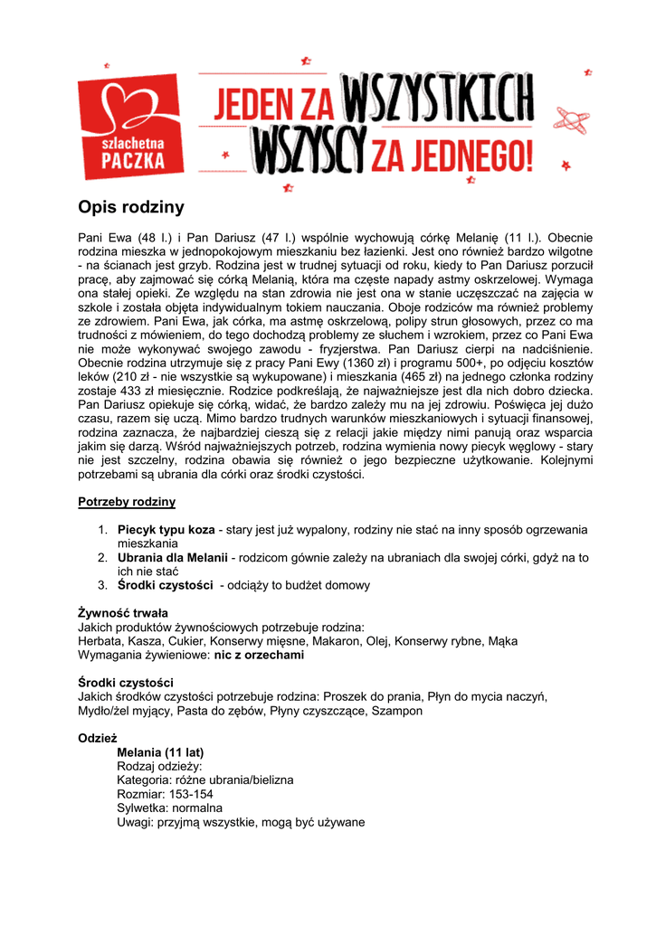 Opis rodziny Pani Ewa (48 l.) i Pan Dariusz (47 l.) wspólnie wychowują córkę Melanię (11 l.). Obecnie rodzina mieszka w jednopokojowym mieszkaniu bez łazienki. Jest ono również bardzo wilgotne - na ścianach jest grzyb. Rodzina jest w trudnej sytuacji od roku, kiedy to Pan Dariusz porzucił pracę, aby zajmować się córką Melanią, która ma częste napady astmy oskrzelowej. Wymaga ona stałej opieki. Ze względu na stan zdrowia nie jest ona w stanie uczęszczać na zajęcia w szkole i została objęta indywidualnym tokiem nauczania. Oboje rodziców ma również problemy ze zdrowiem. Pani Ewa, jak córka, ma astmę oskrzelową, polipy strun głosowych, przez co ma trudności z mówieniem, do tego dochodzą problemy ze słuchem i wzrokiem, przez co Pani Ewa nie może wykonywać swojego zawodu - fryzjerstwa. Pan Dariusz cierpi na nadciśnienie. Obecnie rodzina utrzymuje się z pracy Pani Ewy (1360 zł) i programu 500+, po odjęciu kosztów leków (210 zł - nie wszystkie są wykupowane) i mieszkania (465 zł) na jednego członka rodziny zostaje 433 zł miesięcznie. Rodzice podkreślają, że najważniejsze jest dla nich dobro dziecka. Pan Dariusz opiekuje się córką, widać, że bardzo zależy mu na jej zdrowiu. Poświęca jej dużo czasu, razem się uczą. Mimo bardzo trudnych warunków mieszkaniowych i sytuacji finansowej, rodzina zaznacza, że najbardziej cieszą się z relacji jakie między nimi panują oraz wsparcia jakim się darzą. Wśród najważniejszych potrzeb, rodzina wymienia nowy piecyk węglowy - stary nie jest szczelny, rodzina obawia się również o jego bezpieczne użytkowanie. Kolejnymi potrzebami są ubrania dla córki oraz środki czystości. Potrzeby rodziny 1. Piecyk typu koza - stary jest już wypalony, rodziny nie stać na inny sposób ogrzewania mieszkania 2. Ubrania dla Melanii - rodzicom gównie zależy na ubraniach dla swojej córki, gdyż na to ich nie stać 3. Środki czystości - odciąży to budżet domowy Żywność trwała Jakich produktów żywnościowych potrzebuje rodzina: Herbata, Kasza, Cukier, Konserwy mięsne, Makaron, Olej, Konserwy rybne, Mąka Wymagania żywieniowe: nic z orzechami Środki czystości Jakich środków czystości potrzebuje rodzina: Proszek do prania, Płyn do mycia naczyń, Mydło/żel myjący, Pasta do zębów, Płyny czyszczące, Szampon Odzież Melania (11 lat) Rodzaj odzieży: Kategoria: różne ubrania/bielizna Rozmiar: 153-154 Sylwetka: normalna Uwagi: przyjmą wszystkie, mogą być używane Odzież Ewa Rodzaj odzieży: Kategoria: różne ubrania/bielizna Rozmiar: 169 Sylwetka: puszysta Uwagi: przyjmą wszystkie, mogą być używane Obuwie Melania Rodzaj obuwia: zimowe Kategoria: kozaki Rozmiar: 35 Ewa Rodzaj obuwia: zimowe Kategoria: kozaki Rozmiar: 37 Ewa Rodzaj obuwia: przejściowe Kategoria: adidasy Rozmiar: 37 Pomoce szkolne Jakich pomocy szkolnych potrzebuje rodzina? - Zeszyty, Bloki Wyposażenie mieszkania Jakiego wyposażenia mieszkania potrzebuje rodzina: Koc Inne: zasłony jak ktoś ma na zbyciu Brakujące sprzęty: Piec węglowy typu koza, obecny jest już mocno wypalony (nie jest szczelny) Inne potrzeby Okulary dla Pani Ewy Specjalne upominki Dla Melanii deskorolka. dla p. Ewy i p. Dariusza kosmetyki